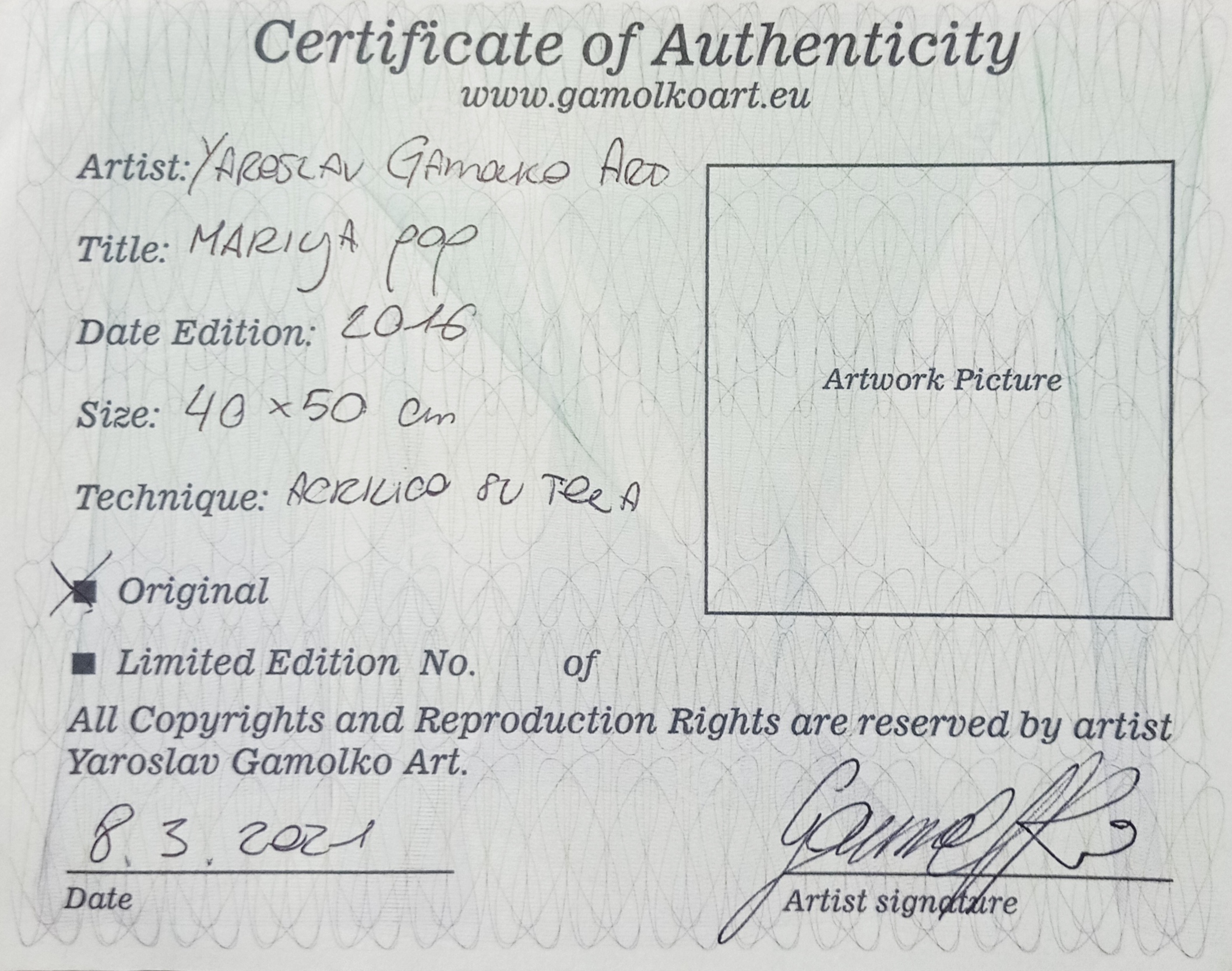 AUTHOR AUTHENTICATION, CERTIFICATE OF AUTHENTICITY, 2016, GAMOLKO