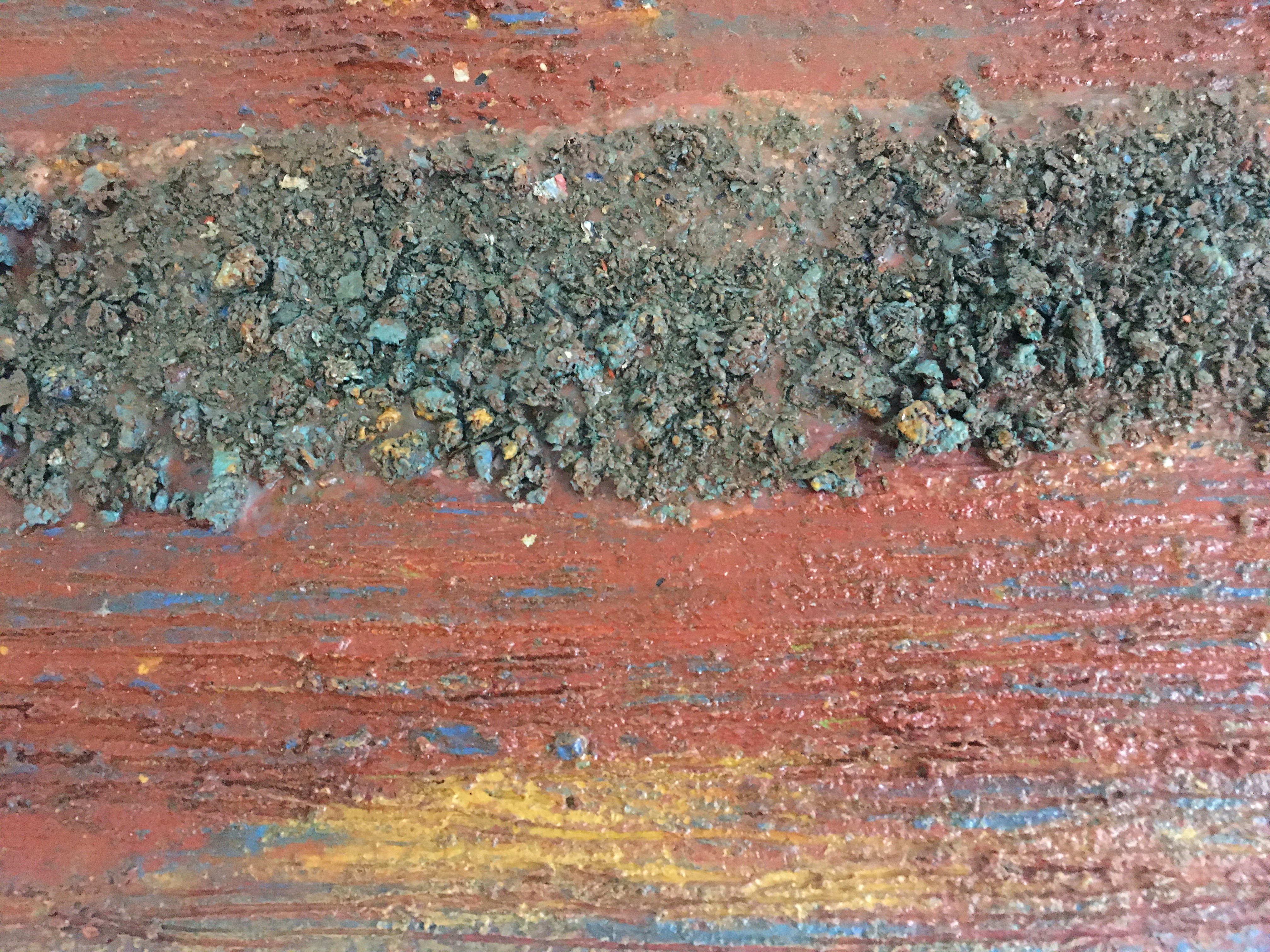 THE SIGN AND THE COLORS OF THE SURFACES OF THIS CANVAS ARE LIKE A TRAIL OF "BIOLOGICAL LIQUID" IN WHICH THE NEED TO TOUCH, BREATHE AND EXPERIENCE THE MNEMONIC TRACES OF THE GESTURE OF PAINTING IS TRANSMITTED. A DENSE AND LAYERED PLOT OF DISMANTLED BORDERS OF MONOCHROMATIC IDENTITIES IN WHICH TO INTERTWINE THE THREADS OF THE NARRATIVE OF THE WORLD WITH THE UNKNOWN AND HOPE.