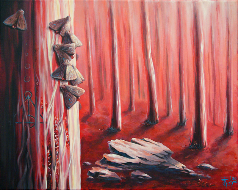 RED, FOREST, MAGIC ART, SYMBOLISM, TRISH, VISIONARY, ELENA MORGUN, ART THERAPY, MOTHS, BUTTERFLIES