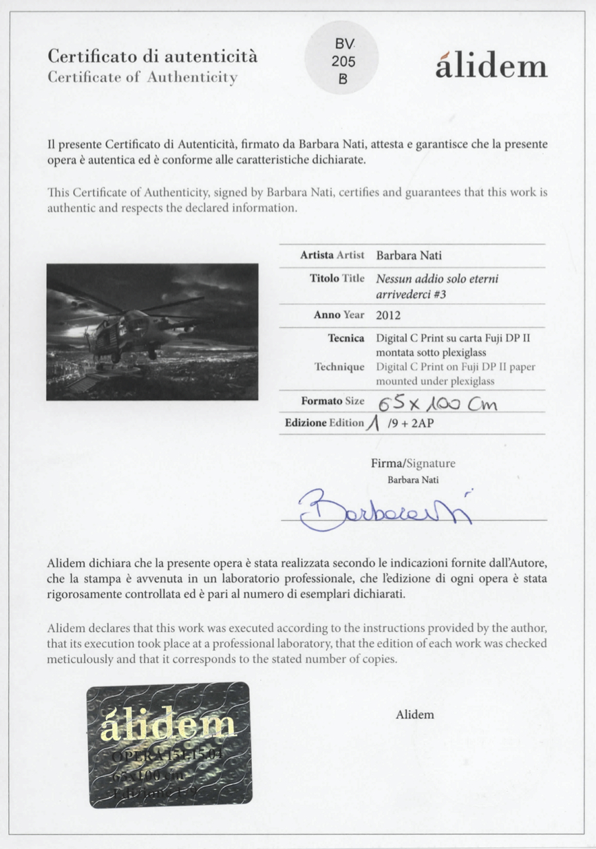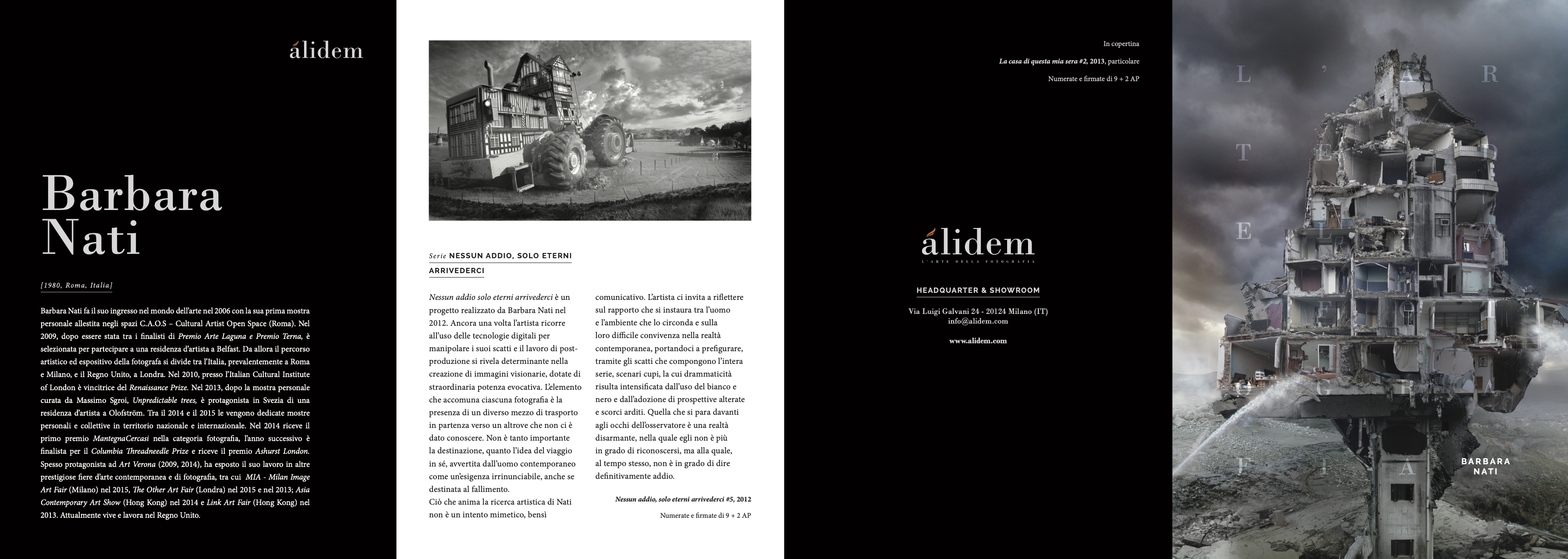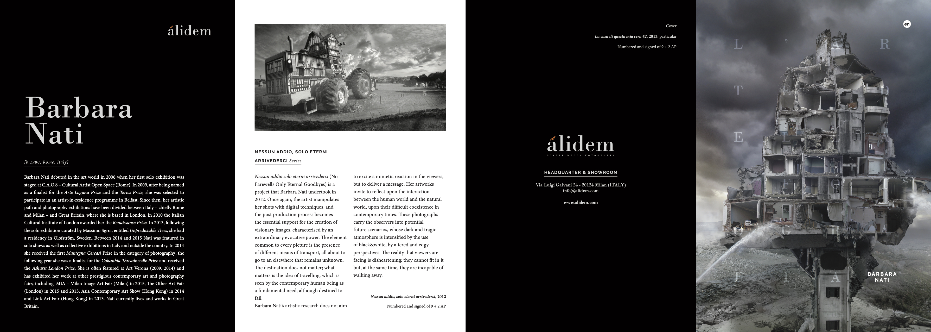 EN Barbara Nati debuted in the art world in 2006 when her first solo exhibition was staged at C.A.O.S – Cultural Artist Open Space (Rome). In 2009, after being named as a finalist for the Arte Laguna Prize and the Terna Prize, she was selected to participate in an artist-in-residence programme in Belfast. Since then, her artistic path and photography exhibitions have been divided between Italy – chiefly Rome and Milan – and Great Britain, where she is based in London. In 2010 the Italian Cultural Institute of London awarded her the Renaissance Prize. In 2013, following the solo exhibition curated by Massimo Sgroi, entitled Unpredictable Trees, she had a residency in Olofström, Sweden. Between 2014 and 2015 Nati was featured in solo shows as well as collective exhibitions in Italy and outside the country. In 2014 she received the first Mantegna Cercasi Prize in the category of photography; the following year she was a finalist for the Columbia Threadneedle Prize and received the Ashurst London Prize. She is often featured at Art Verona (2009, 2014) and has exhibited her work at other prestigious contemporary art and photography fairs, including MIA – Milan Image Art Fair (Milan) in 2015, The Other Art Fair (London) in 2015 and 2013, Asia Contemporary Art Show (Hong Kong) in 2014 and Link Art Fair (Hong Kong) in 2013. Nati currently lives and works in Great Britain. IT Barbara Nati fa il suo ingresso nel mondo dell’arte nel 2006 con la sua prima mostra personale allestita negli spazi C.A.O.S – Cultural Artist Open Space (Roma). Nel 2009, dopo essere stata tra i finalisti di Premio Arte Laguna e Premio Terna, è selezionata per partecipare a una residenza d’artista a Belfast. Da allora il percorso artistico ed espositivo della fotografa si divide tra l’Italia, prevalentemente a Roma e Milano, e il Regno Unito, a Londra. Nel 2010, presso l’Italian Cultural Institute of London è vincitrice del Renaissance Prize. Nel 2013, dopo la mostra personale curata da Massimo Sgroi, Unpredictable trees, è protagonista in Svezia di una residenza d’artista a Olofström. Tra il 2014 e il 2015 le vengono dedicate mostre personali e collettive in territorio nazionale e internazionale. Nel 2014 riceve il primo premio MantegnaCercasi nella categoria fotografia, l’anno successivo è finalista per il Columbia Threadneedle Prize e riceve il premio Ashurst London. Spesso protagonista ad Art Verona (2009, 2014), ha esposto il suo lavoro in altre prestigiose fiere d’arte contemporanea e di fotografia, tra cui MIA - Milan Image Art Fair (Milano) nel 2015, The Other Art Fair (Londra) nel 2015 e nel 2013; Asia Contemporary Art Show (Hong Kong) nel 2014 e Link Art Fair (Hong Kong) nel 2013. Attualmente vive e lavora nel Regno Unito.
