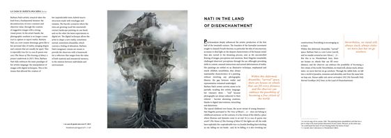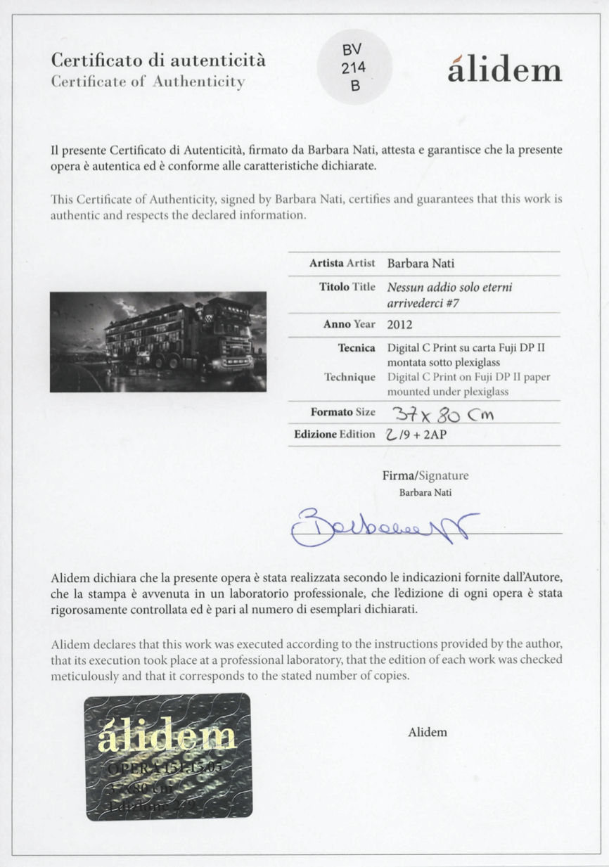 EN Barbara Nati debuted in the art world in 2006 when her first solo exhibition was staged at C.A.O.S – Cultural Artist Open Space (Rome). In 2009, after being named as a finalist for the Arte Laguna Prize and the Terna Prize, she was selected to participate in an artist-in-residence programme in Belfast. Since then, her artistic path and photography exhibitions have been divided between Italy – chiefly Rome and Milan – and Great Britain, where she is based in London. In 2010 the Italian Cultural Institute of London awarded her the Renaissance Prize. In 2013, following the solo exhibition curated by Massimo Sgroi, entitled Unpredictable Trees, she had a residency in Olofström, Sweden. Between 2014 and 2015 Nati was featured in solo shows as well as collective exhibitions in Italy and outside the country. In 2014 she received the first Mantegna Cercasi Prize in the category of photography; the following year she was a finalist for the Columbia Threadneedle Prize and received the Ashurst London Prize. She is often featured at Art Verona (2009, 2014) and has exhibited her work at other prestigious contemporary art and photography fairs, including MIA – Milan Image Art Fair (Milan) in 2015, The Other Art Fair (London) in 2015 and 2013, Asia Contemporary Art Show (Hong Kong) in 2014 and Link Art Fair (Hong Kong) in 2013. Nati currently lives and works in Great Britain. IT Barbara Nati fa il suo ingresso nel mondo dell’arte nel 2006 con la sua prima mostra personale allestita negli spazi C.A.O.S – Cultural Artist Open Space (Roma). Nel 2009, dopo essere stata tra i finalisti di Premio Arte Laguna e Premio Terna, è selezionata per partecipare a una residenza d’artista a Belfast. Da allora il percorso artistico ed espositivo della fotografa si divide tra l’Italia, prevalentemente a Roma e Milano, e il Regno Unito, a Londra. Nel 2010, presso l’Italian Cultural Institute of London è vincitrice del Renaissance Prize. Nel 2013, dopo la mostra personale curata da Massimo Sgroi, Unpredictable trees, è protagonista in Svezia di una residenza d’artista a Olofström. Tra il 2014 e il 2015 le vengono dedicate mostre personali e collettive in territorio nazionale e internazionale. Nel 2014 riceve il primo premio MantegnaCercasi nella categoria fotografia, l’anno successivo è finalista per il Columbia Threadneedle Prize e riceve il premio Ashurst London. Spesso protagonista ad Art Verona (2009, 2014), ha esposto il suo lavoro in altre prestigiose fiere d’arte contemporanea e di fotografia, tra cui MIA - Milan Image Art Fair (Milano) nel 2015, The Other Art Fair (Londra) nel 2015 e nel 2013; Asia Contemporary Art Show (Hong Kong) nel 2014 e Link Art Fair (Hong Kong) nel 2013. Attualmente vive e lavora nel Regno Unito.