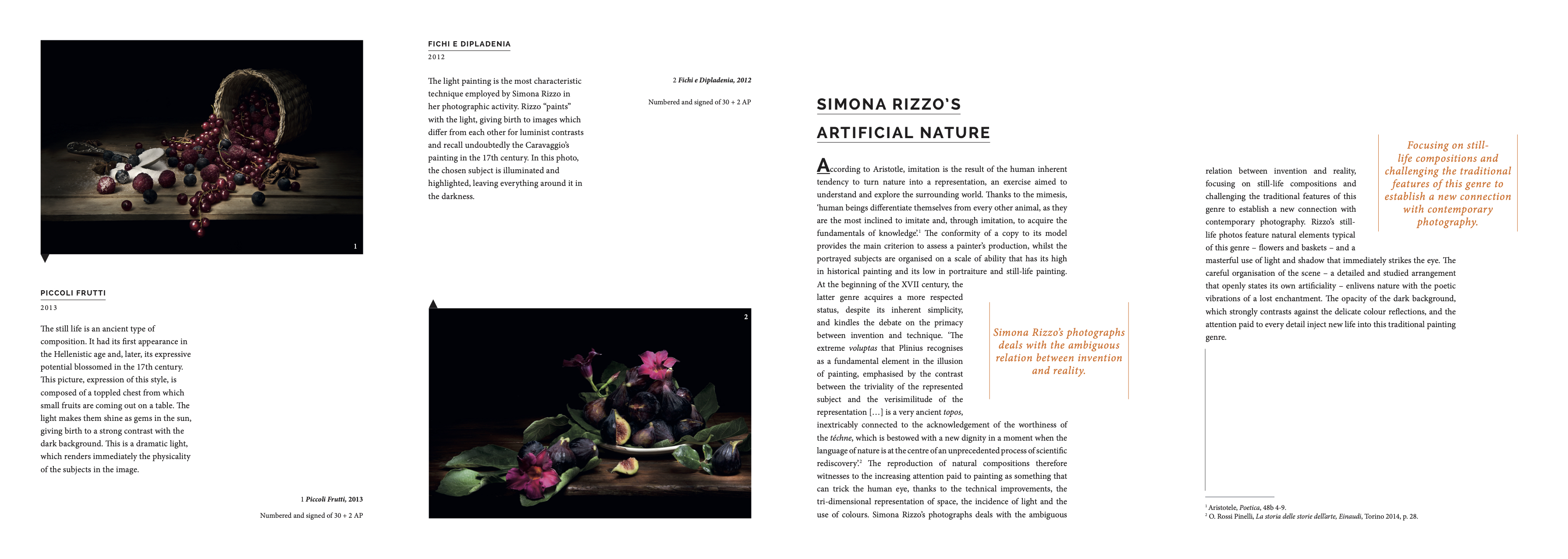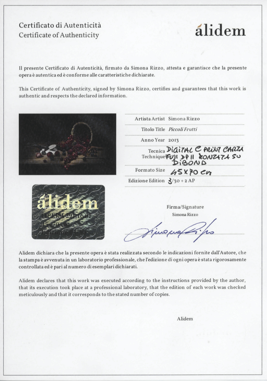 EN Simona Rizzo has become keen on photography as a hobby, when she was seven years old and her aunt gave her a second-hand camera as present. But her path took an unexpected turn and growing up she decided to dedicate herself to the study of the Classics. At the age of eighteen she enrolled in the faculty of Architecture at the Polytechnic University in Turin and, just before graduating, she got married and had two children. Their birth started a new period for the artist: from then on photography became her job. She studied as an autodidact, and then she attended many specialization courses organized by important figures in the artistic world, such as Ludovico Fossà and Francesco Ferla. As time went by she developed a great interest for a particular photographic technique, the light painting. It consists in illuminating the subject with a source of light as if it were a paintbrush, playing on chiaroscuro, the contrast between light and non-light. The subjects of the photos are still lives, result of studies conducted by the artist on some painters of the 17th century for a particular type of composition and organization of space. Still lives are characterized by a projection on a black background which exalts the objects in the foreground, while the space is organized on the basis of the golden ratio. Simona Rizzo’s unique style did not remain unnoticed for long, as the numerous publications of her artworks on the magazine Foto Cult demonstrates, some of which are kept in private collections. IT Simona Rizzo si appassiona alla fotografia per gioco, quando a sette anni una zia le regala una macchina fotografica di seconda mano. Ma il suo percorso prende una direzione inaspettata e crescendo decide di concentrarsi sugli studi classici. A diciott’anni decide di frequentare la facoltà di Architettura del Politecnico di Torino, e poco prima si laurearsi si sposa e ha due bambini. La loro nascita rappresenta un nuovo periodo per l’artista: da questo momento la fotografia diventa il suo mestiere. Studia da autodidatta, per poi seguire numerosi corsi di specializzazione tenuti da grandi nomi del mondo artistico, come Ludovico Fossà e Francesco Ferla. Con il tempo sviluppa grande interesse per una particolare tecnica fotografica, il light painting: consiste nell’investire di luce il soggetto con una sorgente luminosa proprio come se fosse un pennello, giocando sul chiaroscuro, sul contrasto di luce e non-luce. I soggetti scattati sono nature morte, risultato di studi effettuati dall’artista su alcuni pittori del XVII secolo per il particolare tipo di composizione e l’organizzazione dello spazio: le nature morte sono caratterizzate dalla proiezione su sfondo nero che esalta gli elementi in primo piano, mentre lo spazio è organizzato secondo le regole delle proporzioni auree. Lo stile unico di Simona Rizzo non è rimasto inosservato per molto, come dimostrano le numerose pubblicazioni di alcune sue opere sulla rivista Foto Cult, al momento alcune sono presenti in collezioni private.