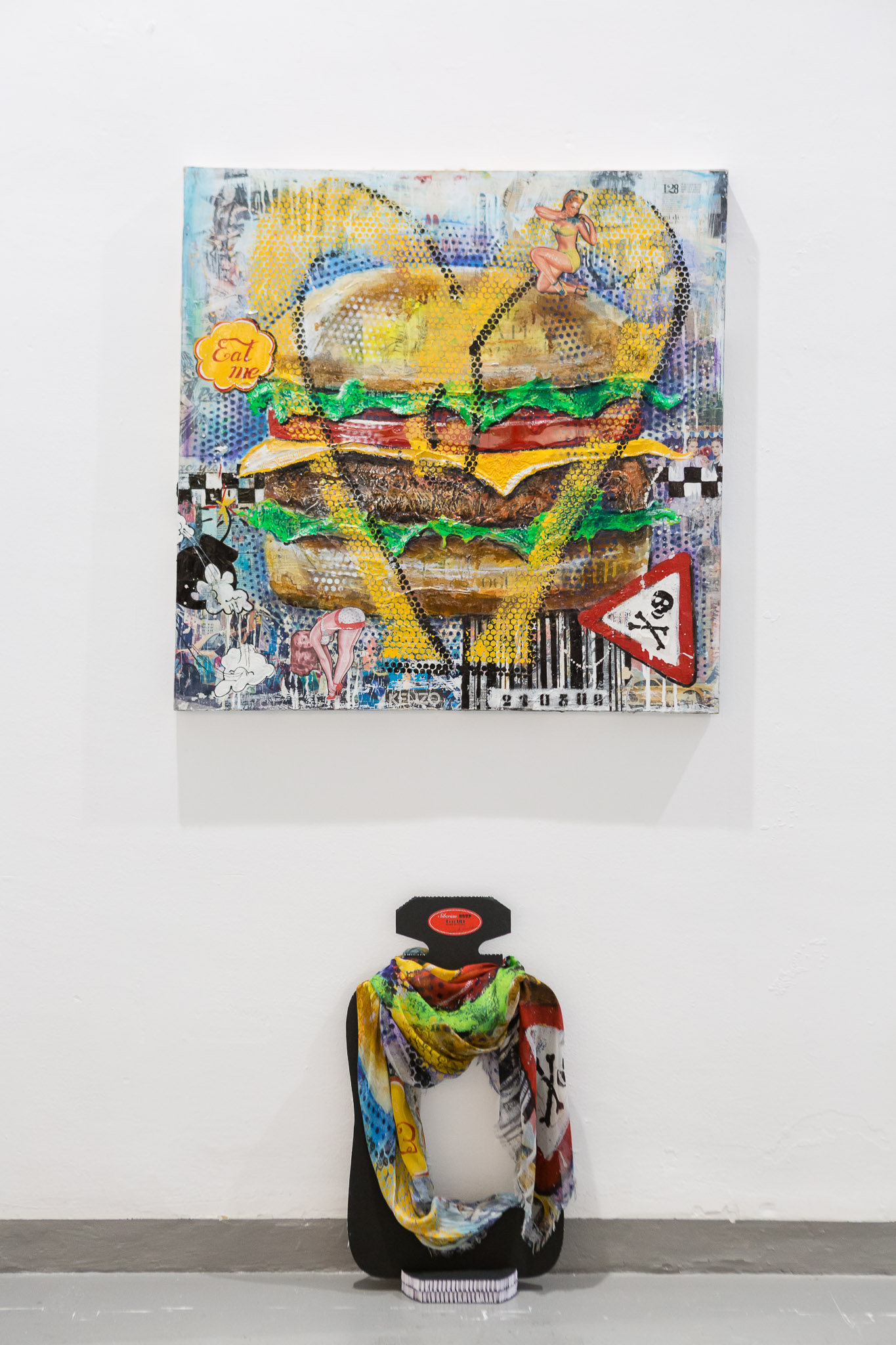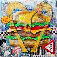 NEL 2015, IN OCCASIONE DI EXPO ED ISPIRATA DAL TEMA, L'ARTISTA SI È DEDICATA AD UNA SERIE INTERAMENTE RIVOLTA AL CIBO, CHE SI RIVELA TUTT'OGGI UNA DELLE PIÙ POP MAI REALIZZATE; IL TEMA DELL'ALIMENTAZIONE, ATTUALISSIMO, ESPLORA ED ANALIZZA IRONICAMENTE IL TREND DEL CONSUMO ODIERNO, ANCHE ATTRAVERSO DEI CHIARI RICHIAMI ALLA CRISI IN CUI VERSANO ALCUNI PAESI DEL MONDO. DIETRO LA COMUNQUE EVIDENTE VIVACITÀ DEI COLORI, L'OBIETTIVO DI QUESTE OPERE È STIMOLARE LA RIFLESSIONE DELLO SPETTATORE, GUIDANDOLO VERSO UNA MAGGIORE CONSAPEVOLEZZA. OGNUNA DELLE SEI OPERE DELLA SERIE PRESENTA UNA SUA FORTE PERSONALITÀ, CONFERITALE DALL’ARTISTA SIBERIANA ATTRAVERSO CONIUGANDO LA TECNICA DEL COLLAGE CON UN MAESTOSO LAVORO DI DETTAGLI REALIZZATI A MANO IN RESINA, ACRILICO E SMALTO: L'IMPATTO VISIVO RISULTA PER QUESTO MATERICO E TRIDIMENSIONALE, D'ISPIRAZIONE QUASI TATTILE. POP BURGER, OPERA D'ARTE 100X100CM DI LUDMILLA RADCHENKO REALIZZATA NEL 2015, SERIE "POP FOOD", TECNICA COLLAGE, ACRILICO E RESINA SU TELA. “POP BURGER” È DOMINATO DA UN PANINO FORMATO MAXI, TIPICO HAMBURGER DA FAST-FOOD COME QUELLI DI MCDONALD’S, CHE QUI È ANCHE RICHIAMATO CON UNA “M” ARROTONDATA E MOLTO POP SOVRIMPRESSA SUL PANINO STESSO, IL QUALE RAPPRESENTA LA CONCEZIONE MODERNA DI CIBO VELOCE “MORDI E FUGGI”. IL MARCHIETTO LATERALE “EAT ME”, “MANGIAMI”, RAPPRESENTA DA UN LATO LA TENTAZIONE DELLA GOLA E DALL’ALTRO L’ASPETTO CONSUMISTICO DI QUESTO TREND CHE ORMAI È ABITUDINE PER LA MAGGIOR PARTE DELLA GENTE, E CHE PUÒ DIVENTARE DAVVERO NOCIVO SE NON REGOLATO IN QUALCHE MODO: ECCO IL PERCHÉ DEL CARTELLO DI PERICOLO COL SIMBOLO DEL VELENO CHE CHIUDE L’OPERA IN BASSO A DESTRA. IN 2015, ON THE OCCASION OF EXPO AND INSPIRED BY THE THEME, THE ARTIST DEVOTED HERSELF TO A SERIES ENTIRELY DEVOTED TO FOOD, WHICH IS STILL ONE OF THE MOST POP EVER MADE TODAY; THE THEME OF FOOD, VERY TOPICAL, IRONICALLY EXPLORES AND ANALYZES THE TREND OF CONSUMPTION TODAY, ALSO THROUGH CLEAR REFERENCES TO THE CRISIS FACING SOME COUNTRIES OF THE WORLD. BEHIND THE EVIDENT VIVACITY OF THE COLORS, HOWEVER, THE GOAL OF THESE ARTWORKS IS TO STIMULATE THE VIEWER'S REFLECTION, GUIDING HIM TOWARDS GREATER AWARENESS. EACH OF THE SIX WORKS IN THE SERIES HAS ITS OWN STRONG PERSONALITY, CONFERRED BY THE SIBERIAN ARTIST THROUGH COMBINING THE COLLAGE TECHNIQUE WITH A MAJESTIC WORK OF HAND-MADE DETAILS IN RESIN, ACRYLIC AND ENAMEL: THE VISUAL IMPACT IS FOR THIS MATERIAL AND THREE-DIMENSIONAL, ALMOST TACTILE INSPIRATION. POP BURGER, 100X100CM ARTWORK BY LUDMILLA RADCHENKO MADE IN 2015, "POP FOOD" SERIES, COLLAGE TECHNIQUE, ACRYLIC AND RESIN ON CANVAS. "POP BURGER" IS DOMINATED BY A MAXI-SIZED SANDWICH, A TYPICAL FAST-FOOD HAMBURGER LIKE MCDONALD'S, WHICH IS ALSO REFERRED HERE WITH A ROUNDED AND VERY POP "M" SUPERIMPOSED ON THE SANDWICH ITSELF, WHICH REPRESENTS THE MODERN CONCEPT OF FOOD FAST "HIT AND RUN". THE SIDE MARK "EAT ME", REPRESENTS ON THE ONE HAND THE TEMPTATION OF THE GLUTTONY AND ON THE OTHER THE CONSUMERIST ASPECT OF THIS TREND WHICH IS NOW A HABIT FOR MOST PEOPLE, AND WHICH CAN BECOME REALLY HARMFUL IF NOT REGULATED IN SOME WAY: THIS IS THE REASON FOR THE DANGER SIGN WITH THE POISON SYMBOL THAT CLOSES THE WORK AT THE BOTTOM RIGHT.