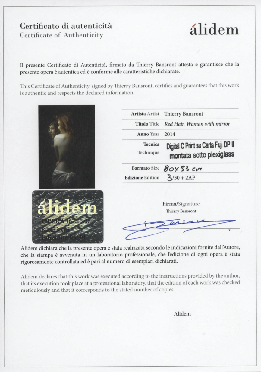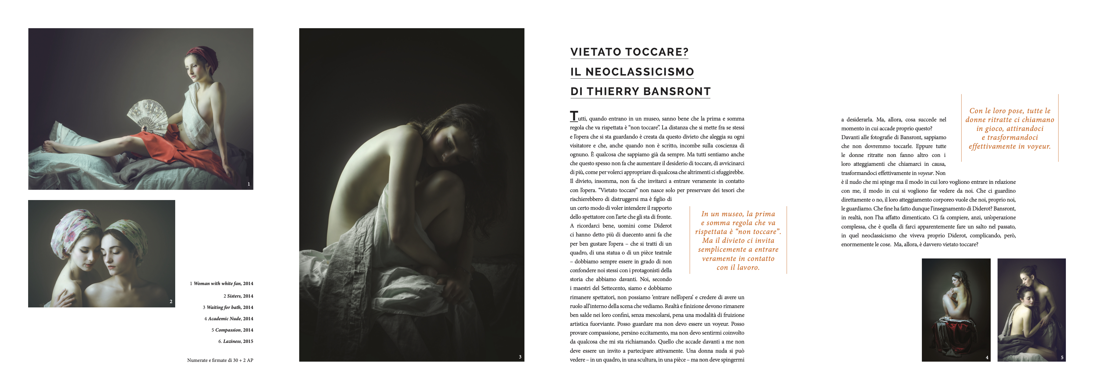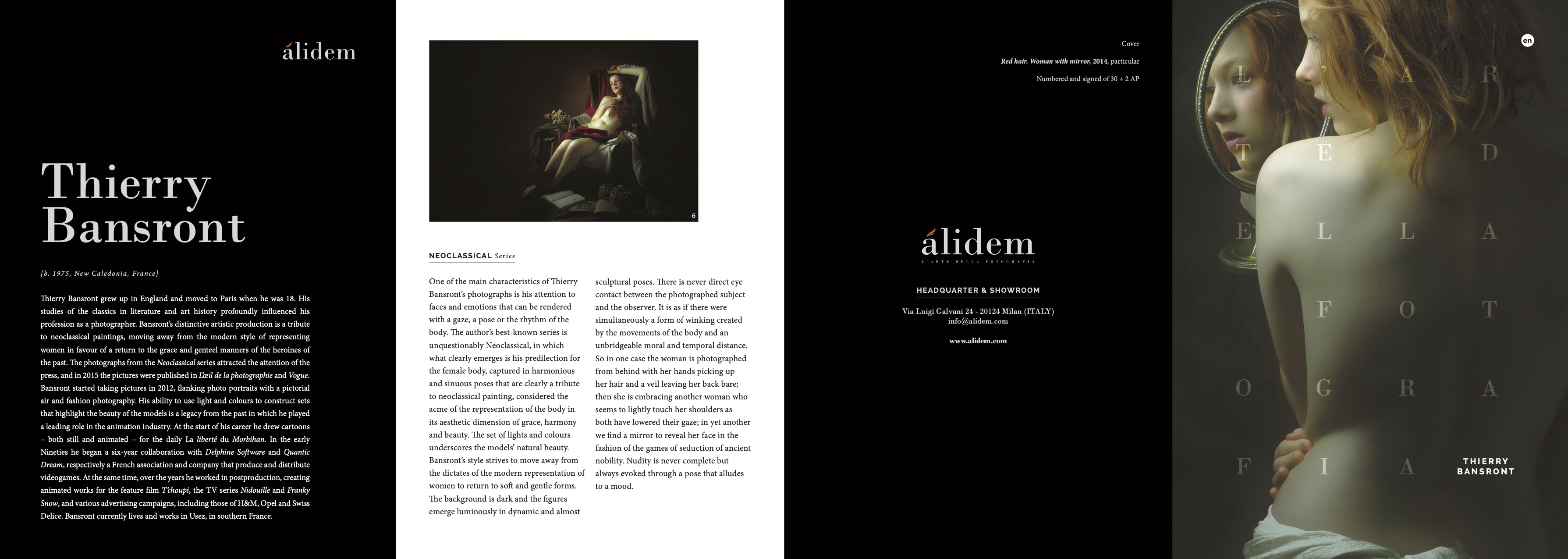 EN Thierry Bansront grew up in England and moved to Paris when he was 18. His studies of the classics in literature and art history profoundly influenced his profession as a photographer. Bansront’s distinctive artistic production is a tribute to neoclassical paintings, moving away from the modern style of representing women in favour of a return to the grace and genteel manners of the heroines of the past. The photographs from the Neoclassical series attracted the attention of the press, and in 2015 the pictures were published in L’œil de la photographie and Vogue. Bansront started taking pictures in 2012, flanking photo portraits with a pictorial air and fashion photography. His ability to use light and colours to construct sets that highlight the beauty of the models is a legacy from the past in which he played a leading role in the animation industry. At the start of his career he drew cartoons – both still and animated – for the daily La liberté du Morbihan. In the early Nineties he began a six-year collaboration with Delphine Software and Quantic Dream, respectively a French association and company that produce and distribute videogames. At the same time, over the years he worked in postproduction, creating animated works for the feature film T’choupi, the TV series Nidouille and Franky Snow, and various advertising campaigns, including those of H&M, Opel and Swiss Delice. Bansront currently lives and works in Usez, in southern France. IT Thierry Bansront cresce in Inghilterra e all’età di diciotto anni si trasferisce a Parigi. Gli studi classici in letteratura e storia dell’arte influenzano profondamente la sua professione di fotografo. La produzione artistica distintiva è un elogio ai dipinti dell’arte neoclassica, che si allontana dal moderno stile di rappresentazione della donna in favore di un ritorno alla grazia e alla gentilezza delle eroine del passato. Le fotografie della serie Neoclassical attirano l’attenzione della stampa: nel 2015 gli scatti compaiono su L’ œil de la photographie e Vogue. Thierry Bansront inizia a fotografare nel 2012, affiancando ai ritratti fotografici dal retrogusto pittorico la fotografia di moda. La capacità di utilizzare luci e colori per costruire set che mettano in risalto la bellezza dei modelli è eredità di un passato che lo ha visto protagonista nel settore dell’animazione. Agli inizi della sua carriera è stato disegnatore di cartoni e vignette animate per il quotidiano La liberté du Morbihan. Nei primi anni Novanta, ha avviato una collaborazione sessennale con Delphine Software e Quantic Dream, rispettivamente una società e un’azienda francesi, produttrici e distributrici di videogiochi. Parallelamente, nel corso degli anni, ha lavorato nel campo della post produzione creando animazioni per il lungometraggio T’choupi, per le serie TV Nidouille e Franky Snow e per numerose pubblicità, tra cui H&M, Opel e Swiss Delice. Nel 2016 compare un articolo a lui dedicato sulla rivista The Lifestyle Journal. Attualmente Thierry Bansront vive e lavora a Uzès, nel sud della Francia.