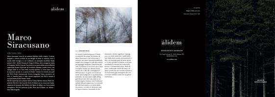 EN Marco Siracusano grow up in a real artistic and creative family. His grandfather was a famous photographer and he belonged to a family rooted in art. Thanks to his precious advises, Siracusano started to explore the visual world with a special sensitivity. He attended IED, Istituto Europeo di Design di Milano, and he gratuated in Photography. In 2013, during the collective exhibition called R-evolution (Barletta, Castello Svevo), he exhibited his work and he won as best participant. Then, during Studio Contest, R-evolution, he received a special mention by the FIOF (Fondo Internazionale Orvieto Fotografia). One year later, in 2014 on the occasion of the Video Awards by FIOF, he was placed third and he also obtained the prestigious Best Student Award. In 2015 he took part in the R-evolution Festival (Latina, Barletta, Salerno, Porto Empedocle). In 2016 his artworks were shown in the exhibitons La conoscenza è partecipazione and Conversazioni Immaginarie, at the Casa dei Diritti of Milano and Fabbrica del Vapore respectively. In 2017 he took part in the MIA Photo Fair in Milan in collaboration with Alidem- the art of photography. IT Marco Siracusano cresce in un ambiente familiare molto creativo. Il nonno, fotografo e colonna portante di una famiglia di artisti, lo indirizza verso il mondo delle immagini, in cui si addentra con esemplare sensibilità. Studia presso lo IED – Istituto Europeo di Design di Milano, dove consegue la Laurea in Fotografia. Nel 2013 espone il suo lavoro in occasione della mostra collettiva organizzata durante le giornate di R-evolution (Barletta, Castello Svevo), una rassegna d’arte in cui viene eletto vincitore assoluto. Lo stesso anno riceve la menzione speciale in occasione di Studio Contest, R-evolution, da parte del FIOF (Fondo Internazionale Orvieto Fotografia). L’anno successivo, nel 2014, si classifica terzo al Video Awards organizzato dal FIOF e ottiene il riconoscimento di Best Student Award. Nel 2015 partecipa al R-evolution Festival (Latina, Barletta, Salerno, Porto Em- pedocle). Nel 2016 è alla Casa dei Diritti di Milano con La conoscenza è parte- cipazione ed è presente alla Fabbrica del Vapore di Milano con Conversazioni Immaginarie. Nel 2017 partecipa al MIA Photo Fair di Milano con Alidem – l’arte della fotografia.