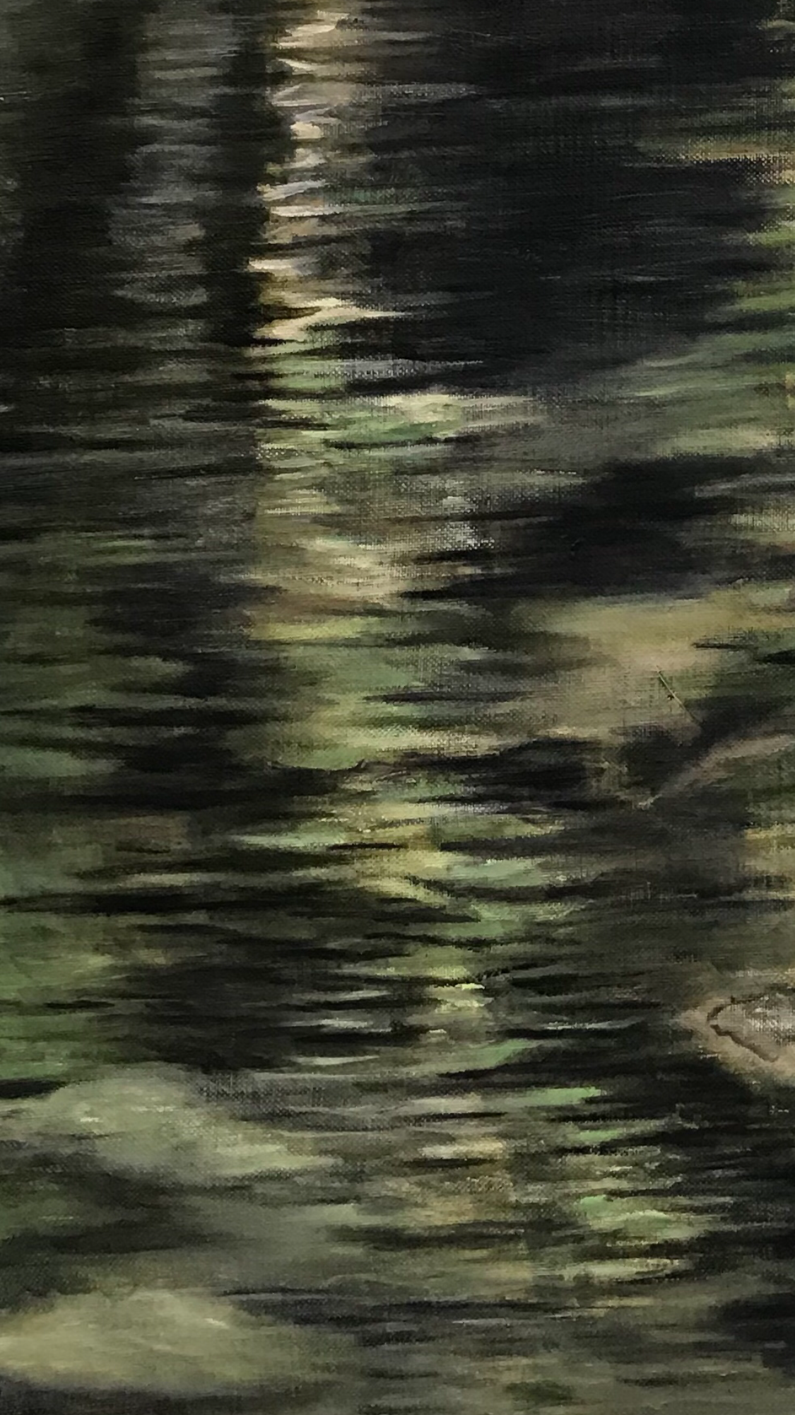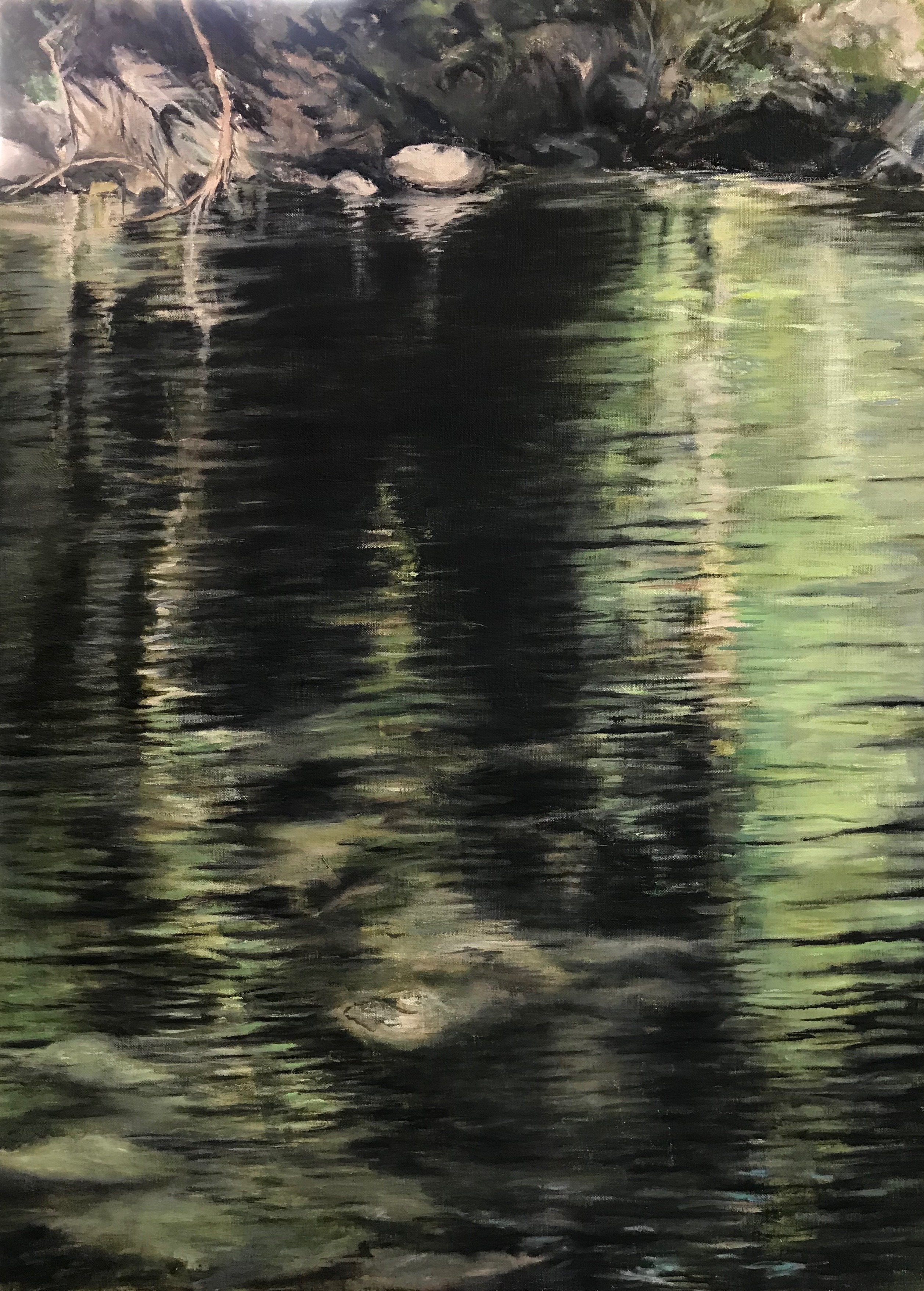 TONALITATS DE VERDS, OCRES I NEGRE VAN DEFININT ELS DIFERENTS NIVELLS I DISTÀNCIES DEL QUE ES REFLEXA EN L’AIGUA.