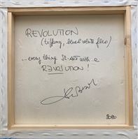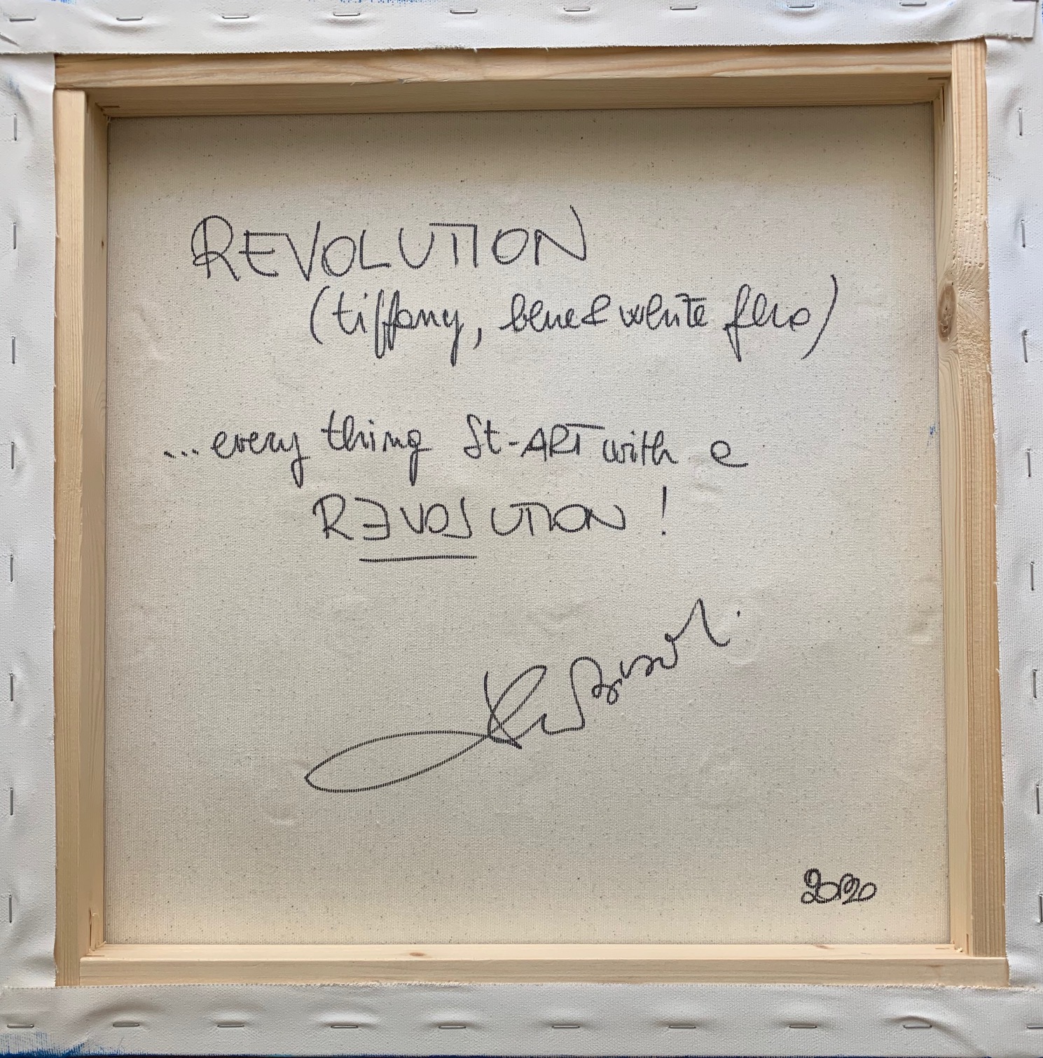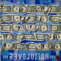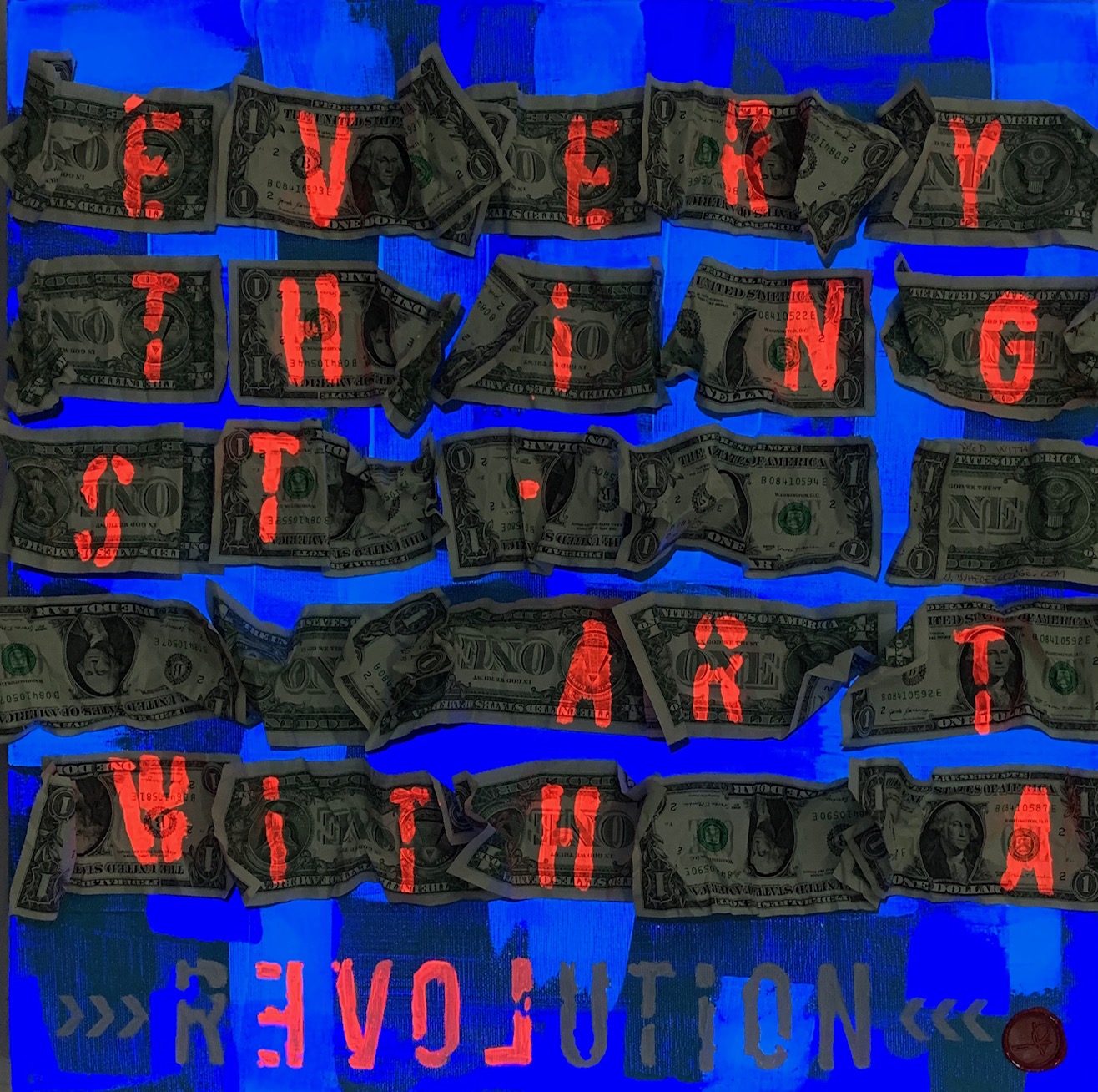 REVOLUTION COLLECTION MATERIAL TECHNIQUE, ACRYLIC TIFFANY-BLUE&WHITE FLUO COLOR ON CANVAS WITH US $ 1 BILLS APPLICATION. AMERICAN DOLLARS HAVE BECOME - IN THE WESTERN WORLD - THE SYMBOLS OF DREAMS, OF UNION, OF PERSONAL AND INDIVIDUAL FREEDOM, OF HOPES, OF RESEARCH AND OF "REVOLUTION". THE INTRINSIC MEANING OF THE WORD REVOLUTION IS: LOVE! TO BE ABLE TO SEE IT YOU NEED TO BELIEVE IT OR SIMPLY ILLUMINATE THE ARTWORK WITH THE WOOD LIGHT; MAGICALLY THE WORD LOVE WILL APPEAR! WRITING IS CARRIED THE OUT IN TRANSPARENT AND PHOTOSENSITIVE COLOR. IT IS NECESSARY TO ILLUMINATE THE ARTWORK WITH WOOD LIGHT AND THE WORDS THAT WILL MAKE THE ARTWORK UNIQUE AND MAGICAL WILL APPEAR. THESE WORKS HIDE A SECRET, A BILL IS MARKED ON THE SITE WWW.WHERESGEORGE.COM IN ORDER TO SEE THE WORK TRAVEL THROUGH GALLERIES AND MUSEUMS AROUND THE WORLD. REVOLUTION COLLECTION TECNICA MATERICA, COLORE ACRILICO TIFFANY, BUE&BIANCO FLUO SU TELA CON APPLICAZIONE DI BANCONOTE AMERICANE 1$. I DOLLARI AMERICANI SONO DIVENTATI - NEL MONDO OCCIDENTALE - I SIMBOLI DEI SOGNI, DELL'UNIONE, DELLA LIBERTÀ PERSONALE E INDIVIDUALE, DELLE SPERANZE, DELLA RICERCA E DELLA "REVOLUTION". IL SIGNIFICATO INTRINSECO DELLA PAROLA REVOLUTION È : LOVE! PER POTERLO VEDERE È NECESSARIO CREDERCI O SEMPLICEMENTE ACCENDERE LA LUCE WOOD; MAGICAMENTE APPARIRÀ LA PAROLA LOVE ! LE SCRITTE SONO STATE ESEGUITE CON COLORE TRASPARENTE E FOTOSENSIBILE. E’ NECESSARIO ILLUMINARE IL QUADRO CON LA LUCE WOOD E APPARIRA’ LA SCRITTA CHE RENDERA’ L’OPERA UNICA E MAGICA. QUESTE OPERE NASCONDONO UN ALTRO SEGRETO, UNA BANCONOTA È STATA TRACCIATA SUL SITO WWW.WHERESGEORGE.COM PER SEGUIRE IL VIAGGIO DELL'OPERA E I SUOI SPOSTAMENTI ATTRAVERSO GALLERIE E MUSEI DI TUTTO IL MONDO