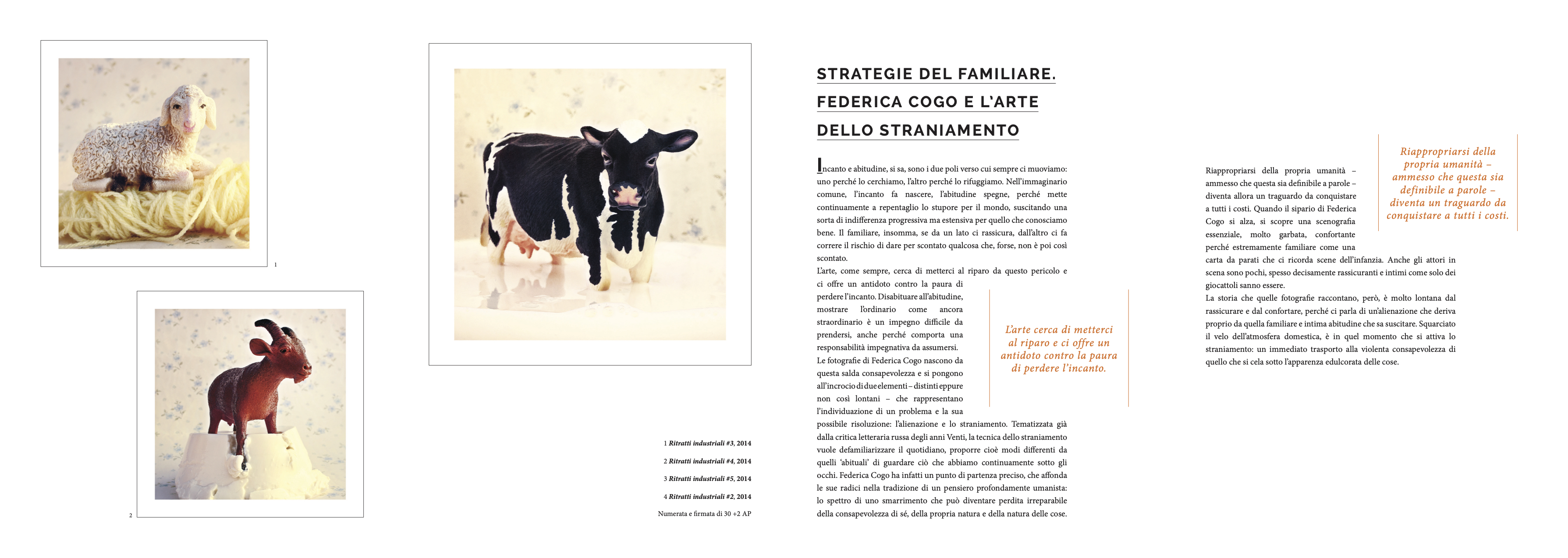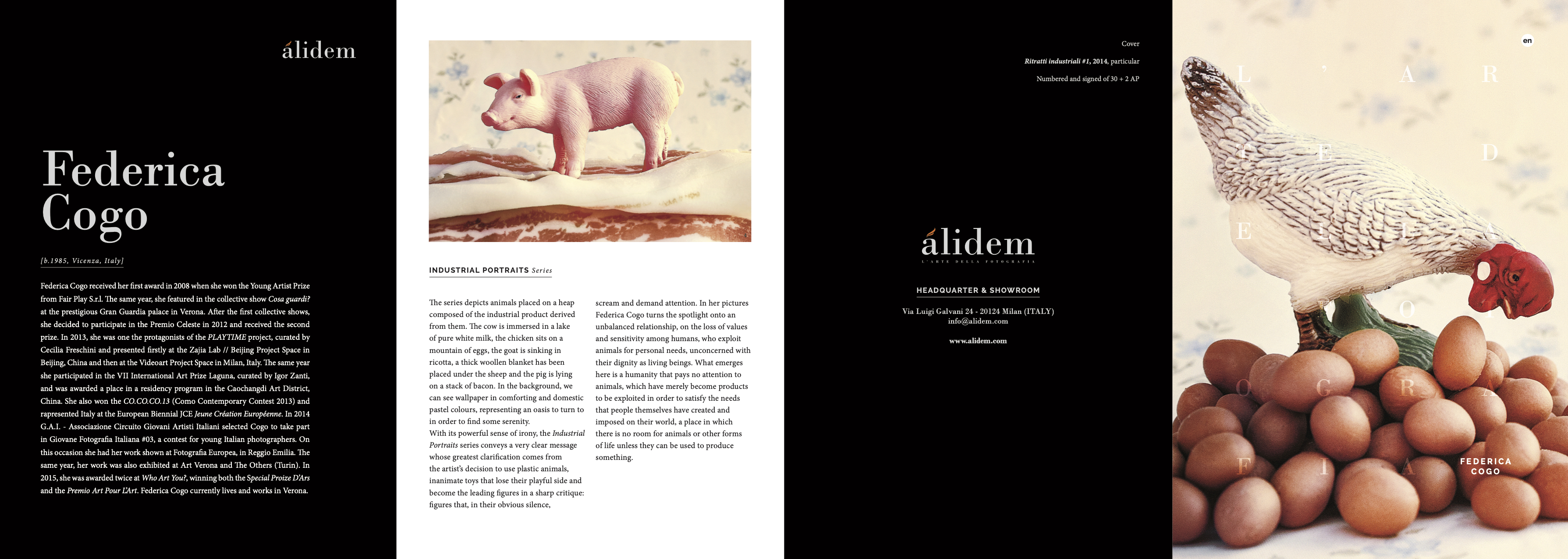 EN Federica Cogo received her first award in 2008 when she won the Young Artist Prize from Fair Play S.r.l. The same year, she featured in the collective show Cosa guardi? at the prestigious Gran Guardia palace in Verona. After the first collective shows, she decided to participate in the Premio Celeste in 2012 and received the second prize. In 2013, she was one the protagonists of the PLAYTIME project, curated by Cecilia Freschini and presented firstly at the Zajia Lab // Beijing Project Space in Beijing, China and then at the Videoart Project Space in Milan, Italy. The same year she participated in the VII International Art Prize Laguna, curated by Igor Zanti, and was awarded a place in a residency program in the Caochangdi Art District, China. She also won the CO.CO.CO.13 (Como Contemporary Contest 2013) and rapresented Italy at the European Biennial JCE Jeune Création Européenne. In 2014 G.A.I. - Associazione Circuito Giovani Artisti Italiani selected Cogo to take part in Giovane Fotografia Italiana #03, a contest for young Italian photographers. On this occasion she had her work shown at Fotografia Europea, in Reggio Emilia. The same year, her work was also exhibited at Art Verona and The Others (Turin). In 2015, she was awarded twice at Who Art You?, winning both the Special Proize D’Ars and the Premio Art Pour L’Art. Federica Cogo currently lives and works in Verona. IT Federica Cogo ottiene il suo primo riconoscimento nel 2008, quando vince il Young Artist Prize, a cura di Fair Play S.r.l. Lo stesso anno è chiamata a partecipare alla mostra collettiva Cosa guardi?, ospitata all’interno del prestigioso palazzo della Gran Guardia di Verona. Dopo le prime mostre collettive, decide di partecipare ed esporre al Premio Celeste (2012), dove si classifica seconda. Nel 2013 è tra i protagonisti del progetto PLAYTIME, curato da Cecilia Freschini e presentato prima a Pechino, presso Zajia Lab // Beijing Project Space, e poi a Milano (Videoart Project Space). Lo stesso anno partecipa al VII International Art Prize Laguna, a cura di Igor Zanti, dove vince una residenza d’artista presso Lab_Yit in Cina. Il soggiorno in Cina è occasione di una mostra presso il presso Caochangdi Art District (Pechino). Vincitrice del CO.CO.CO.13 (Como Contemporary Contest 2013), è chiamata a rappresentare la sezione italiana all’interno della Biennale Europea JCE Jeune Création Européenne. Nel 2014 è selezionata da G.A.I. - Associazione Circuito Giovani Artisti Italiani, per far parte di Giovane Fotografia Italiana #03, il concorso dedicato alla fotografia italiana emergente. Con il progetto espone a Reggio Emilia all’interno di Fotografia Europea. Lo stesso anno il suo lavoro è presentato a Art Verona e a The Others (Torino). Nel 2015 a Who Art You? è vincitrice di due premi speciali, lo Special Proize D’Ars e il Premio Art Pour L’Art. Attualmente vive e lavora a Verona.