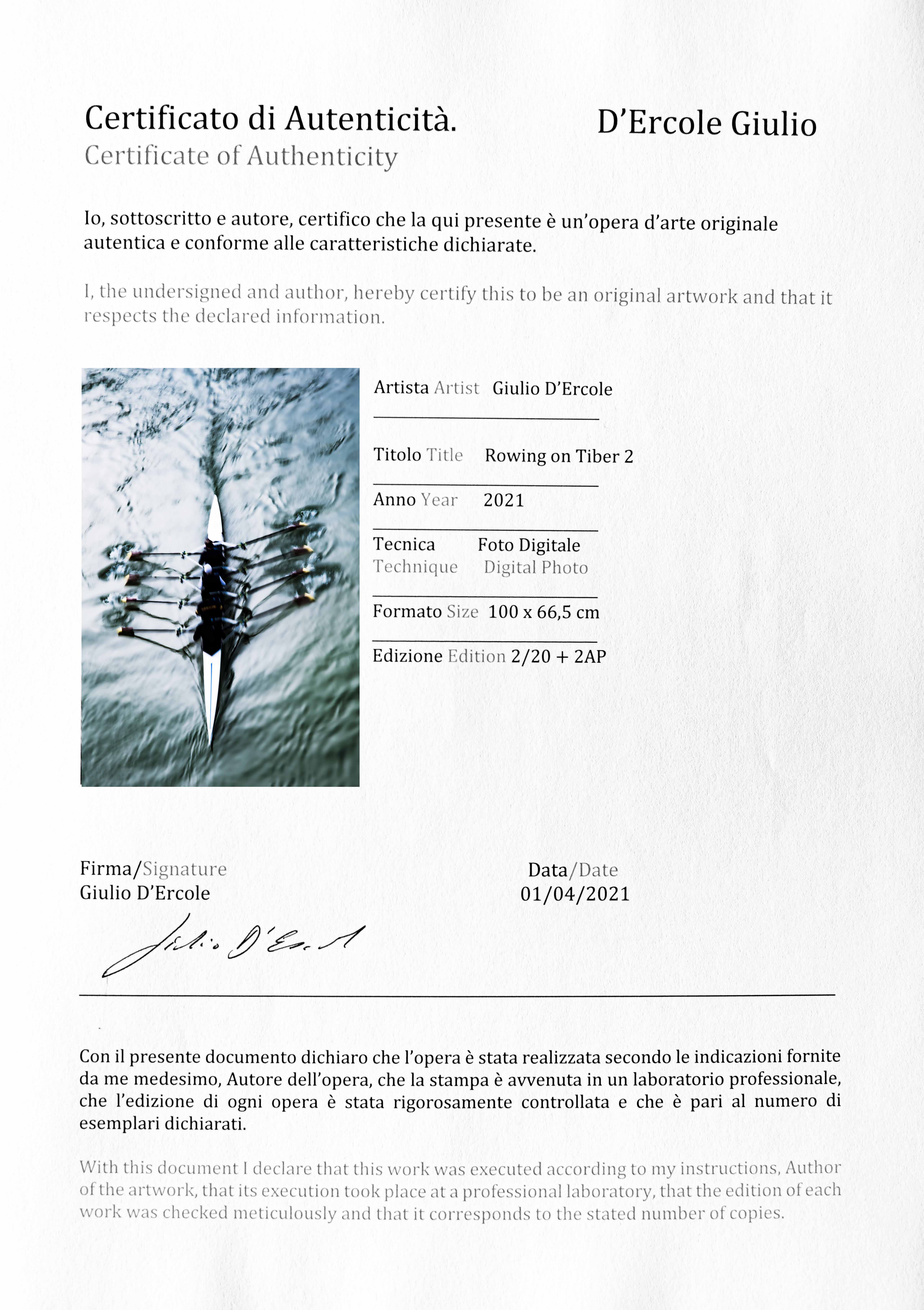 A ROWING BOAT PASSES QUICKLY ON THE WATERS OF THE TIBER RIVER, FLOWING UNDERNEATH THE BRIDGE. MOVEMENT IS CAPTURED IN ITS HAPPENING. LIFE IS A DYNAMIC ACT, NOT ALWAYS CLEAR, SOMETIMES BLURRY OR UNIDENTIFIABLE, BUT ALWAYS HEADING SOMEWHERE, NO MATTER WHAT. PHOTO DIGITALLY PRINTED ON HAHNEMHULE PHOTO RAG WHITE 100% COTTON 308 GR. MOUNTED ON DIBOND 3 MM. LIMITED EDITION 20 PRINTS + 2 AP.