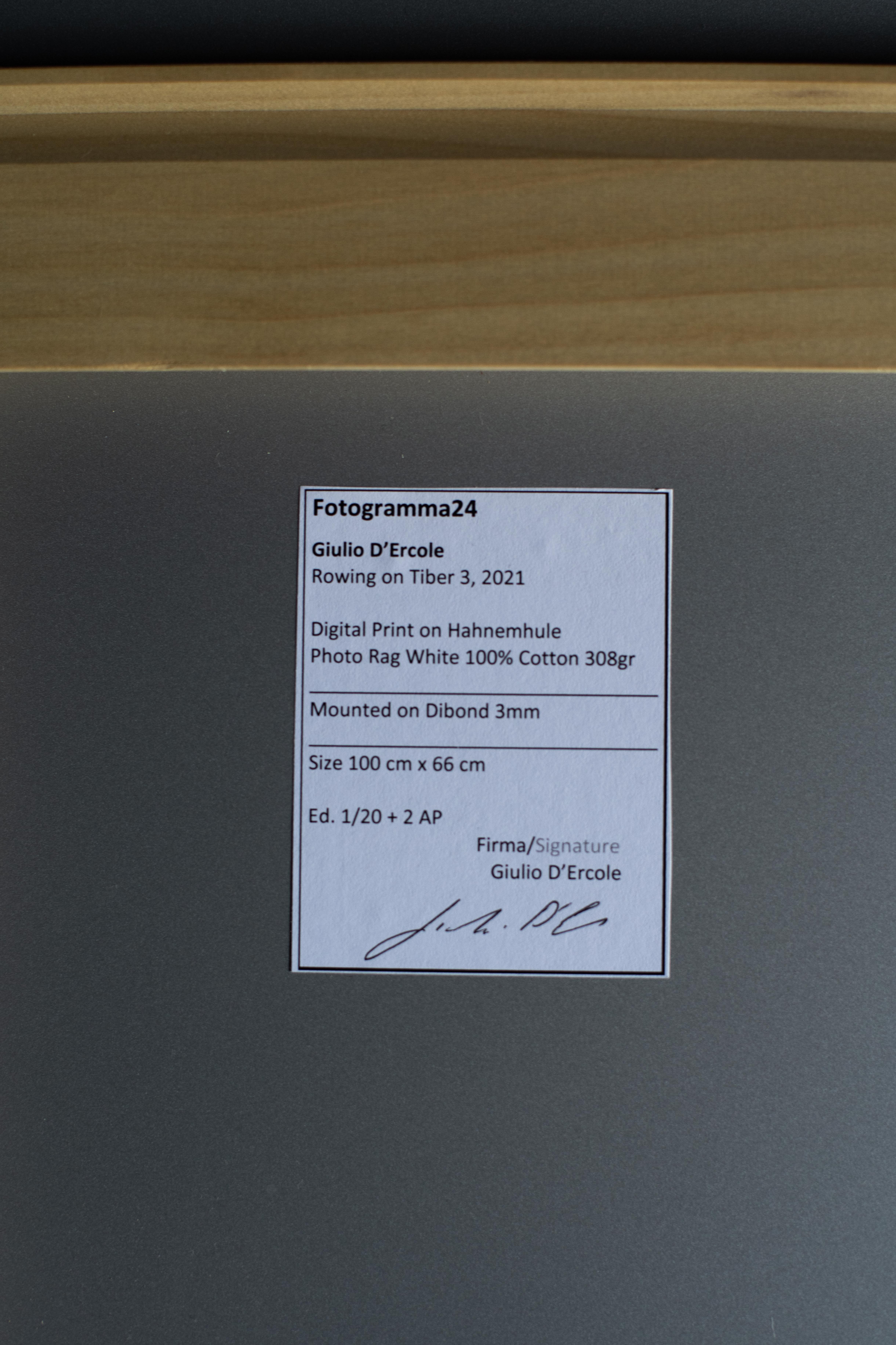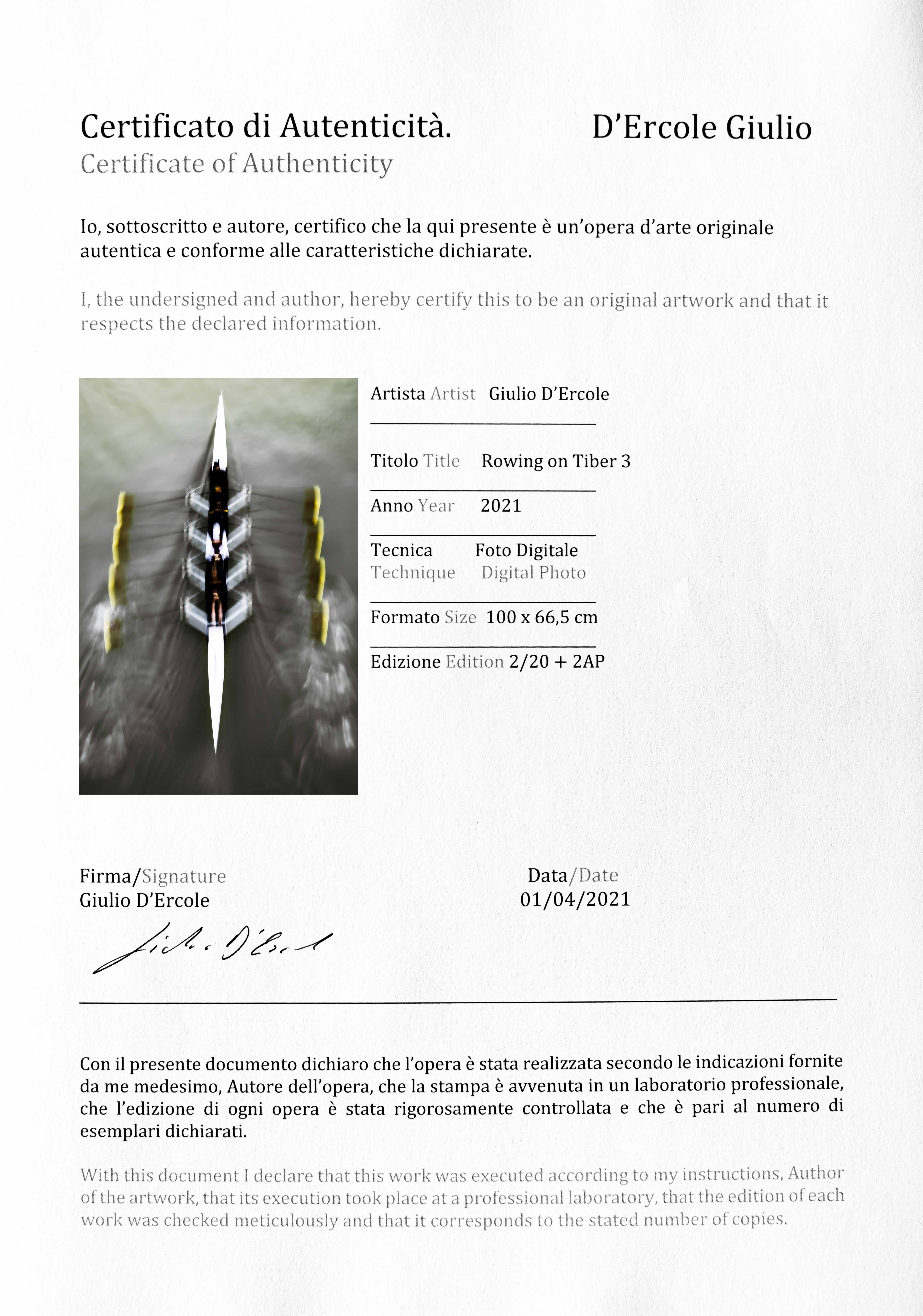 A ROWING BOAT PASSES QUICKLY ON THE WATERS OF THE TIBER RIVER, FLOWING UNDERNEATH THE BRIDGE. MOVEMENT IS CAPTURED IN ITS HAPPENING. LIFE IS A DYNAMIC ACT, NOT ALWAYS CLEAR, SOMETIMES BLURRY OR UNIDENTIFIABLE, BUT ALWAYS HEADING SOMEWHERE, NO MATTER WHAT. PHOTO DIGITALLY PRINTED ON HAHNEMHULE PHOTO RAG WHITE 100% COTTON 308 GR. MOUNTED ON DIBOND 3 MM. LIMITED EDITION 20 PRINTS + 2 AP.