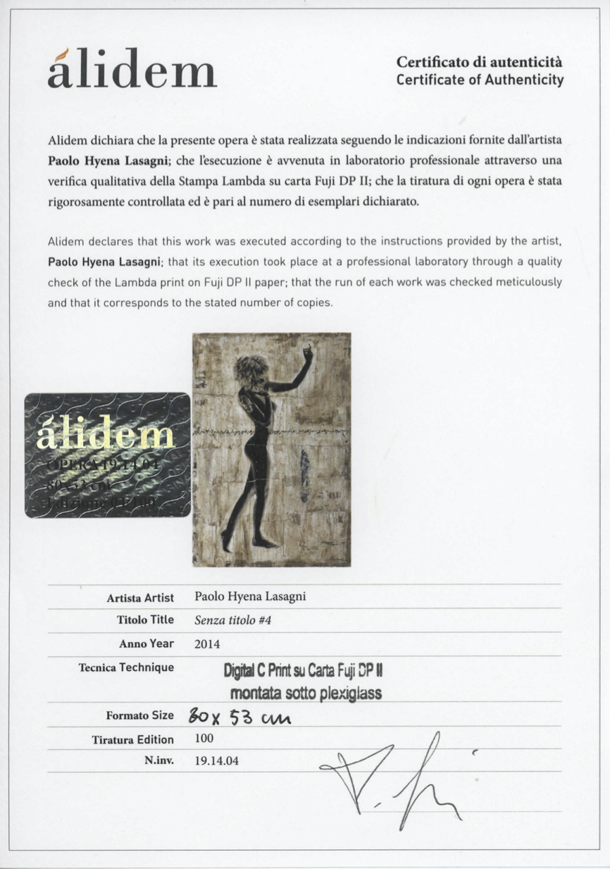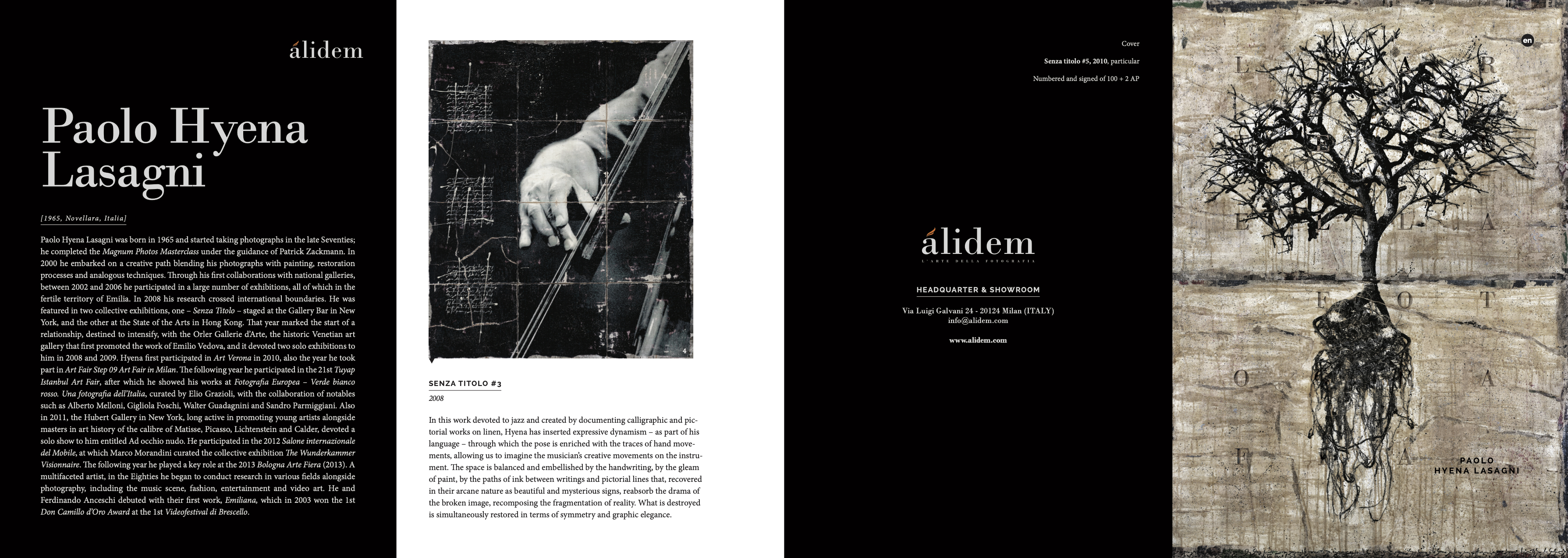 EN Paolo Hyena Lasagni was born in 1965 and started taking photographs in the late Seventies; he completed the Magnum Photos Masterclass under the guidance of Patrick Zackmann. In 2000 he embarked on a creative path blending his photographs with painting, restoration processes and analogous techniques. rough his rst collaborations with national galleries, between 2002 and 2006 he participated in a large number of exhibitions, all of which in the fertile territory of Emilia. In 2008 his research crossed international boundaries. He was featured in two collective exhibitions, one – Senza Titolo – staged at the Gallery Bar in New York, and the other at the State of the Arts in Hong Kong. at year marked the start of a relationship, destined to intensify, with the Orler Gallerie d’Arte, the historic Venetian art gallery that rst promoted the work of Emilio Vedova, and it devoted two solo exhibitions to him in 2008 and 2009. Hyena rst participated in Art Verona in 2010, also the year he took part in Art Fair Step 09 Art Fair in Milan. e following year he participated in the 21st Tuyap Istanbul Art Fair, a er which he showed his works at Fotogra a Europea – Verde bianco rosso. Una fotogra a dell’Italia, curated by Elio Grazioli, with the collaboration of notables such as Alberto Melloni, Gigliola Foschi, Walter Guadagnini and Sandro Parmiggiani. Also in 2011, the Hubert Gallery in New York, long active in promoting young artists alongside masters in art history of the calibre of Matisse, Picasso, Lichtenstein and Calder, devoted a solo show to him entitled Ad occhio nudo. He participated in the 2012 Salone internazionale del Mobile, at which Marco Morandini curated the collective exhibition e Wunderkammer Visionnaire. e following year he played a key role at the 2013 Bologna Arte Fiera (2013). A multifaceted artist, in the Eighties he began to conduct research in various elds alongside photography, including the music scene, fashion, entertainment and video art. He and Ferdinando Anceschi debuted with their rst work, Emiliana, which in 2003 won the 1st Don Camillo d’Oro Award at the 1st Videofestival di Brescello. IT Paolo Hyena Lasagni nasce nel 1965 e inizia a fotografare alla ne degli anni Settanta e consegue, sotto la guida di Patrick Zackmann, il Magnum Photos Masterclass. Nel 2000 inaugura un percorso creativo contaminando le proprie fotogra e con la pittura, le tecniche di restauro e le tecniche analogiche. Attraverso le prime collaborazioni con gallerie nazionali, tra il 2002 e il 2006 colleziona un ampio numero di mostre, tutte nel fertile territorio emiliano. Nel 2008, la sua ricerca emigra verso con ni internazionali. È protagonista di due mostre collettive, allestite l’una presso la Gallery Bar di New York, Senza titolo, e l’altra presso la State of the Arts di Hong Kong. Nello stesso anno avvia i rapporti, destinati a intensi carsi, con Orler Gallerie d’Arte - storica galleria d’arte veneziana che ha dato luce a opere di Emilio Vedova - che gli dedica tre personali tra il 2008 e il 2009. Partecipa per la prima volta ad Art Verona nel 2010 e, sempre in quell’anno, ad Art Fair Step 09 Art Fair – Milano. L’anno successivo, nel 2011, dopo la partecipazione alla XXI^ edizione di Tuyap Istanbul Art Fair, espone i suoi lavori in occasione di Fotogra a Europea - Verde bianco rosso. Una fotogra a dell’Italia, a cura di Elio Grazioli, con la collaborazione, tra gli altri, di Alberto Melloni, Gigliola Foschi, Walter Guadagnini e Sandro Parmiggiani. Ancora nel 2011, la Hubert Gallery di New York, da sempre attiva nella promozione di giovani artisti accanto a maestri della storia dell’arte del calibro di Matisse, Picasso, Lichtensteine Calder, gli dedica una personale, Ad occhio nudo. È protagonista al Salone internazionale del Mobile nel 2012, evento per cui Marco Morandini cura l’esposizione collettiva e Wunderkammer Visionnaire. L’anno successivo è tra i protagonisti di Bologna Arte Fiera (2013). Artista poliedrico, accanto ala ricerca fotogra ca ha intrapreso, sin dagli anni ’80, una ricerca in diversi campi, tra cui la scena musicale, la moda, lo spettacolo e il video, debuttando insieme a Ferdinando Anceschi con l’opera prima Emiliana, premiata nel 2003 al primo Videofestival di Brescello con il Primo Premio Don Camillo d’Oro.