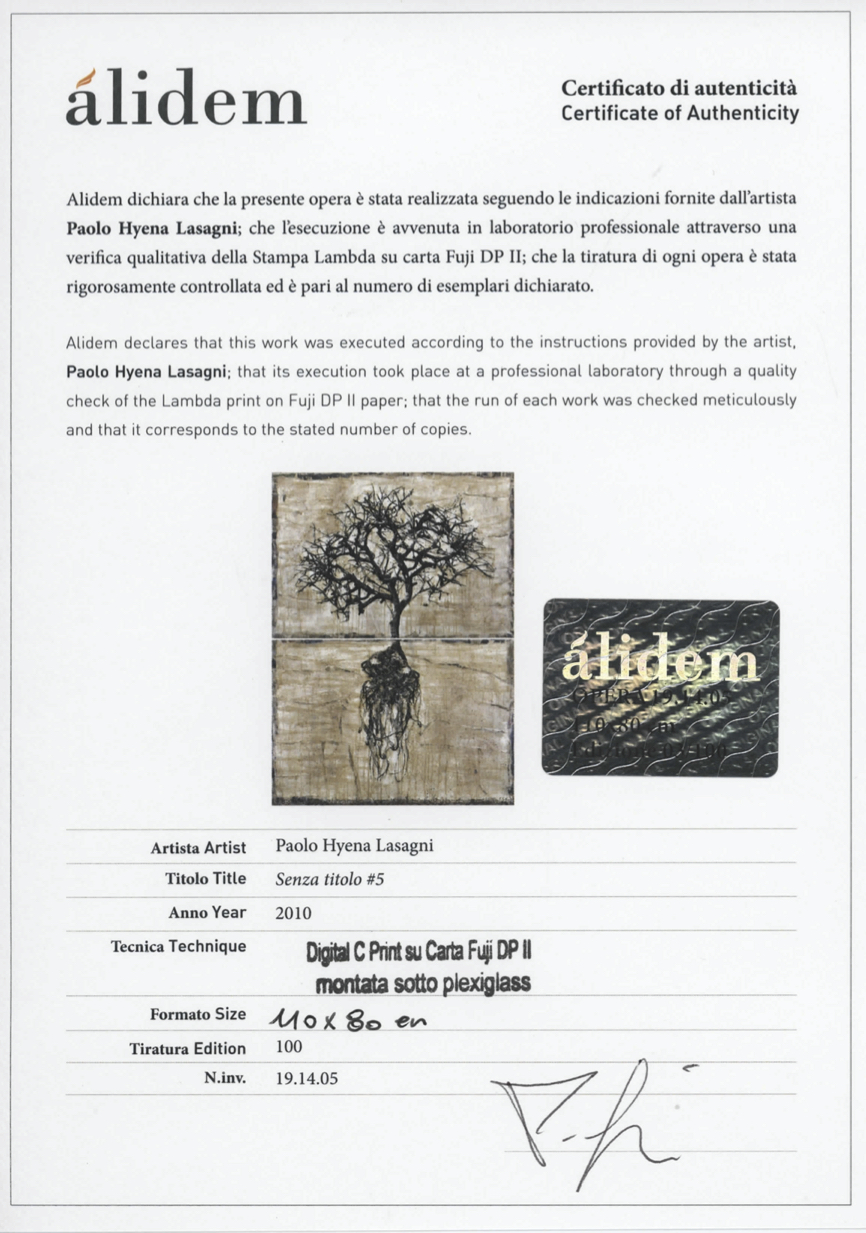 Paolo Hyena Lasagni nasce nel 1965 e inizia a fotografare alla ne degli anni Settanta e consegue, sotto la guida di Patrick Zackmann, il Magnum Photos Masterclass. Nel 2000 inaugura un percorso creativo contaminando le proprie fotogra e con la pittura, le tecniche di restauro e le tecniche analogiche. Attraverso le prime collaborazioni con gallerie nazionali, tra il 2002 e il 2006 colleziona un ampio numero di mostre, tutte nel fertile territorio emiliano. Nel 2008, la sua ricerca emigra verso con ni internazionali. È protagonista di due mostre collettive, allestite l’una presso la Gallery Bar di New York, Senza titolo, e l’altra presso la State of the Arts di Hong Kong. Nello stesso anno avvia i rapporti, destinati a intensi carsi, con Orler Gallerie d’Arte - storica galleria d’arte veneziana che ha dato luce a opere di Emilio Vedova - che gli dedica tre personali tra il 2008 e il 2009. Partecipa per la prima volta ad Art Verona nel 2010 e, sempre in quell’anno, ad Art Fair Step 09 Art Fair – Milano. L’anno successivo, nel 2011, dopo la partecipazione alla XXI^ edizione di Tuyap Istanbul Art Fair, espone i suoi lavori in occasione di Fotogra a Europea - Verde bianco rosso. Una fotogra a dell’Italia, a cura di Elio Grazioli, con la collaborazione, tra gli altri, di Alberto Melloni, Gigliola Foschi, Walter Guadagnini e Sandro Parmiggiani. Ancora nel 2011, la Hubert Gallery di New York, da sempre attiva nella promozione di giovani artisti accanto a maestri della storia dell’arte del calibro di Matisse, Picasso, Lichtensteine Calder, gli dedica una personale, Ad occhio nudo. È protagonista al Salone internazionale del Mobile nel 2012, evento per cui Marco Morandini cura l’esposizione collettiva e Wunderkammer Visionnaire. L’anno successivo è tra i protagonisti di Bologna Arte Fiera (2013). Artista poliedrico, accanto ala ricerca fotogra ca ha intrapreso, sin dagli anni ’80, una ricerca in diversi campi, tra cui la scena musicale, la moda, lo spettacolo e il video, debuttando insieme a Ferdinando Anceschi con l’opera prima Emiliana, premiata nel 2003 al primo Videofestival di Brescello con il Primo Premio Don Camillo d’Oro.