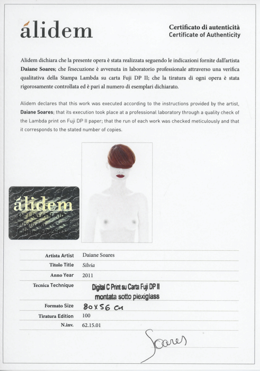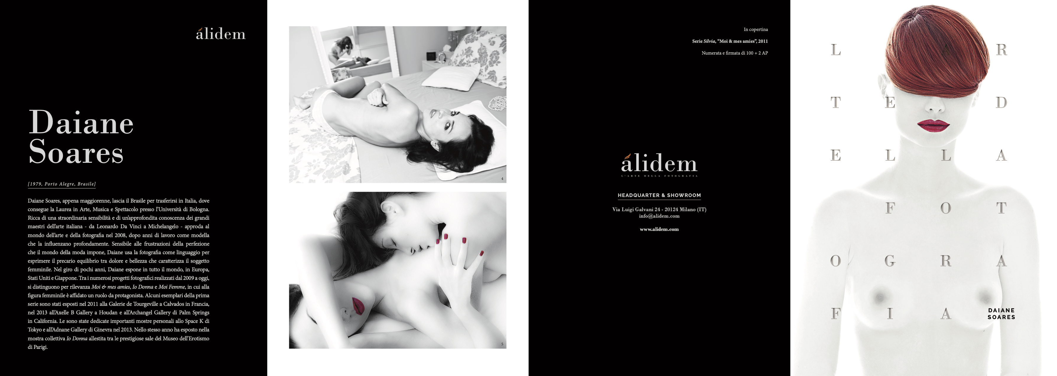 EN Daiane Soares, just of age, leaves Brazil to move to Italy, where she graduated in Art, Music and Entertainment at the University of Bologna. Rich in an extraordinary sensitivity and an in-depth knowledge of the great masters of Italian art - from Leonardo Da Vinci to Michelangelo - she entered the world of art and photography in 2008, after years of work as a model that deeply influenced her. Sensitive to the frustrations of perfection that the world of fashion imposes, Daiane uses photography as a language to express the precarious balance between pain and beauty that characterizes the female subject. Within a few years, Daiane exhibited worldwide, in Europe, the United States and Japan. Among the numerous photographic projects carried out from 2009 to today, Moi & mes amies, Io Donna and Moi Femme, in which the female figure is entrusted with a leading role, are distinguished by their relevance. Some specimens of the first series were exhibited in 2011 at the Galerie de Tourgeville in Calvados in France, in 2013 at the Axelle B Gallery in Houdan and at the Archangel Gallery in Palm Springs in California. Important solo exhibitions were dedicated to her at Space K in Tokyo and at the Adnane Gallery in Geneva in 2013. In the same year she exhibited in the collective exhibition Io Donna set up in the prestigious rooms of the Museum of Eroticism in Paris. IT Daiane Soares, appena maggiorenne, lascia il Brasile per trasferirsi in Italia, dove consegue la Laurea in Arte, Musica e Spettacolo presso l’Università di Bologna. Ricca di una straordinaria sensibilità e di un’approfondita conoscenza dei grandi maestri dell’arte italiana - da Leonardo Da Vinci a Michelangelo - approda al mondo dell’arte e della fotografia nel 2008, dopo anni di lavoro come modella che la influenzano profondamente. Sensibile alle frustrazioni della perfezione che il mondo della moda impone, Daiane usa la fotografia come linguaggio per esprimere il precario equilibrio tra dolore e bellezza che caratterizza il soggetto femminile. Nel giro di pochi anni, Daiane espone in tutto il mondo, in Europa, Stati Uniti e Giappone. Tra i numerosi progetti fotografici realizzati dal 2009 a oggi, si distinguono per rilevanza Moi & mes amies, Io Donna e Moi Femme, in cui alla figura femminile è affidato un ruolo da protagonista. Alcuni esemplari della prima serie sono stati esposti nel 2011 alla Galerie de Tourgeville a Calvados in Francia, nel 2013 all’Axelle B Gallery a Houdan e all’Archangel Gallery di Palm Springs in California. Le sono state dedicate importanti mostre personali allo Space K di Tokyo e all’Adnane Gallery di Ginevra nel 2013. Nello stesso anno ha esposto nella mostra collettiva Io Donna allestita tra le prestigiose sale del Museo dell’Erotismo di Parigi.