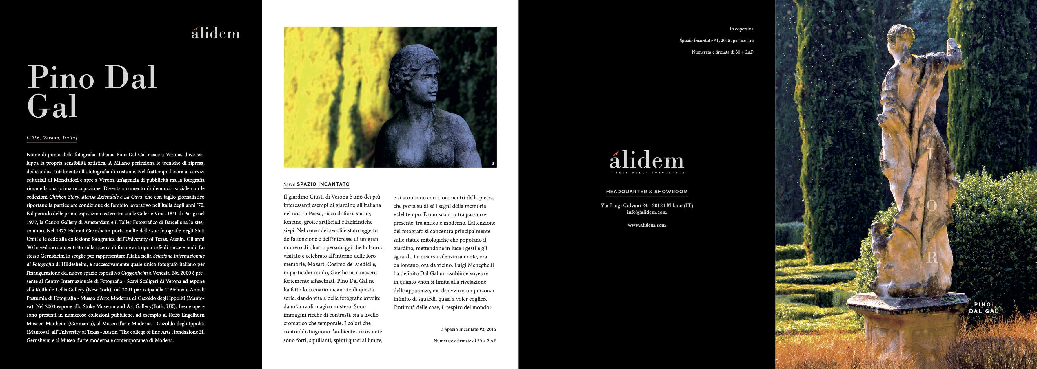 EN A leading name in Italian photography, Pino Dal Gal was born in Verona, where he developed his artistic sensitivity. In Milan he perfected his shooting technique, devoting himself entirely to costume photography. In the meantime, he worked for the publishing office of Mondadori Editore and opened an advertising agency in Verona, but his main occupation continued to be photography. This became an instrument of social condemnation with the Chicken Story, Mensa Aziendale and La Cava collections, which took a journalistic approach to report on the unique conditions of the Italian work environment in the Seventies. This was the period of his first foreign exhibitions, including the Galerie Vinci 1840 in Paris in 1977, and the Canon Gallery in Amsterdam and the Taller Fotografico in Barcelona the same year. Also in 1977 Helmut Gernsheim brought many of his photographs to the Uni- ted States and sold them to the photography collection at the University of Texas at Austin. In the Eighties Dal Gal focused on researching anthropomorphic forms of rocks and nudes, and Gernsheim chose him to represent Italy in the International Photography Selection in Hildesheim and then as the only Italian photographer for the inauguration of the new Guggenheim exhibition space in Venice. In 2000 his artworks are exposed at the Centro Internazionale di Fotografia- Scavi Scaligeri in Verona and at the Keith de Lellis Gallery (New York); in 2001 he took part in the 1°Biennale Annali Postumia di Fotografia – Modern Art Museum of Gazoldo degli Ippoliti (Mantova). In 2003 he exhibited at the Stoke Museum and Art Galle- ry (Bath, UK). His pictures are in many public collections: at the Reiss Engelhorn Museen-Manheim (Germany), at Modern Art Museum of (Mantova), at the Uni- versity of Texas - Austin “The college of fine Arts”, foundation H.Gernsheim and at the Modern and Contemporary Art Museum in Modena. IT Nome di punta della fotografia italiana, Pino Dal Gal nasce a Verona, dove svi- luppa la propria sensibilità artistica. A Milano perfeziona le tecniche di ripresa, dedicandosi totalmente alla fotografia di costume. Nel frattempo lavora ai servizi editoriali di Mondadori e apre a Verona un’agenzia di pubblicità ma la fotografia rimane la sua prima occupazione. Diventa strumento di denuncia sociale con le collezioni Chicken Story, Mensa Aziendale e La Cava, che con taglio giornalistico riportano la particolare condizione dell’ambito lavorativo nell’Italia degli anni ’70. È il periodo delle prime esposizioni estere tra cui le Galerie Vinci 1840 di Parigi nel 1977, la Canon Gallery di Amsterdam e il Taller Fotografico di Barcellona lo stes- so anno. Nel 1977 Helmut Gernsheim porta molte delle sue fotografie negli Stati Uniti e le cede alla collezione fotografica dell’University of Texas, Austin. Gli anni ’80 lo vedono concentrato sulla ricerca di forme antropomorfe di rocce e nudi. Lo stesso Gernsheim lo sceglie per rappresentare l’Italia nella Selezione Internazionale di Fotografia di Hildesheim, e successivamente quale unico fotografo italiano per l’inaugurazione del nuovo spazio espositivo Guggenheim a Venezia. Nel 2000 è pre- sente al Centro Internazionale di Fotografia - Scavi Scaligeri di Verona ed espone alla Keith de Lellis Gallery (New York); nel 2001 partecipa alla 1°Biennale Annali Postumia di Fotografia - Museo d’Arte Moderna di Gazoldo degli Ippoliti (Manto- va). Nel 2003 espone allo Stoke Museum and Art Gallery(Bath, UK). Lesue opere sono presenti in numerose collezioni pubbliche, ad esempio al Reiss Engelhorn Museen-Manheim (Germania), al Museo d’arte Moderna - Gazoldo degli Ippoliti (Mantova), all’University of Texas - Austin “The college of fine Arts”, fondazione H. Gernsheim e al Museo d’arte moderna e contemporanea di Modena.