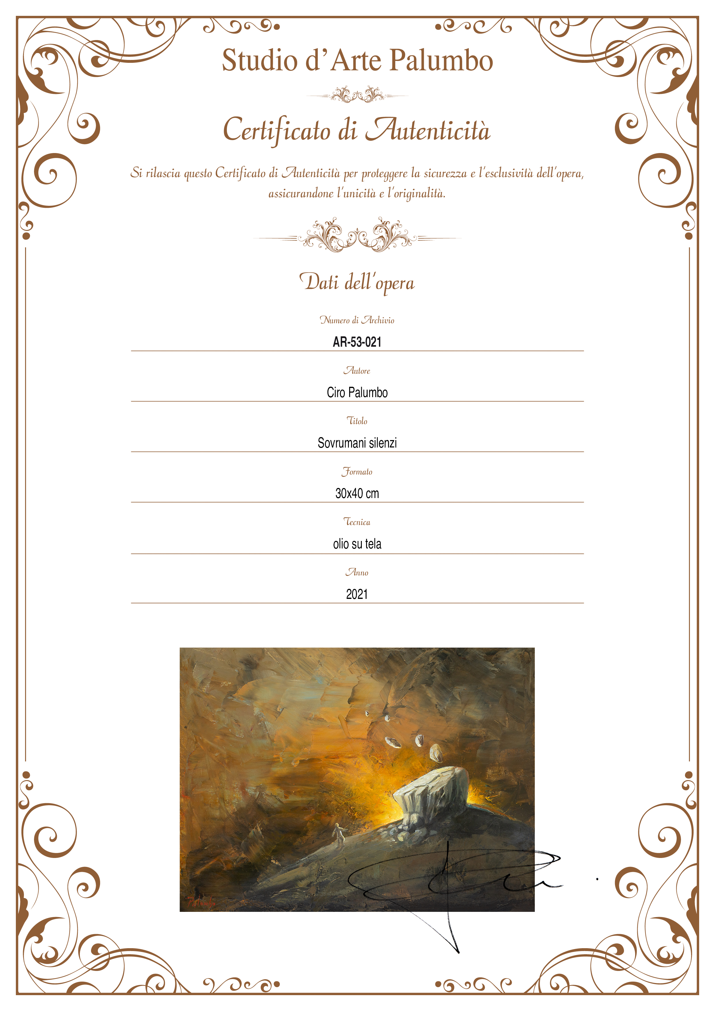 Nato a Zurigo nel 1965. Il suo percorso artistico prende l’avvio dalla poetica della scuola Metafisica di Giorgio de Chirico e Alberto Savinio, per reinventarne tuttavia i fondamenti secondo un’interpretazione personale del tutto originale. Nella sua ricerca procede attraverso momenti di contemplazione e silenzi metafisici, a cui si contrappongono espressività notturne e intimamente travagliate, dove si respira netto il distacco dall’immobilità silente che abita le tele del Pictor Optimus. Le sue opere si presentano dunque come palcoscenici in cui gli oggetti presenti sono portatori di simbologie oniriche. Ciro Palumbo non è solo un pittore, ma di fatto un poeta che riflette, agisce e compone per coniugare metafore sull’inafferrabilità del tempo e l’incommensurabilità dello spazio, mostrando quindi la sua capacità di approfondire l’osservazione non tanto della natura, quanto delle impressioni immaginifiche che provengono dalla memoria. Curioso ricercatore e studioso, lavora da qualche anno anche sul tema del Mito, interpretando la mitologia classica in chiave squisitamente moderna, e dandone una lettura profondamente colta e suggestiva. L’artista riesce dunque a sublimare e contestualizzare i miti antichi in spazi al di fuori del tempo, dimostrando la loro contemporaneità. La sua formazione di grafico pubblicitario lo porta ad esercitare per anni la professione di Art Director in Agenzie pubblicitarie di Torino. È durante questo percorso che scopre ed amplia le sue capacità visive e compositive. Successivamente, l’esperienza in una moderna bottega d’arte e la conoscenza di alcuni Maestri contemporanei, lo conducono ad approfondire la tecnica della pittura ad olio con velatura. Negli ultimi anni l’artista si dedica con successo anche alla scultura donando tridimensionalità, attraverso la terracotta, ai topos della sua poetica. Mostre ed eventi più recenti Mostre personali Rinascenza. Dolor et Furor a cura di Luca Cantore D’Amore presso Palazzo Velli Expo, Roma (in collaborazione con 7ettanta6ei Art, Milano) maggio 2021 Homo Viator. Il poeta visionario a cura di Salvo Daniele Torrisi presso Ex Chiesa del Carmine, Taormina (Me) (organizzata da Catania Art Gallery / con rappresentazione della pièce teatrale ispirata all’Homo Viator, scritta e interpretata da PierGiuseppe Francione) agosto 2020 Moby Dick mi disse a cura di Laura Tartarelli presso Laura Tartarelli Contemporary Art, Pietrasanta (Lu) luglio 2020 La pittura. Una finzione vera presso Castello Baronale di Minturno (Lt) (organizzata da Cristiano Art Gallery) 2019 Homo Viator. Il poeta visionario presso Stadio di Domiziano, Roma (organizzata da Canova Arte, Roma / con rappresentazione della pièce teatrale ispirata all’Homo Viator, scritta e interpretata da PierGiuseppe Francione) 2019 Rinascenza. Un risveglio per l’anima (all’interno della collettiva “Risvegli”) presso Museo civico di Palazzo della Penna, Perugia (organizzata da Michela Lupi e Antonello Turchetti / in collaborazione con 7ettanta6ei Art, Milano) 2019 The strenght of gods and heroes. La forza degli dei e degli eroi a cura di Angelo Crespi presso: . ST ART, Mondadori Megastore, Milano . Stadio di Domiziano, Roma 2018 Palumbo - Fellini. Immaginario surreale tra pittura e cinema (all’interno dell’Ischia Film Festival) presso Carcere Borbonico del Castello Aragonese d’Ischia, Ischia (Na) (organizzata da 7ettanta6ei Art, Milano) 2018 Rinascenza. La pittura, un segreto non ancora svelato presso Palazzo Medici Riccardi, Sale Fabiani, Firenze (organizzata da Riccardo Ferrucci / in collaborazione con 7ettanta6ei Art, Milano) 2018 Isole migranti a cura di Ivan Quaroni e Alessandra Redaelli presso Palazzo della Cultura, Catania 2017 Il volo del Poeta visionario con racconti in versi di Aldo Nove a cura di Alessandra Redaelli presso Sala Colonnato del Palazzo della Città Metropolitana di Bari, Bari 2016 Le Soglie dell’enigma a cura di Francesca Bogliolo presso Galleria Il Forte Antichità, Forte dei Marmi (Lu) 2016 Lo Spirito e la Carne a cura di Alessandra Redaelli presso Galleria Biffi Arte, Piacenza 2016 Homo Viator a cura di Flaminio Gualdoni / con testo di Riccardo Ferrucci presso Museo Piaggio, Pontedera (Pi) 2016 Sguardi eterni tra la terra e il cielo a cura di Alessandra Redaelli (organizzata dal MACS di Catania) presso: . MAUTO Museo Nazionale dell’Automobile di Torino . Castello di Schisò, Giardini Naxos (Me) . Castello Carlo V, Monopoli (Ba) 2015 I mulini di Dio a cura di Alessandra Frosini e Stefano Gagliardi (organizzata da ArToday Events, San Gimignano) presso Ex Ospedale San Rocco, Matera 2015 La solitudine di Prometeo Presso MACS Museo Arte Contemporanea Sicilia, Catania 2014 I mulini di Dio a cura di Alberto Agazzani (organizzata dalla Galleria Gagliardi, San Gimignano) presso Convento di Santo Spirito ex carceri, Nola (Na) 2014 Affinità silenti. Giorgio de Chirico e Ciro Palumbo a cura di Paolo Levi (organizzata da Sangiorgio International) presso Spazio Espositivo e Culturale della Società Bancaria Ticinese, Bellinzona, Svizzera 2014 Metafisiche visioni a cura di Stefania Bison presso Manni Art Gallery, Venezia Lido 2013 Islands and journeys. The color of silence presso Just Art - Contemporary Art Gallery, Providence (USA) 2013 Viaggi, naufragi, tempeste e nuove rotte a cura di Alberto D’Atanasio presso Galleria Arte Barbato, Scafati (Sa) 2013 Nuove terre e nuovi mari a cura di Alberto D’Atanasio presso Galleria Wikiarte, Bologna 2013 Al di là della realtà del nostro tempo presso Centrum Sete Sóis Sete Luas, Frontignan, Francia 2013 Il mistero dell’isola a cura di Alberto D’Atanasio presso CERP/Centro Espositivo Rocca Paolina, Perugia 2012 Paestum Arte 2012 (organizzata dall’ Associazione culturale G. Verdi) Paestum (Sa) 2012 Di aria, di acqua di terra, di fuoco, sono le sostanze dei sogni presso Civica Galleria d’Arte moderna “Giuseppe Sciortino”, Monreale (Pa) 2012 Il mistero dell