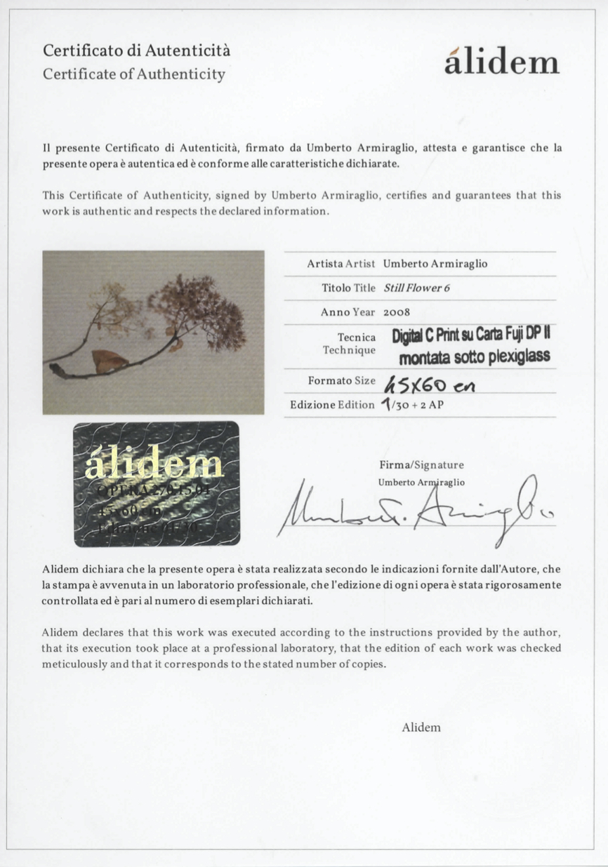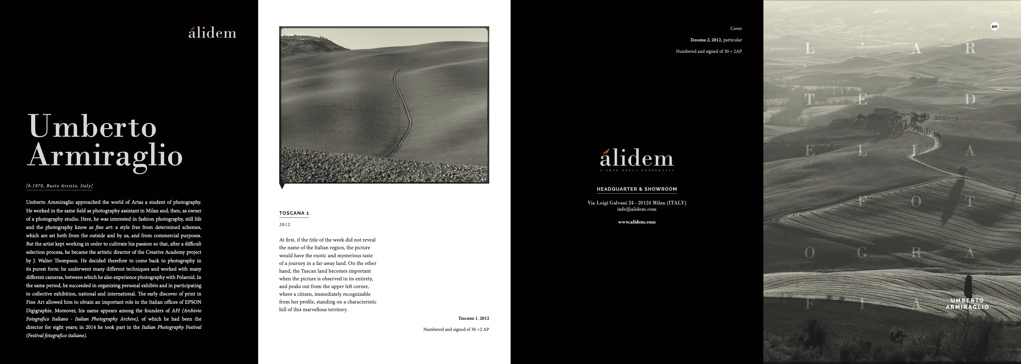 EN Umberto Armiraglio approached the world of Artas a student of photography. He worked in the same field as photography assistant in Milan and, then, as owner of a photography studio. Here, he was interested in fashion photography, still life and the photography know as fine art: a style free from determined schemes, which are set both from the outside and by us, and from commercial purposes. But the artist kept working in order to cultivate his passion so that, after a difficult selection process, he became the artistic director of the Creative Academy project by J. Walter Thompson. He decided therefore to come back to photography in its purest form: he underwent many different techniques and worked with many different cameras, between which he also experience photography with Polaroid. In the same period, he succeeded in organizing personal exhibits and in participating to collective exhibition, national and international. The early discover of print in Fine Art allowed him to obtain an important role in the Italian offices of EPSON Digigraphie. Moreover, his name appears among the founders of AFI (Archivio Fotografico Italiano - Italian Photography Archive), of which he had been the director for eight years; in 2014 he took part in the Italian Photography Festival (Festival fotografico italiano). IT Umberto Armiraglio si avvicina al mondo dell’arte in quanto studente di fotografia, a cui seguono anni di lavoro sempre nello stesso campo: diventa assistente di fotografia a Milano e poi proprietario di uno studio fotografico. Qui si dedica a scatti di moda, riprese still-life oltre che alla fotografia così detta fine art: uno stile libero da schemi predeterminati tanto dall’esterno quanto da noi stessi, e lontana da ogni scopo commerciale. Ma l’artista continua a lavorare per perseguire la sua passione, così supera una dura selezione e, nel ruolo di direttore artistico, entra a far parte del progetto Creative Academy di J. Walter Thompson. Decide quindi di tornare alla fotografia nella sua forma più pura: sperimenta moltissime tecniche diverse e lavora con moltissime macchine fotografiche diverse, inclusa una fase in cui si dedica alla fotografia con Polaroid. Nello stesso periodo riesce a realizzare esibizioni personali e partecipa a mostre collettive, nazionali e internazionali. La precoce scoperta della stampa in Fine Art gli permette di ottenere un ruolo di primo piano per la sede italiana di EPSON Digigraphie. Il suo nome compare, inoltre, tra i fondatori dell’AFI (Archivio Fotografico Italiano) di cui è stato direttore per otto anni; nel 2014 partecipa al Festival fotografico italiano.