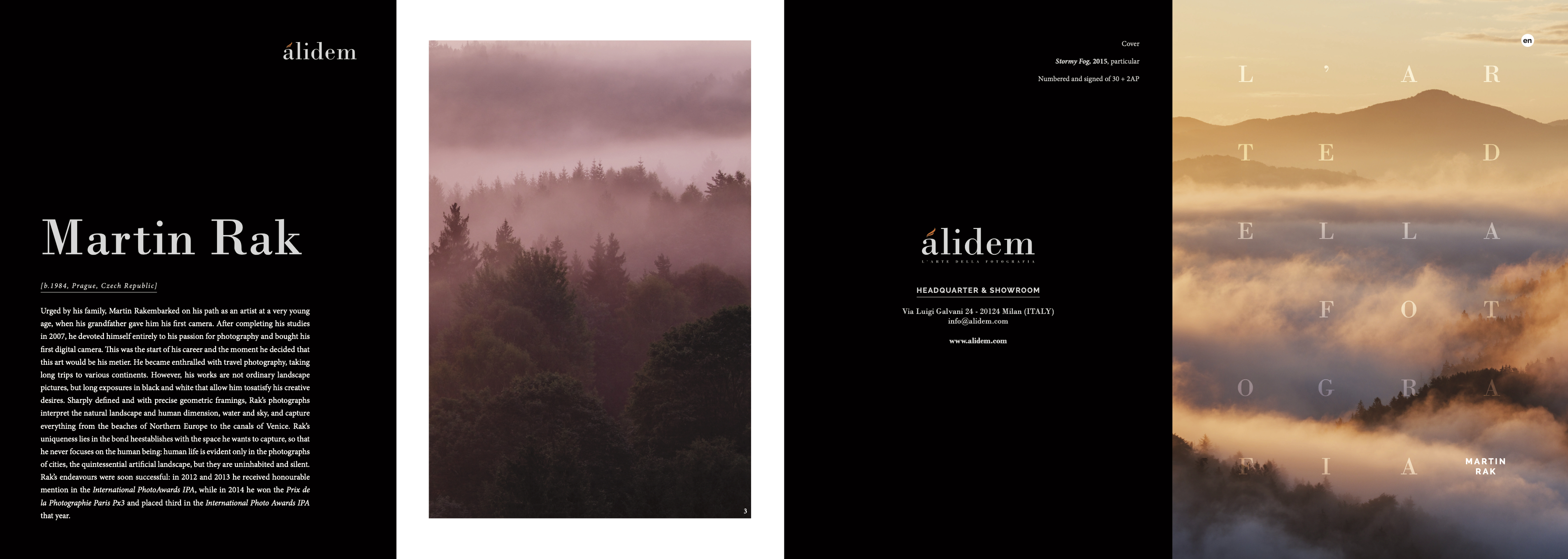EN Urged by his family, Martin Rak embarked on his path as an artist at a very young age, when his grandfather gave him his first camera. After completing his studies in 2007, he devoted himself entirely to his passion for photography and bought his first digital camera. This was the start of his career and the moment he decided that this art would be his metier. He became enthralled with travel photography, taking long trips to various continents. However, his works are not ordinary landscape pictures, but long exposures in black and white that allow him tosatisfy his creative desires. Sharply defined and with precise geometric framings, Rak’s photographs interpret the natural landscape and human dimension, water and sky, and capture everything from the beaches of Northern Europe to the canals of Venice. Rak’s uniqueness lies in the bond heestablishes with the space he wants to capture, so that he never focuses on the human being: human life is evident only in the photographs of cities, the quintessential artificial landscape, but they are uninhabited and silent. Rak’s endeavours were soon successful: in 2012 and 2013 he received honourable mention in the International PhotoAwards IPA, while in 2014 he won the Prix de la Photographie Paris Px3 and placed third in the International Photo Awards IPA that year. IT Incitato dalla famiglia, Martin Rak intraprende il suo percorso di artista fin da giovane, quando il nonno gli regala la prima macchina fotografica. Dopo aver completato gli studi, nel 2007, inizia a dedicarsi totalmente alla passione della fotografia, comprando la prima macchina digitale: è lo slancio della sua carriera e il momento in cui decide che questa particolare arte diventerà il suo lavoro. Infatti si appassiona alla fotografia di viaggio, che lo impegna in lunghi spostamenti attraverso i continenti. Ma non si tratta di comuni scatti paesaggistici, quanto, invece, di lunghe esposizioni in bianco e nero che gli permettono di soddisfare la sua intenzione creativa. Nitide e dall’inquadratura geometrica e precisa, le fotografie di Rak riescono a declinare paesaggio naturale e dimensione umana, acqua e cielo, e spaziano dalle spiagge del Nord Europa ai canali di Venezia. La peculiarità di Rak consiste nel legame che l’artista instaura con lo spazio che intende cristallizzare, tanto da non inquadrare mai l’essere umano: l’esistenza dell’Uomo è evidente solo nelle fotografie delle città, paesaggi artificiali per antonomasia, che però appaiono disabitate e silenti. Martin Rak ha visto presto i successi del suo impegno: nel 2012 e nel 2013 ottiene la menzione d’onore agli International Photo Awards IPA, mentre il 2014 lo vede vincitore del Prix de la Photographie Paris Px3 e terzo classificato agli International Photo Awards IPA dello stesso anno.