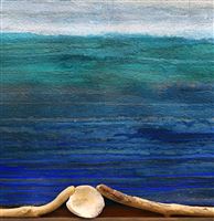 THE ATMOSPHERE OF A SEASTORM WATCHED FROM THE SAFE LANDSIDE IS ALWAYS FASCINATING. I COULD SIT THER FOR HOURS AND THINK OF THOSE WHOA HAVE TO NAVIGATE THIS STORM AT THE MOMENT WITH THEIR BOAT. SEA AND SKY OFTEN MELT INTO EACH OTHER. I PUT THIS WOODEN FLOTSOME FROM THE BEACH WHERE I WAS SITTING. SOME GRAVEL AND AN OLD SESHELL, TO GIVE THIS VIEW ITS SMELL AND FLAVOUR.