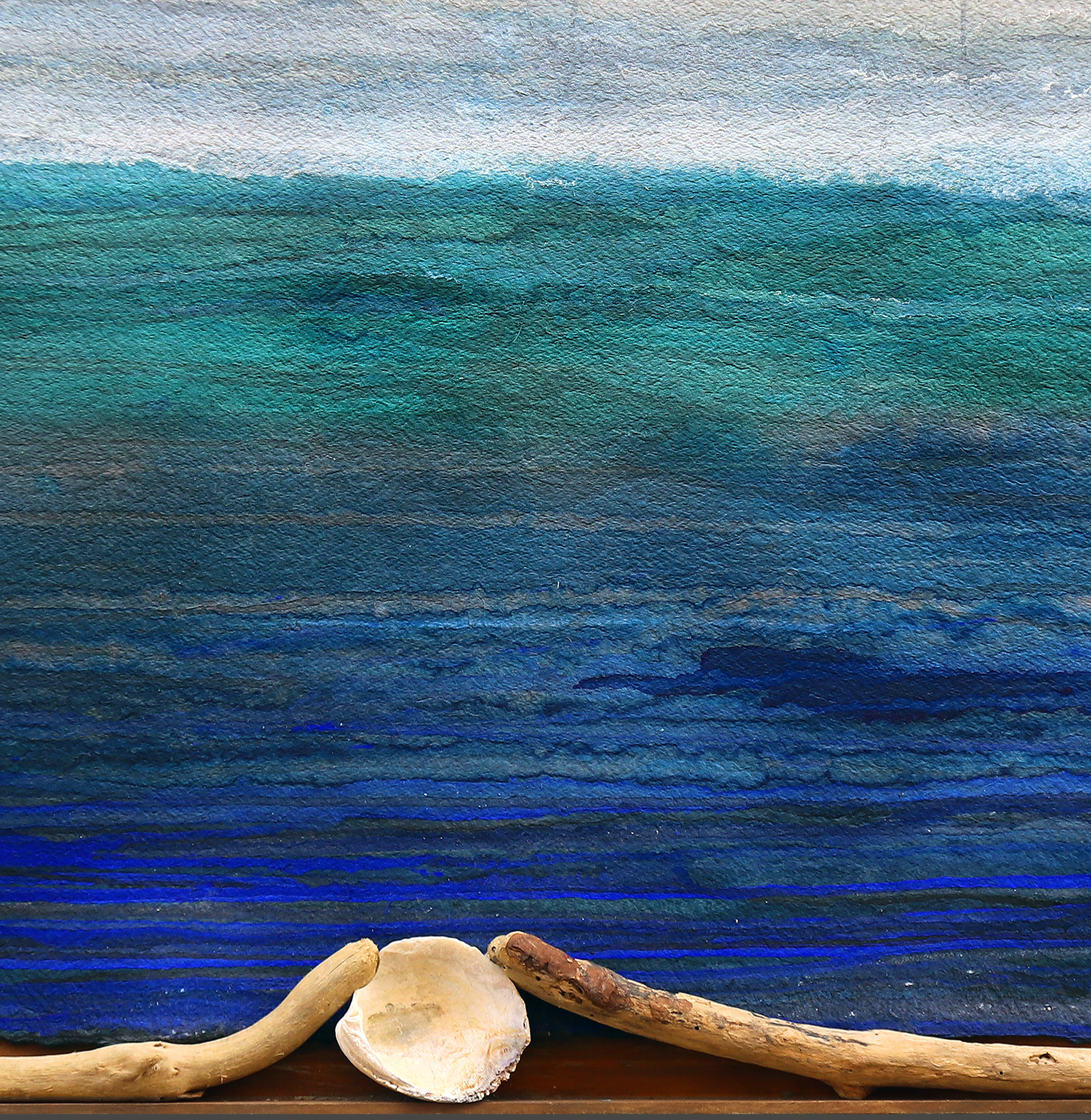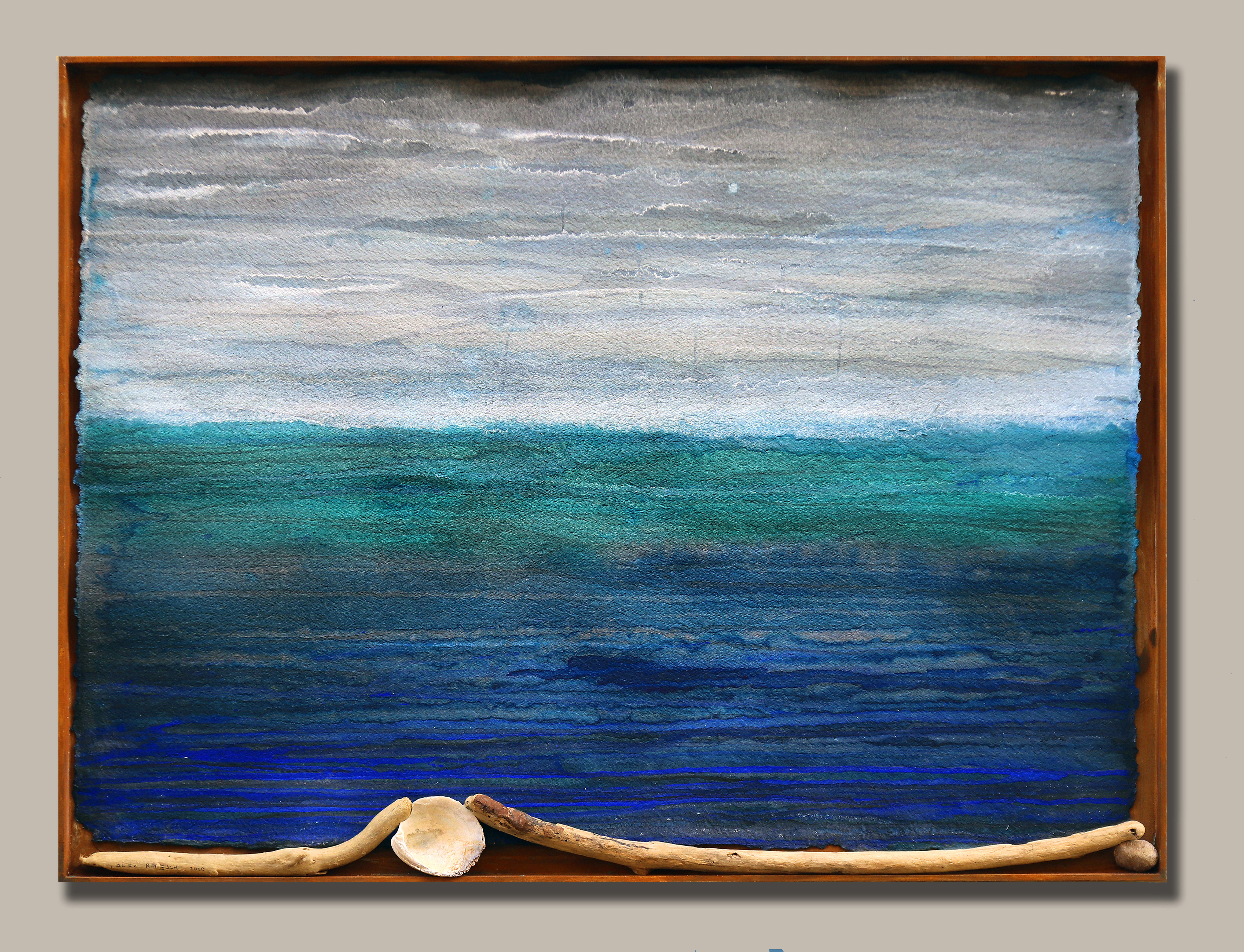 WATERCOLOR ON HEAVY HANDMADE PAPER ASSEMBLAGE WOOD STONE SEASHELL