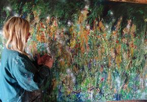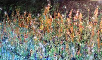 THIS WORK IS AN RECREATION OF THE NATURE PROCESS OF WILD GROWING. EVERY PLANT HAS OTHER MOVEMENTS IN THE WIND AND SHINE IN DIFFERENT LIGHTS. TO PAINTING ARE THROWN PLANTS AND OTHER MATERIALS FULL OF COLOR TO GET THE SAME PROCESS AS NATURE BUILD UP. THIS TAKES SEVERAL WEEKS AND THE RESULT IS MULTILAYERD AND COMPLES AS THE MEADOPW IS. FRIENDLY TO THE INSECTS AND BIRDS AS WELL AS TO THE EYES AND BRAIN.