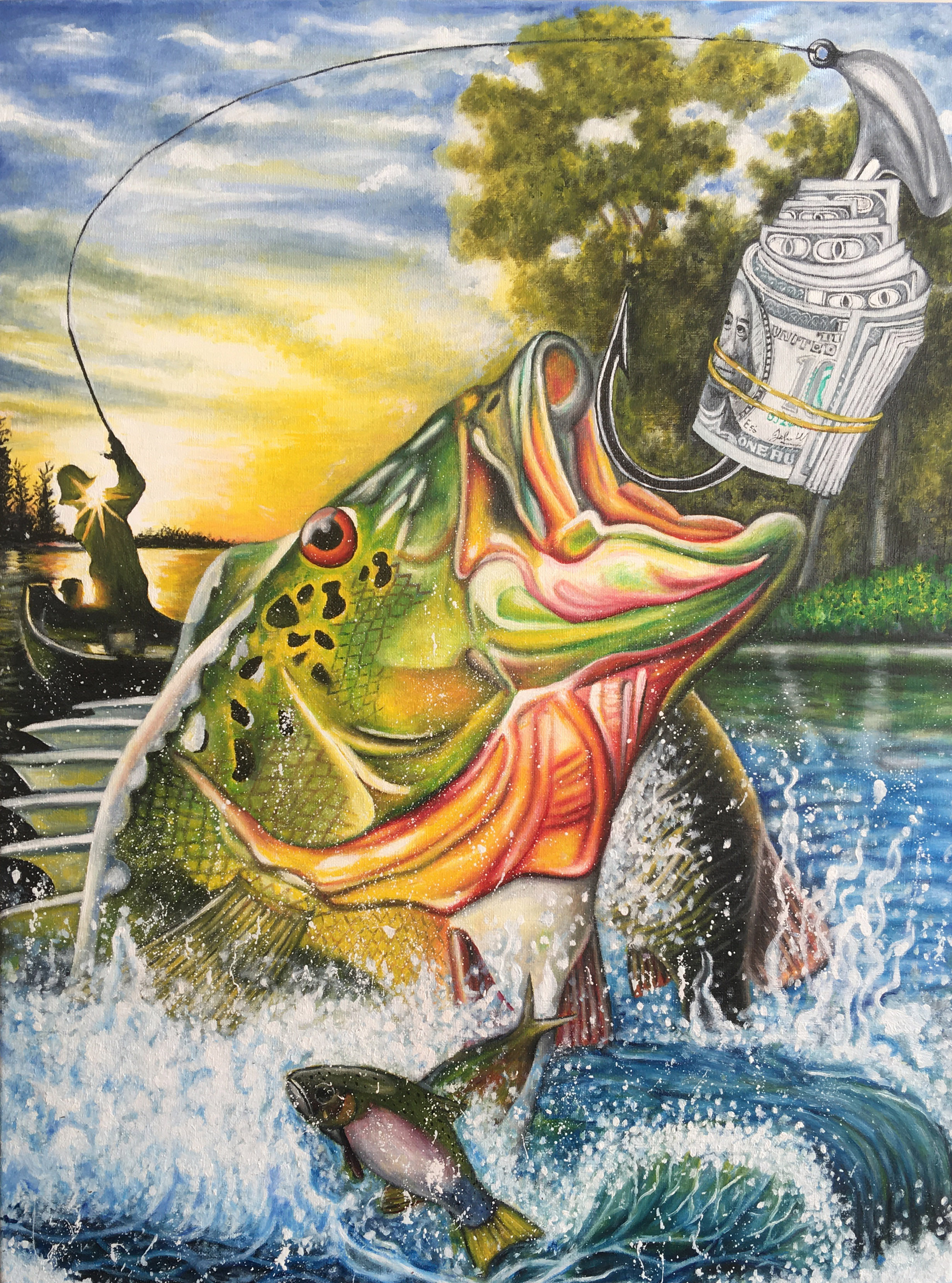 AS STATED BY THE WISEST AND WEALTHIEST MAN IN THE HOLY BIBLE, KING SOLOMON, NOTHING IS AS BANAL AND MEANINGLESS AS UNHEALTHY LOVE OF MONEY. THE UNHEALTHY LOVE OF MONEY IS ONE OF THE BANALITIES OF EVIL IN OUR DAILY LIVES WHICH INFLUENCED MY PAINTING – “THE BAIT”