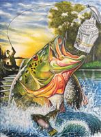 I DO NOT LIKE TO COPY NATURE BUT USE NATURE AS A REFERENCE TO CREATE MY WORK. LIKE SURREALISTIC ARTISTS, I LIKE TO USE UNREALISTIC IMAGES TO CONVEY MY MESSAGES. FLY FISHING IS A REAL METHOD OF FISHING, BUT DOLLAR FISHING IS UNREAL. IN TACKLING THIS PROJECT, I PUT ROLLED-UP NOTES OF HUNDREDS OF DOLLARS ON THE HOOK TO WHICH A LARGE FISH LEAPT OUT OF THE WATER TO CATCH THE MONEY. THIS IMAGERY IS JUST A METAPHOR AS THE FISHES LEAPING OUT OF THE WATER TO THE BAIT REPRESENT HUMAN BEINGS OF DIFFERENT SIZES IN LIFE RUNNING AFTER MONEY.