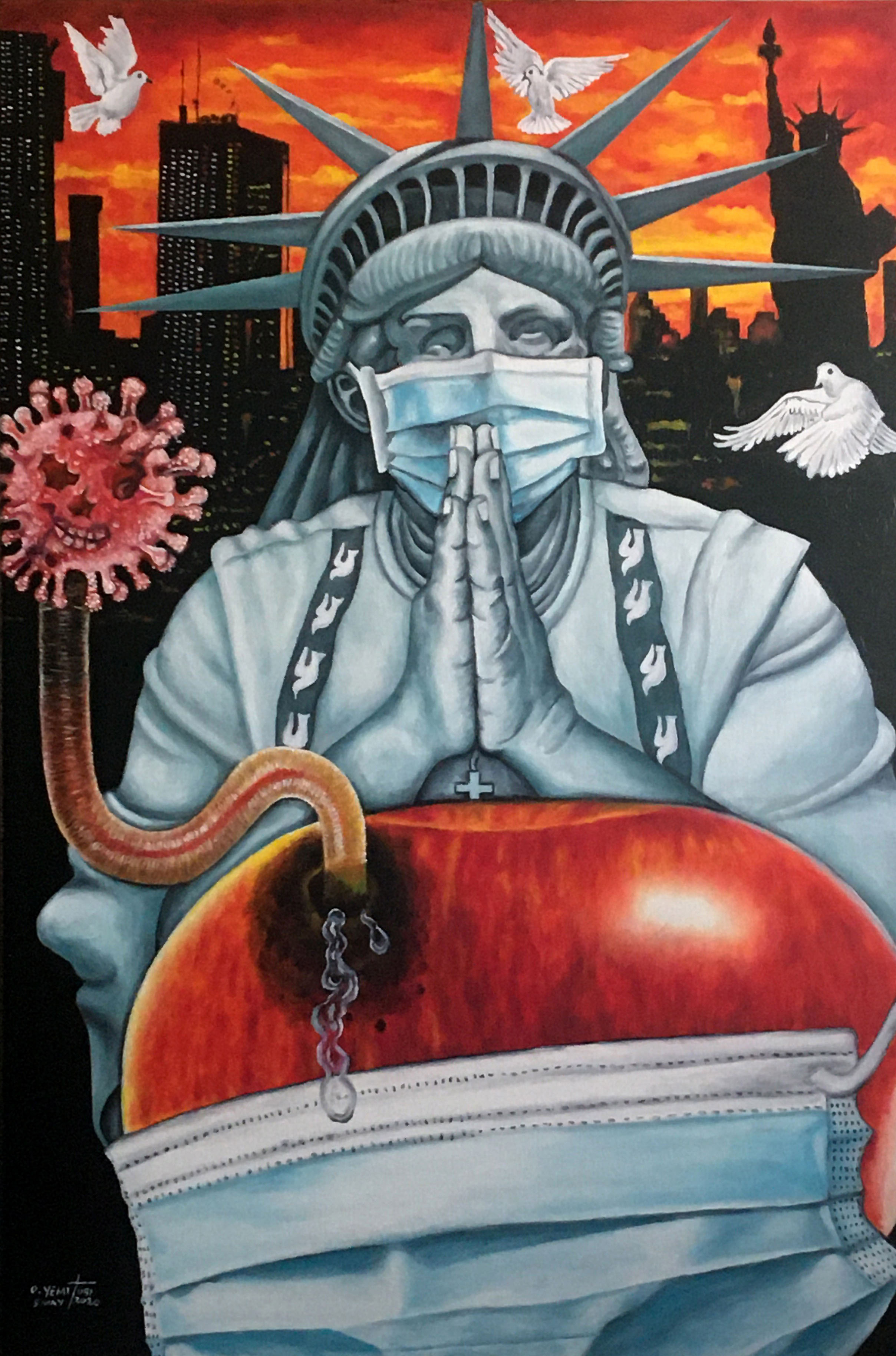 THE STATUE OF LIBERTY, ONE OF THE LANDSCAPES OF NEW YORK CITY; STANDING TALL AND PROUD WITH HER TORCH RAISED HIGH AS SHOWN IN THE CITYSCAPE AT THE BACKGROUND OF THIS PAINTING. SEEING HER CITY AND HER PEOPLE BEEN DEVOURED BY THE DEADLY WORM- CORONA VIRUS; AS A GRIEVING WOMAN, DROPPED HER TORCH, DROPPED HER TABLET AND DROPPED ON HER KNEES PRAYING FOR THE SOULS OF THE DEAD AND THE SALVATION OF THE LIVING. THIS DEPICTS HER RESPONSE TO THE CALL OF GOD TO EVERYONE IN THE BIBLE QUOTATION AT THE TOP OF THIS STATEMENT. RUNNING DOWN THE ROTTEN SIDE OF THE APPLE ARE THE TEARS SHED IN MOURNING THE DEATH OF DEARLY LOVED DEPARTED SOULS.