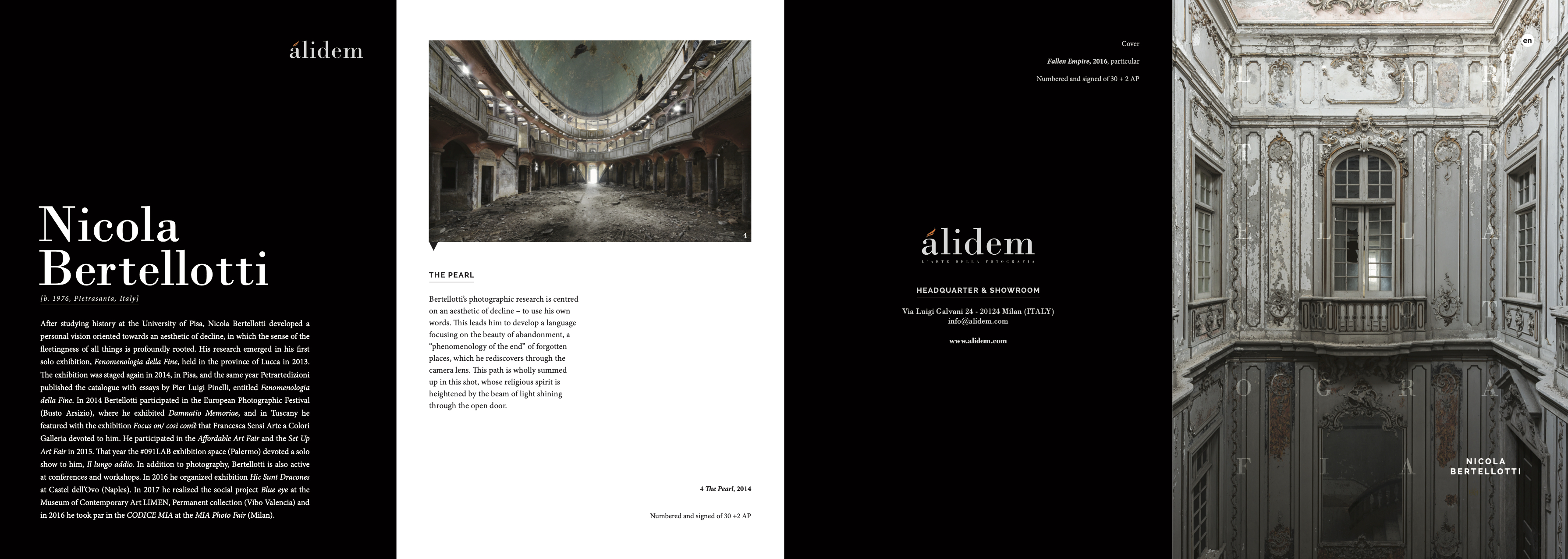 EN After studying history at the University of Pisa, Nicola Bertellotti developed a personal vision oriented towards an aesthetic of decline, in which the sense of the fleetingness of all things is profoundly rooted. His research emerged in his first solo exhibition, Fenomenologia della Fine, held in the province of Lucca in 2013. The exhibition was staged again in 2014, in Pisa, and the same year Petrartedizioni published the catalogue with essays by Pier Luigi Pinelli, entitled Fenomenologia della Fine. In 2014 Bertellotti participated in the European Photographic Festival (Busto Arsizio), where he exhibited Damnatio Memoriae, and in Tuscany he featured with the exhibition Focus on/ così com’è that Francesca Sensi Arte a Colori Galleria devoted to him. He participated in the Affordable Art Fair and the Set Up Art Fair in 2015. That year the #091LAB exhibition space (Palermo) devoted a solo show to him, Il lungo addio. In addition to photography, Bertellotti is also active at conferences and workshops. In 2016 he organized exhibition Hic Sunt Dracones at Castel dell’Ovo (Naples). In 2017 he realized the social project Blue eye at the Museum of Contemporary Art LIMEN, Permanent collection (Vibo Valencia) and in 2016 he took par in the CODICE MIA at the MIA Photo Fair (Milan). IT Dopo gli studi di storia presso l’Università di Pisa, Nicola Bertellotti elabora una personale visione orientata verso un’estetica della decadenza, in cui è profondamente radicato il senso di caducità di ogni cosa. La sua ricerca si concretizza nella prima mostra personale Fenomenologia della Fine che gli viene dedicata nel 2013 in provincia di Lucca. L’esposizione si ripete nel 2014, a Pisa, e nello stesso anno Petrartedizioni ne fa una pubblicazione con testi di Pier Luigi Pinelli. Nel 2014 prende parte al Festival Fotografico Europeo (Busto Arsizio) dove espone Damnatio Memoriae ed è protagonista in Toscana con la mostra Focus on/ così com’è che Francesca Sensi Arte a Colori Galleria gli tributa. Partecipa ad Affordable Art Fair e a Set Up Art Fair nel 2015. Nello stesso anno lo spazio espositivo #091LAB (Palermo) gli dedica la mostra personale Il lungo addio. Nicola Bertellotti è attivo nell’intervento a conferenze e workshop. Nel 2016 espone Hic Sunt Dracones a Castel dell’Ovo (Napoli). Nel 2017 realizza il progetto speciale Blue eye al Museo D’Arte Contemporanea LIMEN, Collezione Permanente (Vibo Valentia) e nel 2016 partecipa con CODICE MIA al Mia Photo Fair (Milano).