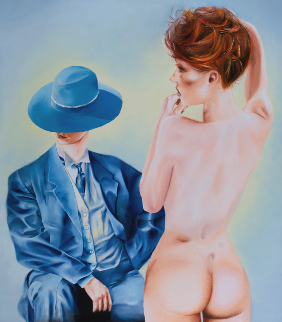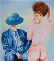 THE PAINTING DESCRIBES, AS THE TITLE SUGGESTS, A WOM- AN OFFERING HERSELF TO A MAN, HOWEVER HIS FACE IS ANNOYED, HIDDEN BY A HAT.