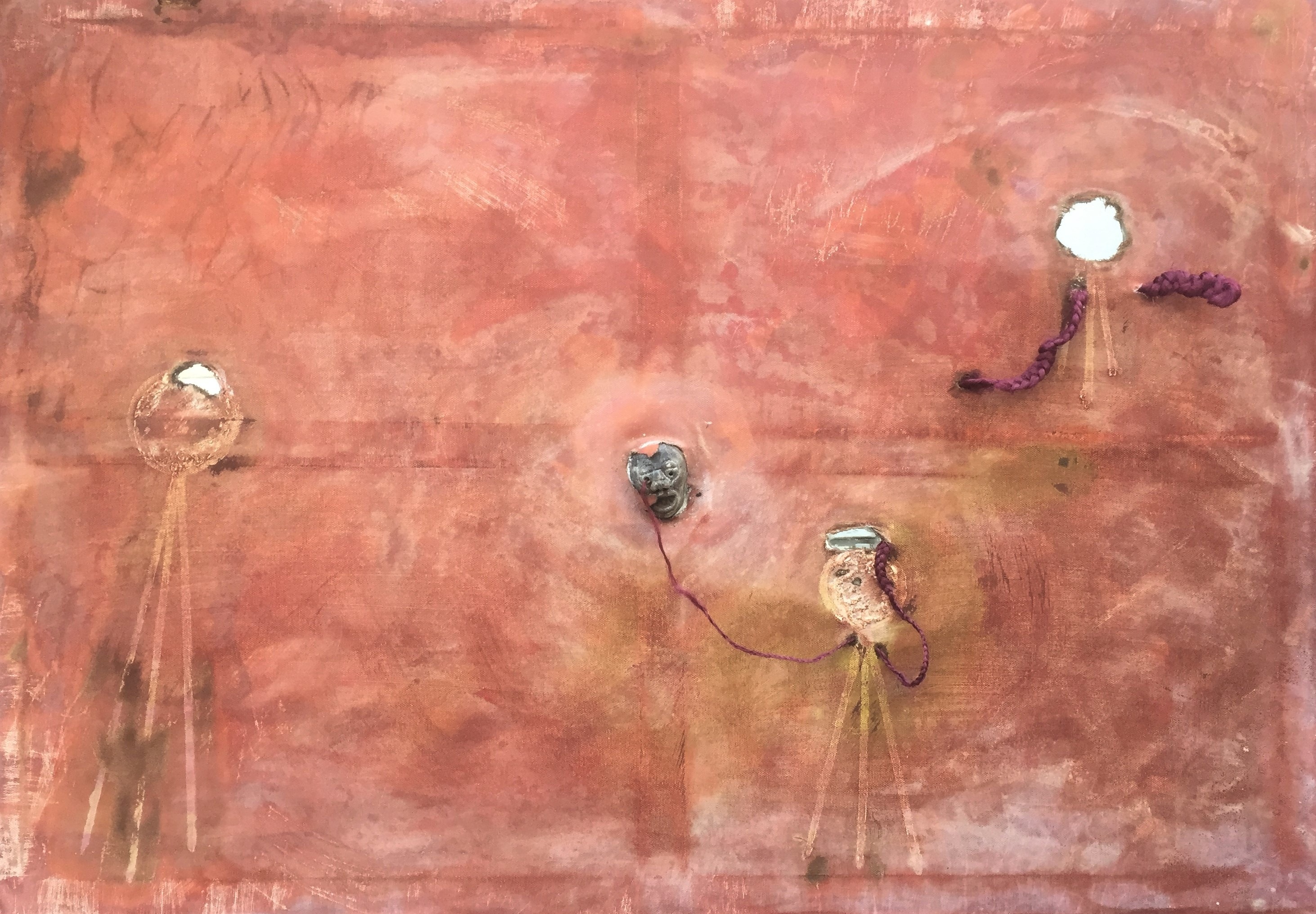 LIMITED BY A CENTRAL CROSS, A SUCCESSION OF PANELS OF SELF-MEMORY THAT PURSUE PAINTING AS A CROSSING OF SHAPES, COLORS AND IRIDESCENT LIGHT IN THE PIGMENTS OF DESERT SHADES. IN THE HOLE OF REALITY, THE MIRROR INCORPORATES THE PLAY OF THE GAZE OF INTIMATE ESTRANGEMENT BETWEEN BODY, I AND THE OTHER, AND LANGUAGE BECOMES INSTINCTUAL. THE UNFATHOMABLE DEPTH OF THE SUBJECT WEAVES THE TEMPTING DEMON THAT DOES NOT END IN THE EXTENSION OF CONSCIOUSNESS. IN A CIRCLE OF INDIVIDUATION LIGHT AND SHADOW, INSIDE-OUTSIDE-UP-ABOVE, AS IN A TRAP. LIMITATI DA UNA CROCE CENTRALE, UNA SUCCESSIONE DI RIQUADRI DELLA MEMORIA DI SÉ CHE INSEGUONO LA PITTURA COME ATTRAVERSAMENTO DI FORME, COLORI E LUCE CANGIANTE NEI PIGMENTI DELLE TONALITÀ DEL DESERTO. NEL BUCO DEL REALE LO SPECCHIO INCORPORA IL GIOCO DELLO SGUARDO D’INTIMA ESTRANEITÀ TRA CORPO, IO E ALTRO, E IL LINGUAGGIO SI FA PULSIONALE. LA PROFONDITÀ INSONDABILE DEL SOGGETTO INTESSE IL DEMONE TENTATORE CHE NON FINISCE NELL'ESTENSIONE DELLA COSCIENZA. IN UN CIRCOLO DI INDIVIDUAZIONE LUCE E OMBRA, DENTRO-FUORI-SOTTO-SOPRA, COME IN UNA TRAPPOLA. LIMITÉE PAR UNE CROIX CENTRALE, UNE SUCCESSION DE PANNEAUX DE MÉMOIRE DE SOI QUI POURSUIVENT LA PEINTURE COMME UN CROISEMENT DE FORMES, DE COULEURS ET DE LUMIÈRE IRISÉE DANS LES PIGMENTS DES NUANCES DÉSERTIQUES. DANS LE TROU DE LA RÉALITÉ, LE MIROIR INTÈGRE LE JEU DU REGARD DE L'ÉLOIGNEMENT INTIME ENTRE LE CORPS, LE MOI ET L'AUTRE, ET LE LANGAGE DEVIENT INSTINCTIF. LA PROFONDEUR INSONDABLE DU SUJET TISSE LE DÉMON TENTANT QUI NE SE TERMINE PAS DANS L'EXTENSION DE LA CONSCIENCE. DANS UN CERCLE D'INDIVIDUATION LUMIÈRE ET OMBRE, INTÉRIEUR-EXTÉRIEUR-HAUT-DESSUS, COMME DANS UN PIÈGE.