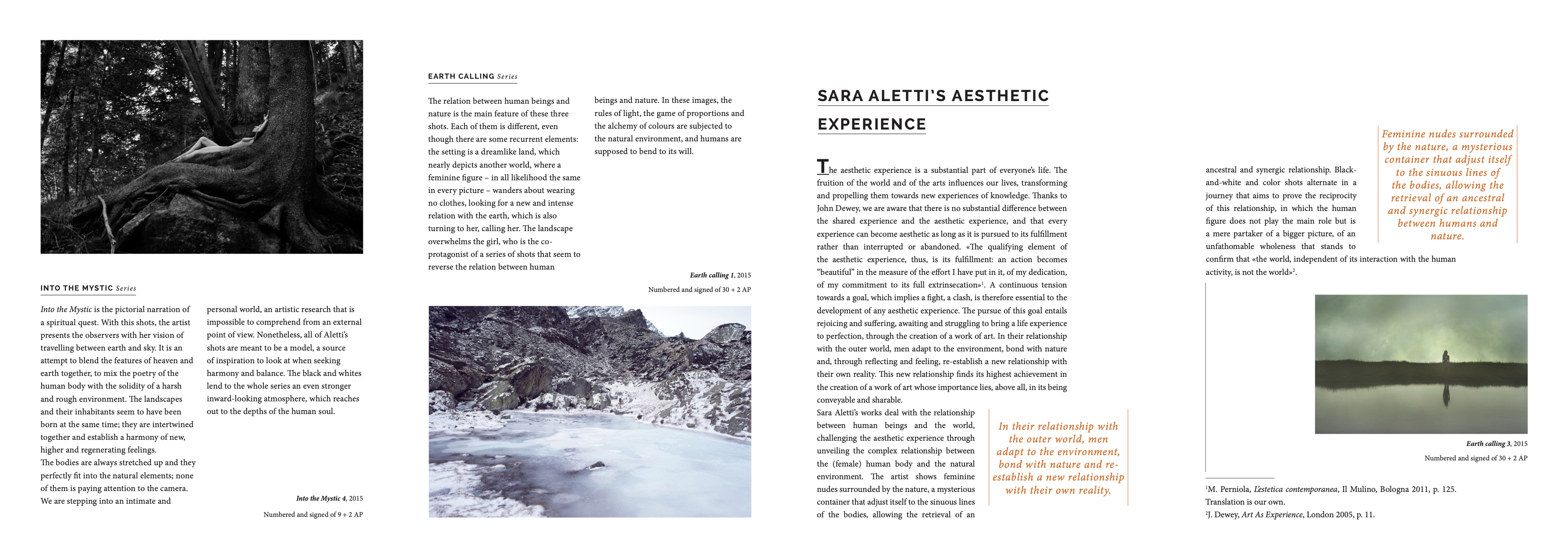 EN A young emerging talent, Sara Aletti gained momentum in the world of photography as a selflearned artist. She experimented various different genres and went through different artistic phases, gaining confidence about her artistic skills. Soon enough, her shots became as neat andwell-exposed as any professional photographer’s. This is when Aletti quits her artistic quest and specialises on one subject, which she feels more and more as her own: female nude. In her two series Just Her and Into the Mystic, female bodies are portrayed while laying on a bed of light or in the vastness of nature, conveying a powerful and sensual message. In the white bed sheets, naked bodies are stretching up or writhing, in a limbo where emotions swing between quietness and desperation: those looking at the image often cannot tell why the body portrayed has taken that position, and the question is left unanswered. Aletti never let us see her subjects’ face – that being the part of the body that reflects our emotions – and focuses on the body lines instead. In 2015, she finished Earth Calling, her best expression of a female nude surrounded by the wildness, a series where the female subject appears to the observers as she moves in the distance. Thanks to her talent, Sara Aletti achieved important goals and was awarded the first prize at the ARFFissima photo contest (in both 2014 and 2015). She was also offered the possibility of showing her project Into the Mystic in Turin, Italy on occasion of the exhibition Rewind-Rewild. IT Giovane talento emergente, Sara Aletti si fa strada nel mondo della fotografia da autodidatta. Sperimenta molti stili e passa attraverso diverse fasi: riesce così ad avere sempre più coscienza delle sue capacità artistiche. In poco tempo la nitidezza e l’esposizione degli scatti raggiungono livelli professionali. È il momento in cui la fotografa interrompe il suo lungo periodo di sperimentazione per concentrarsi su uno stile preciso, che l’artista sente sempre più suo:il nudo femminile. Nelle serie Just her e Into the Mystic, colto in posa su un letto di luce o sdraiato nella natura sconfinata, il corpo ritratto è un’immagine potente e sensuale. Tra le lenzuola bianche corpi nudi si allungano e si contorcono, in un limbo che oscilla tra il rilassamento e la disperazione: chi osserva non sempre riesce a riconoscere quale sia l’origine della posizione ritratta nello scatto e resta senza risposta. L’artista, infatti, non riprende mai le espressioni del viso, veicolo dell’emotività per eccellenza, in contrasto con l’importanza conferita alle linee del corpo. Nel 2015 segue la serie Earth calling, massima espressione del nudo in natura, in un contesto paesaggistico ancora più selvaggio, in cui il soggetto è ripreso mentre si muove in lontananza. Il talento, a cui sono seguiti grandi risultati, permette all’artista di ottenere riconoscimenti importanti come il primo posto del Concorso ARFFissima (2014 e 2015), oltre alla possibilità di presentare il progetto Into the Mystic a Torino, in occasione della mostra Rewind - Rewild.