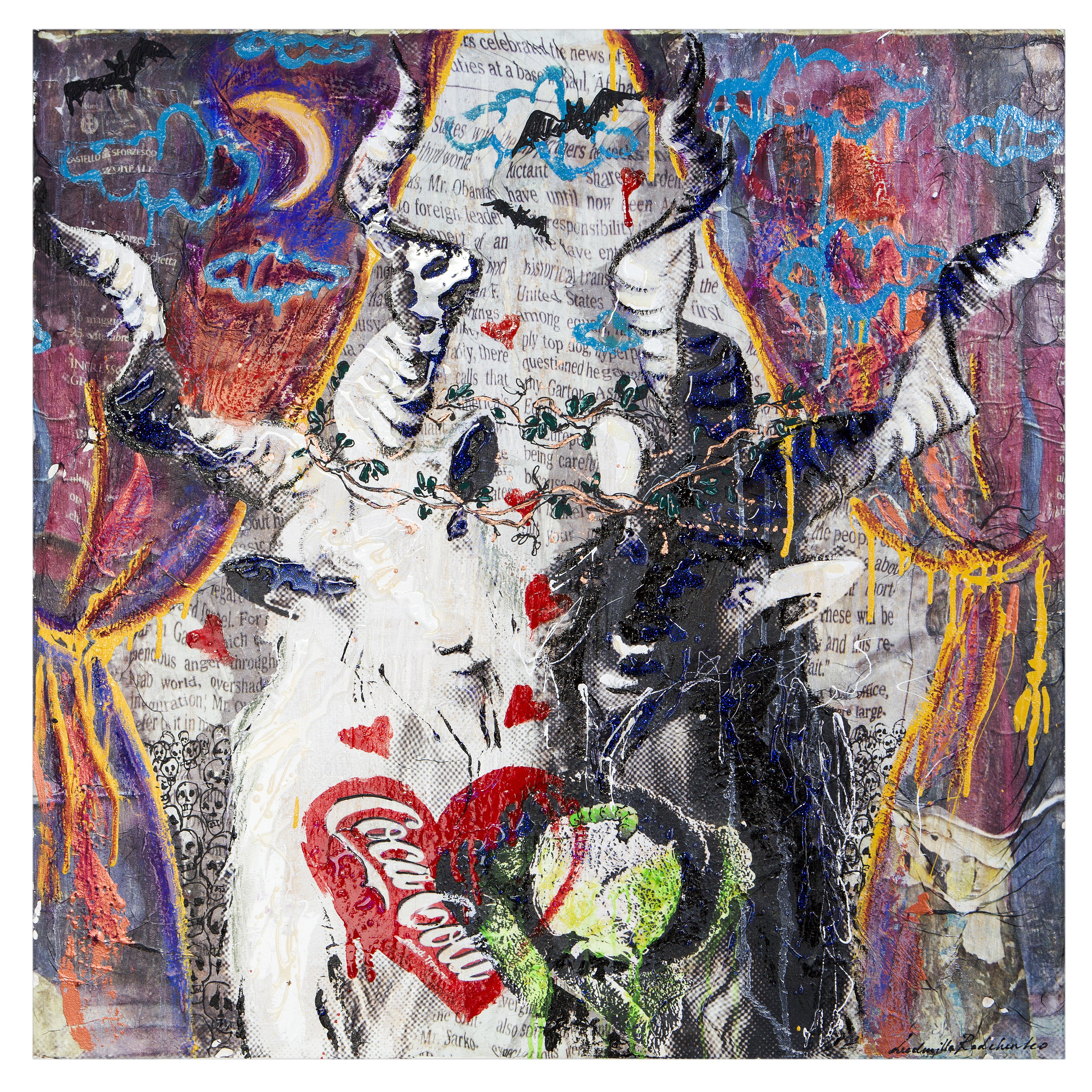 THEATRE DU CAPRON, 100X100. COLLAGE SU TELA , ACRILICO E RESINA. SERIE HUMAN SOCIETY, REALIZZATA NEL 2012. L'IDEA È ISPIRATA A OPERA DI GOYA " GRANDE CAPRONE". E LE CAPRE DELLA RADCHENKO SU NUTRONO DELLA BIBITA DI CONSUMO PIÙ POPOLARE - COCA COLA, OLTRE AL CAVOLO POSSEDUTO DAL BRUCO. I CAPRONI RAPPRESENTANO UN APPARATO POLITICO CHE ESIBISCE IN UNA SPECIE DEL TEATRO CON IL SIPARIO CREATO DALLE AFFISSIONI DELLA SCALA, E DIETRO L'OPERA SI VEDE IL PUBBLICO CHE NON HA PIÙ NE ANIMA NE PERSONALITÀ, NON SI ACCORGONO NEMMENO LORO CHE ORMAI, A FORZA DI SENTIRE I CAPRONI SONO DIVENTATI GLI SCHELETRI. THEATER DU CAPRON, 100X100. COLLAGE ON CANVAS, ACRYLIC AND RESIN. HUMAN SOCIETY SERIES, CREATED IN 2012. THE IDEA IS INSPIRED BY GOYA "GRANDE CAPRONE". AND RADCHENKO'S GOATS FEED ON THE MOST POPULAR CONSUMABLE DRINK - COCA COLA, IN ADDITION TO THE CABBAGE POSSESSED BY THE WORM. THE GOATS REPRESENT A POLITICAL APPARATUS THAT EXHIBITS IN A KIND OF THEATER WITH THE CURTAIN CREATED BY THE BILLBOARDS OF THE SCALA, AND BEHIND THE ARTWORK YOU CAN SEE THE PUBLIC WHO NO LONGER HAS A SOUL OR PERSONALITY, THEY DO NOT EVEN NOTICE THAT BY NOW, BY FORCE TO HEAR THE GOATS HAVE BECOME SKELETONS. MAKE YOUR PROPOSAL FOR THE PURCHASE OF THIS ARTWORK.