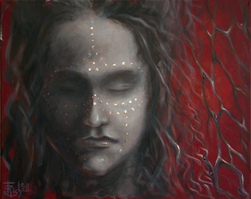 DREAMING, PORTRAIT, RED, FANTASY, MAGIC ART, SYMBOLISM, TRISH, ELENA MORGUN