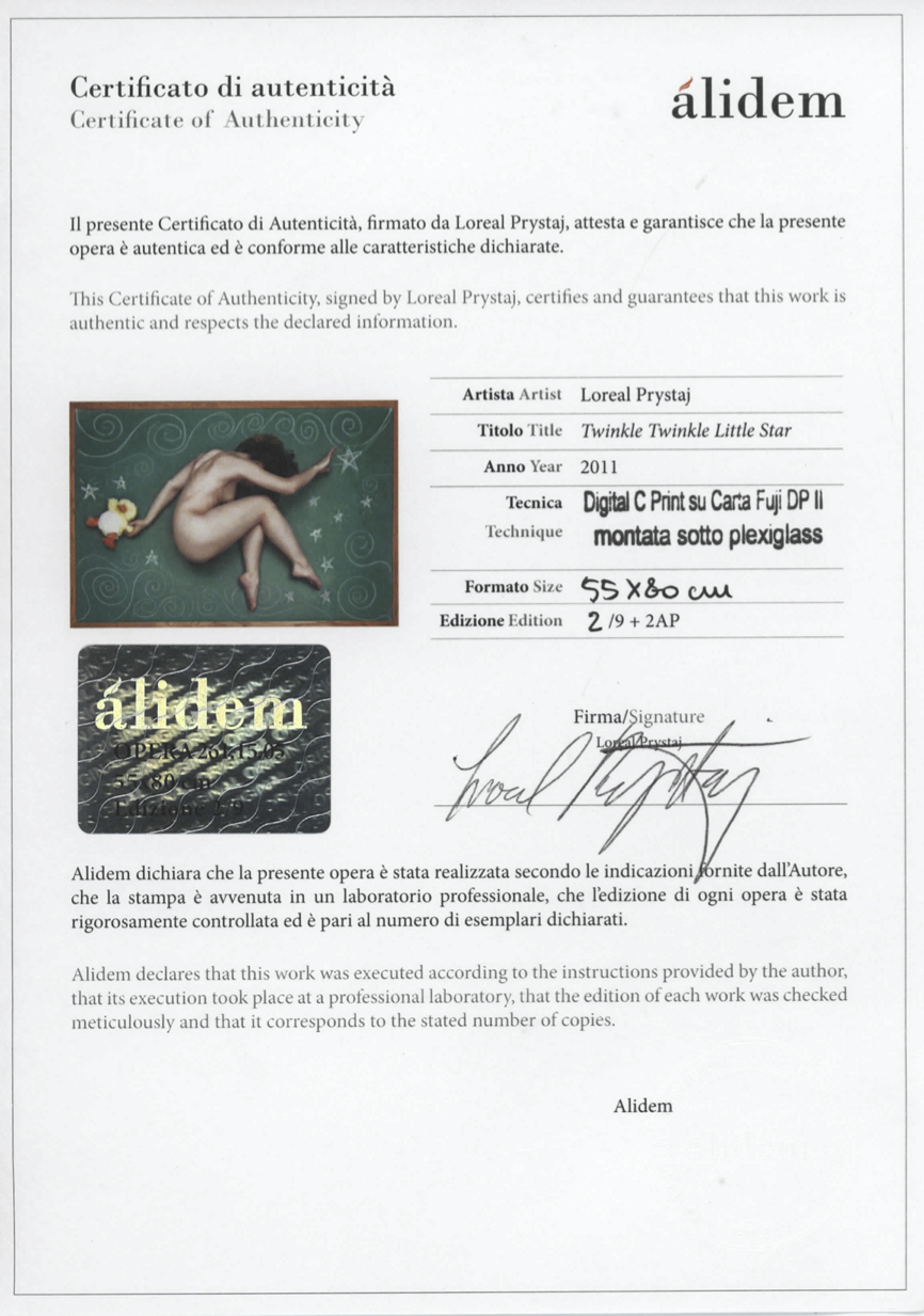 EN After completing her studies at the Fashion Institute of Technology in Manhattan, Loreal Prystaj earned a Bachelor of Fine Arts in photography. She began to show her works while still a student, when in 2009 she was featured at the collective exhibition Magic of Lights in gallery in Rochester (New York). The very young Prystaj first presented the Being series in 2011 at Middlebury, and then the following year in Pasadena (California). That year she was awarded first prize in photography by the ArtBuzz Collection (New York) and received honourable mention for best portfolio from Image City Photography Gallery in New York. In 2013, after being featured at exhibitions in Brooklyn and Manhattan, she went abroad and participated in the Pingyoa Art Exhibition (Pingyoa, China). In 2014 she was a featured artist at Photopalooza, staged at the Erie Art Museum (Pennsylvania), with the work Weightless Spaces from the Dark Fairytales series, which is now part of the museum’s permanent collection. Prystaj’s first solo exhibition was staged in Manhattan in 2015 and was devoted to the Being series. At the same time, she was selected for an artist-in-residence programme in Yamaguchi (Japan) at the Akiyoshidai International Art Village, which ended with the solo exhibition Yuと me夢. That year she was invited as Guest Artist for an event at Public.Factory in SoHo, where she displayed the Body and Bathworks series to accompany a new performance entitled Girl in a Tub. IT Al termine degli studi presso il Fashion Institute of Technology di Manhattan Loreal Prystaj riceve il Bachelor of Fine Art in fotografia. Intraprende la carriera espositiva ancora studentessa quando nel 2009 è tra i protagonisti della mostra collettiva Magic of Lights in una galleria di Rochester (New York). Giovanissima Loreal Prystaj presenta per la prima volta la serie Being nel 2011 a Middlebury e poi ancora l’anno successivo a Pasadena in California. Lo stesso anno riceve il primo premio per la fotografia da ArtBuzz Collection (NY) e la menzione per il miglior portfolio da Image City Photography Gallery di New York. Nel 2013 dopo essere stata protagonista a Brooklyn e Manhattan varca i confini americani e partecipa a Pingyoa Art Exhibition (Pingyoa Cina). Nel 2014 è tra i protagonisti di Photopalooza allestita presso l’Erie Art Museum (Erie Pennsylvania) con il lavoro Weightless Spaces della seria Dark Fairytales che è attualmente parte della collezione permanente del museo. La prima mostra personale è nel 2015 a Manhattan (NY) ed è dedicata alla serie Being. Parallelamente viene selezionata per una residenza d’artista a Yamaguchi (Giappone) presso l’Akiyoshidai International Art Village che si conclude con la solo exhibition Yuとme夢. Nello stesso anno è invitata come Guest Artist at Event in Public. Factory a SoHo dove espone la serie Body and Bathworks in accompagnamento all’inedita performance Girl in a Tub.