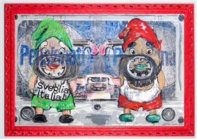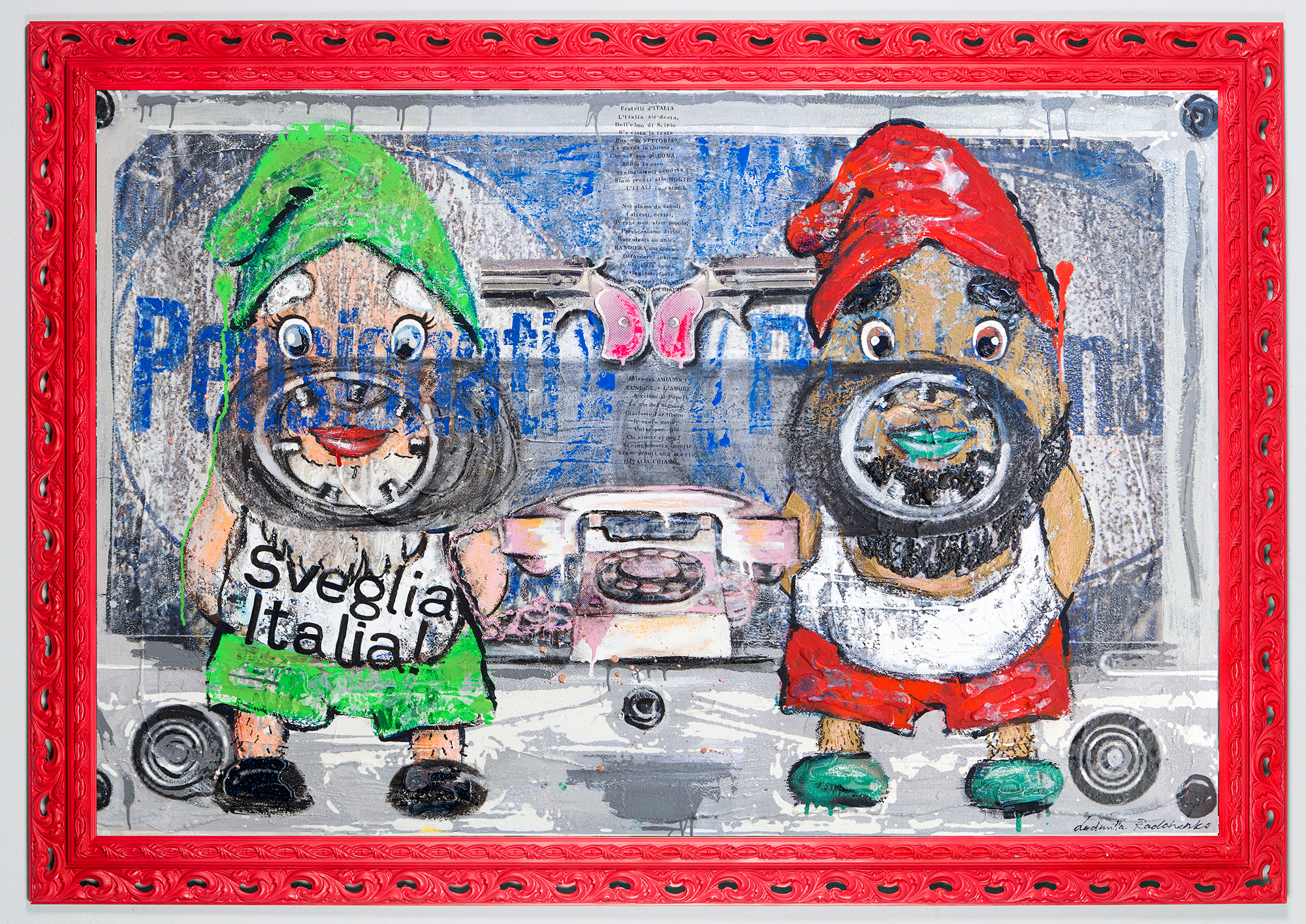 UDITUCCI SULLO SFONDO DELLA VECCHIA MUSICASSETTA- GIÀ ARCHEOLOGIA INDUSTRIALE- DUE NANI VESTITI DI VERDE E DI ROSSO COMPONGONO IL TRICOLORE. SUL BIANCO DI SFONDO SCORRONO QUALI TITOLI DI CODA DI UN FILM VISTO E RIVISTO LE PAROLE DEL NOSTRO INNO. ALLE LORO TEMPIE PUNTATE DUE PISTOLE, DALLA GIOCOSA IMPUGNATURA IN PLASTICA BUBBLE PINK, RIMANDO IMMEDIATO A QUELLE MANETTE DI PELUCHE USATE DA FIORUCCI IN UNA CAMPAGNA PUBBLICITARIA CHE FECE ALL’EPOCA SCALPORE. AI LORO PIEDI UN TELEFONO BIANCO. STUPISCE TROVARE NELLA RADCHENKO L’USO DI UNA IMMAGINE NON FACILMENTE DECODIFICABILE DALLA MAGGIOR PARTE DEI NOSTRI RAGAZZI. L’ITALIA DI OGGI- RIMASTA IN MUTANDE- SI CONFRONTA CON LA FOTOGRAFIA CHE NE FECE CAMERINI NEL CINEMA DEI “TELEFONI BIANCHI”: UN’ITALIA RINNOVATA URBANISTICAMENTE ED ANIMATA DA GRANDI OPERE PUBBLICHE NELLO SPIRITO RAZIONALISTA DEL BAUHAUS, UN’ITALIA CHE ASSAPORAVA I PRIMI FERMENTI INDUSTRIALI, GLI AGI DI UN CONSUMISMO A VENIRE E LONTANA DALLA CUPA ATMOSFERA DELLA MARCIA SU ROMA. UN’ITALIA CHE SI PREPARAVA ALL’IMPERO E ALLA SUA DRAMMATICA FINE NELLA SECONDA GUERRA MONDIALE SI CONFRONTA CON QUELLA DELLE OPERE MANCATE (IL PONTE SULLO STRETTO, LA BANDA LARGA) E CON IL MANCATO ORGOGLIO DI UNA IDENTITÀ NAZIONALE.