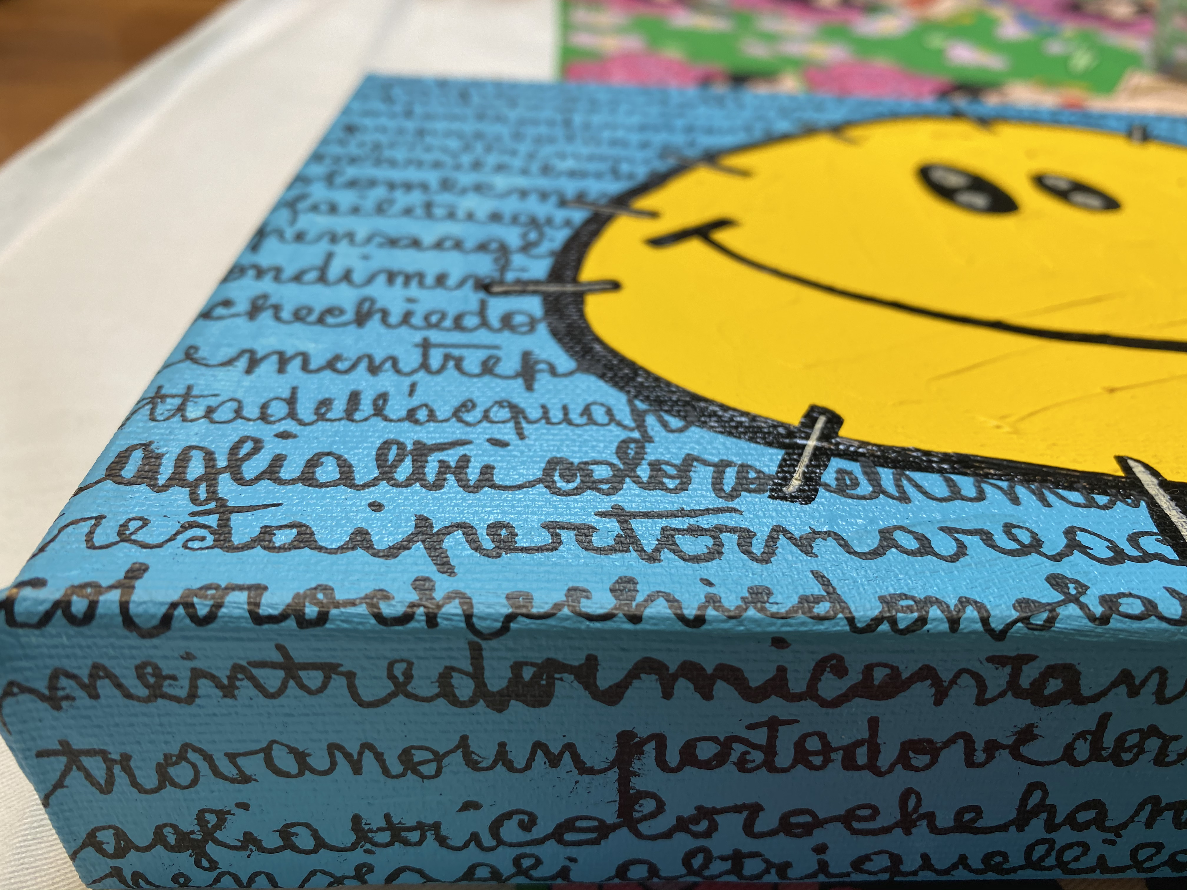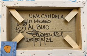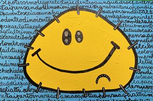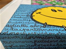 UN SOLEAPATATA (CHE È UN MARCHIO REGISTRATO DE LO ZOO DI SIMONA), SORRIDENTE ED ILLUINANTE, CHE RACCONTA, SULLO SFONDO, UNA POESIA DI MAHMOUD DARWISH IN CONCOMITANZA CON I BOMBARDAMENTI A GAZA DEL MAGGIO 2021. UN MESSAGGIO VISUALE E FIGURATIVO FORTE RISPETTO ALLA TREMENDA SITUAZIONE DELLA PALESTINA.