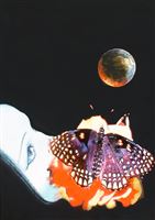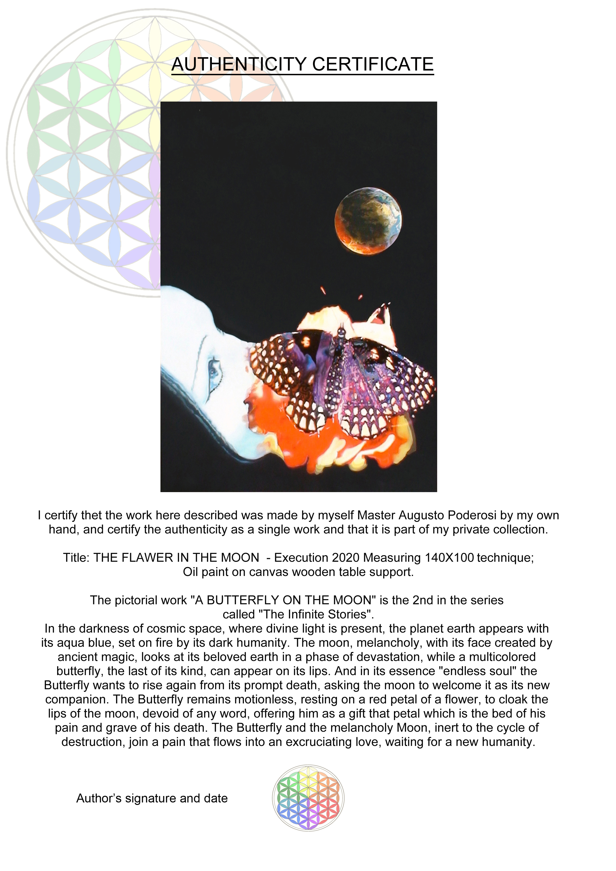 L’OPERA PITTORICA “UNA FARFALLA SULLA LUNA” È LA 2° DELLA SERIE DETTA “LE STORIE INFINITE”. NELL’OSCURITÀ DELLO SPAZIO COSMICO, DOVE LA LUCE DIVINA È UNI PRESENTE, IL PIANETA TERRA APPARE CON IL SUO AZZURRO ACQUEO, INCENDIATA DALLA SUA UMANITÀ OSCURA. LA LUNA, MALINCONICA, CON IL SUO VISO CREATO DA UNA MAGIA ANTICA, GUARDA LA SUA AMATA TERRA IN FASE DI DEVASTAZIONE, MENTRE UNA FARFALLA MULTICOLORE, L’ULTIMA DELLA SUA SPECIE, SI POSSA SULLE SUE LABBRA. E NELLA SUA ESSENZA “ANIMA SENZA FINE” LA FARFALLA DALLA SUA PRONTA MORTE VUOLE RISORGERE, CHIEDENDO ALLA LUNA DI ACCOGLIERLA COME SUA NUOVA COMPAGNA. LA FARFALLA RIMANE IMMOBILE, POSATA SU UN PETALO ROSSO DI UN FIORE, AD AMMANTARE LE LABBRA DELLA LUNA, PRIVA DI OGNI PAROLA, OFFRENDOGLI COME DONO QUEL PETALO CHE È GIACIGLIO DEL SUO DOLORE E TOMBA DELLA SUA MORTE. LA FARFALLA E LA MALINCONICA LUNA, INERTI AL CICLO DELLA DISTRUZIONE SI UNISCONO AD UN DOLORE CHE SFOCIA IN UN AMORE STRAZIANTE, IN ATTESA DI UNA NUOVA UMANITÀ. L'OPERA È STATA PRESENTATA IN UNA MOSTRA FATTA DALLA FONDAZIONE AMEDEO MODIGLIANI PRESSO IL MUSEO “FONDAZIONE FRANCO ZEFFIRELLI” A FIRENZE (DOCUMENTAZIONE IN ALLEGATO) E IN DIVERSE ESPOSIZIONI ONLINE.