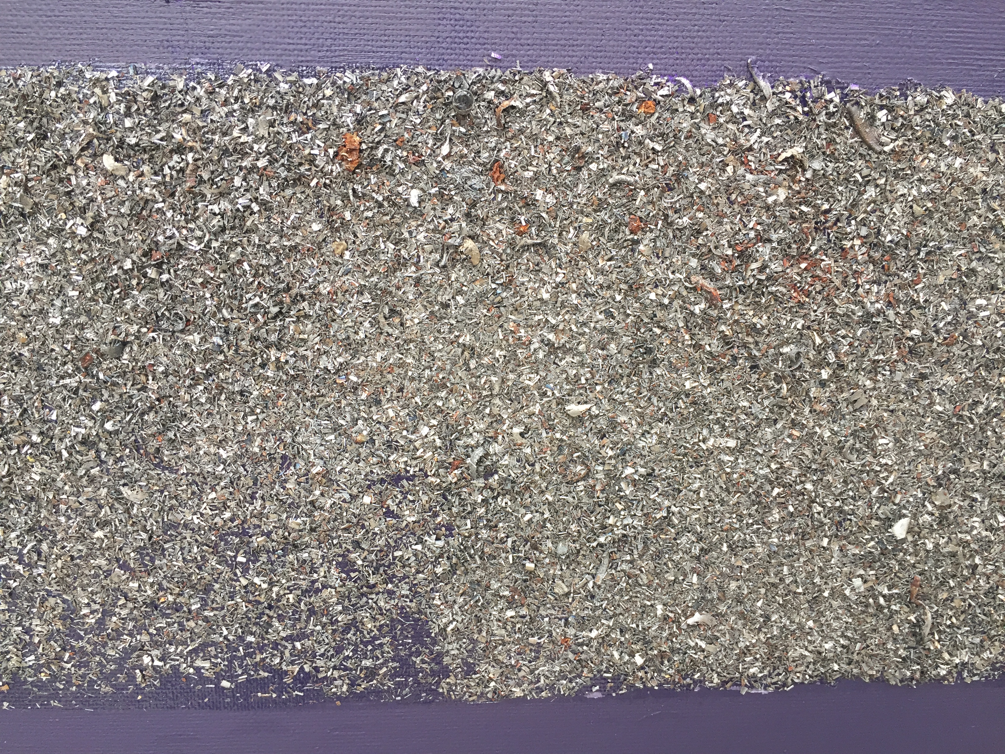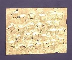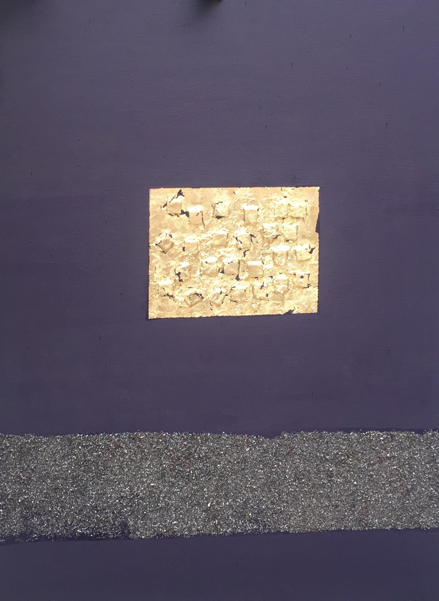 3 DISTINGUISHABLE ELEMENTS IN THE WORK: - THE BACKGROUND: A STRONGLY SATURATED PURPLE TONE, AS A MEASURE OF PURITY AND INTENSITY OF THE SPACE THAT ASPIRES TO GRANT SERENITY AND ELEVATION TO THE GAZE; - IN THE FOREGROUND, ABOVE, GOLD LEAVES THAT CONCEAL MEGALITHIC ARCHITECTURE; - BOTTOM: A GROUND PLANE IN ITS PROGRESS RUSTING. DOMINANT SIGNS THAT WORDS CANNOT CROSS, AND THAT - LIKE A MATCH - CAN UNEXPECTEDLY IGNITE THE ENTERPRISE OF LIVING IN THE DARK. 3 ELEMENTI DISTINGUIBILI NEL LAVORO: - LO SFONDO: UN TONO DI VIOLA FORTEMENTE SATURATO, COME MISURA DI PUREZZA E INTENSITÀ DELLO SPAZIO CHE ASPIRA A CONCEDERE SERENITÀ ED ELEVAZIONE ALLO SGUARDO; - IN PRIMO PIANO, IN ALTO, FOGLIE D’ORO CHE CELANO ARCHITETTURE MEGALITICHE; - IN BASSO: UN PIANO TERRENO NEL SUO PROGREDIRE ARRUGGINIRSI. SEGNI DOMINANTI CHE LE PAROLE NON POSSONO ATTRAVERSARE, E CHE - COME UN FIAMMIFERO - POSSONO ACCENDERE INASPETTATAMENTE NEL BUIO L’IMPRESA DI VIVERE. 3 ÉLÉMENTS DISTINCTIFS DANS L'ŒUVRE: - LE FOND: UN TON VIOLET FORTEMENT SATURÉ, COMME MESURE DE LA PURETÉ ET DE L'INTENSITÉ DE L'ESPACE QUI ASPIRE À ACCORDER SÉRÉNITÉ ET ÉLÉVATION AU REGARD; - AU PREMIER PLAN, AU-DESSUS, DES FEUILLES D'OR QUI CACHENT L'ARCHITECTURE MÉGALITHIQUE; - EN BAS: UN PLAN DE MASSE DANS SA PROGRESSION ROUILLE. SIGNES DOMINANTS QUE LES MOTS NE PEUVENT PAS SE CROISER ET QUI - COMME UNE ALLUMETTE - PEUVENT ENFLAMMER DE FAÇON INATTENDUE L'ENTREPRISE DE VIVRE DANS L'OBSCURITÉ.