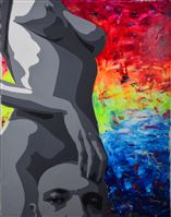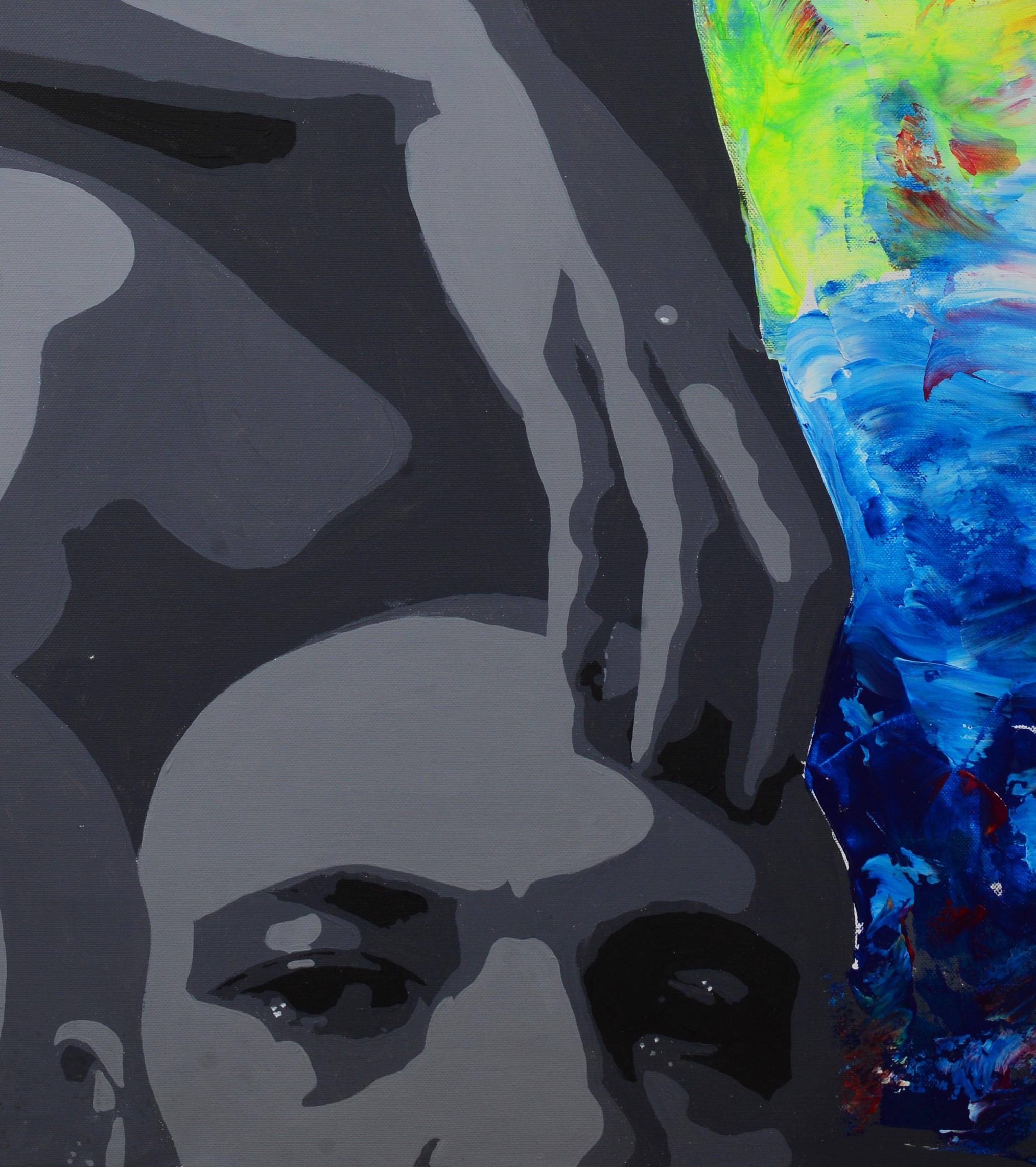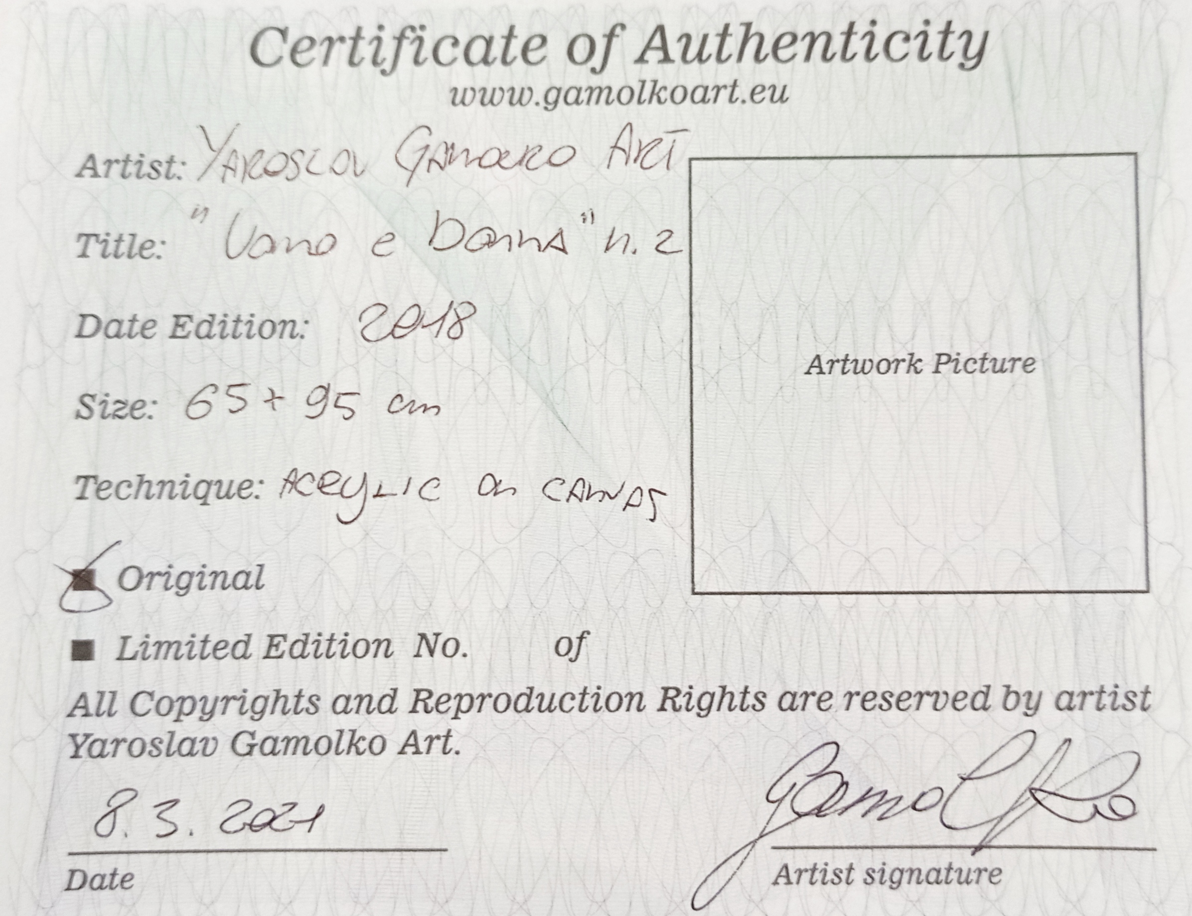 TUTTI E TRE GLI SCOMPARTI AFFRONTANO IL SOGGETTO BINARIO DEI PROGENITORI ADAMO ED EVA; IL PRIMO È RAPPRESENTATO COME UNA TESTA RASATA DISPOSTA A COPRIRE LE VERGOGNE DEL CORPO FEMMINILE ED È IL RITRATTO DI UN AMICO DELL'ARTISTA, DI ORIGINI ITALIANE, CHE VIVE IN BIELORUSSIA; L'ARCATA ORBITALE E ANCHE UNA D ROVESCIATA, INIZIALE DEL SUO NOME. IN QUESTO DIPINTO LA DONNA , DISPOSTA DI PROFILO SPECULARMENTE AL TERZO SCOMPARTO, È RIVOLTA DA SINISTRA VERSO DESTRA, APPOGGIA LA MANO DESTRA SULLA CALOTTA CRANICA DELL'UOMO, OFFRENDO IL FRUTTO DELLA CONOSCENZA DEL BENE E DEL MALE, COME LA TESTA STESSA DELL'UOMO FOSSE LA MELA DEL PARADISO TERRESTRE, QUASI A SANCIRE NELL'ATTO DELLA RELAZIONE AMOROSA TRA IL SUO CORPO NELLA MENTE DELL'UOMO - UN VERO E PROPRIO ATTO DI ROTTURA E DI LIBERAZIONE: ROTTURA IN QUANTO SPEZZA IL DIVIETO E LA SERRATURA DELL'IMENTE, GENERANDO, NEL BENE E NEL MALE, UNA CONOSCENZA RECIPROCA DELLE DUE REALTÀ ETEROGENEE DEL MASCHILE E DEL FEMMINILE, CHE PRIMA ERA IN ATTO, MA SOLO IN POTENZA. IL TUTTO È ANIMATO DA FORZE DINAMICHE CHE, ATTRAVERSO IL GESTO TATTILE DELLA SPATOLA, CHE MESCOLA COLORI BRILLANTI SUL SUPPORTO, RENDONO TANGIBILI LE LINEE DI FORZA CHE SONO ALLA BASE DELLA DISPERSIONE DI ENERGIE LIBERATE DA QUESTO INCONTRO. L'IRRUZIONE DELLE CAMPITURE GRIGIE SU QUESTO SFONDO IRIDATO E VERSICOLORE È LA FISSAZIONE, L'IMPENSATA FORZA DI UN LEGAME CHE TUTTO RIORDINA SUBORDINANDOLO A SÈ, E RINNOVA L'UNIVERSO IN UN RAPPORTO DI FORZE AFFILATE, CHE RIDUCONO L'INSENSATA E INFORME FURIA PRICHEDELICA DEI COLORI A UN SEGNO SIGNIFICANTE, IDEOGRAMMATICO, CHE DIVENTA LA CIFRA ESPRESSIVA DEL TRITTICO, DECLINATA IN TRE DIVERSE SCRITTURE, QUASI UNA RIENTERPRETAZIONE DEL LIBRO DELLE TRE SCRITTURE (1274 CA.), OPERA DI BONVESIN DE LA RIVA, PRECURSORE DI DANTE E PRIMO CANTORE DELLE GRANDEZZE DELLA CITTÀ DI MILANO, ALLA QUALE ANCHE YAROSLAV VUOLE FARE RIFERIMENTO IN UN'ALTRA SUA OPERA MONUMENTALE DAL TITOLO "MILANO MINSK".