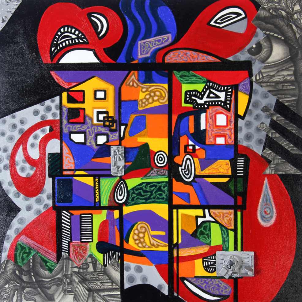 ASSEMBLAGE COM LEVE INSPIRAÇÃO CUBISTA ONDE HÁ A DESCONSTRUÇÃO DA IMAGEM DE CARROS,PRÉDIOS,SOBREPOSIÇÃO DAS MESMAS E CORES COMPLEMENTARES. COM FORTE INFLUÊNCIA DA COR VERMELHA SALIENTADO O DERRAMAMENTO DE SANGUE E VIOLÊNCIA NA METRÓPOLE PAULISTANA A OBRA FOI CONCEBIDA NUM PERÍODO SOMBRIO DE ATAQUES DE CRIMINOSOS. A LÁGRIMA E A DESCONSTRUÇÃO DO DESENHO SURREAL FEITO NO PAPEL CANSON NOS FAZ REFLETIR SOBRE AS PERSPECTIVAS DO NOSSO DIA A DIA NA URBE.
