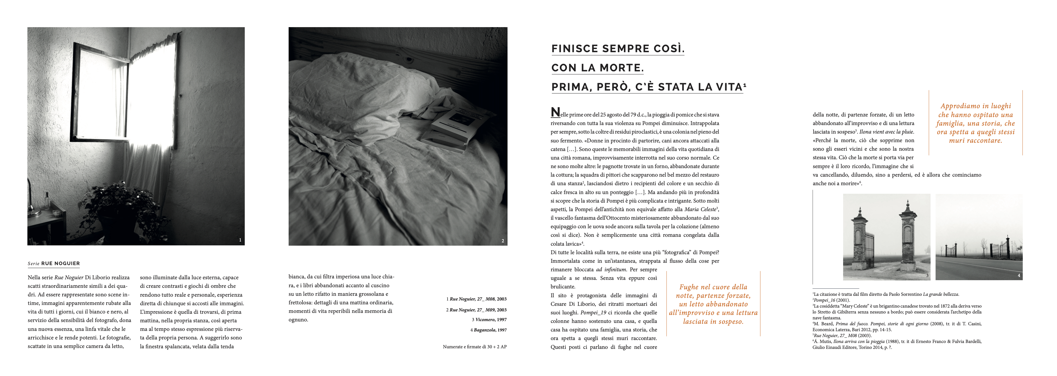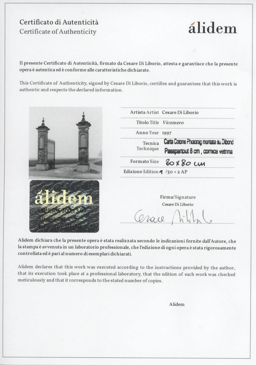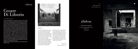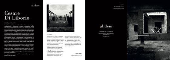 EN An amateur photographer since the 80s, Cesare di Liborio was born in Reggio Emilia, where, as a young man, he developed a great passion for a peculiar form of art: the black and white photography. Di Liborio, after exhibiting in several solo and collective shows, both in Italy and abroad, was invited by Michèle Moutashar to expose his Les colonnes d’Hercules at the Muséè Reattu in Arles, on the occasion of XXXI Rencontres Internationales de la Photographie. From that moment, his career flourished: his work was shown in Bruxelles, at the European Parliament, in 2001; he was also featured in an exhibition in Alexandria (Egypt) during the Festival méditerranéen d’Alexandrie. In 2005, he participated in FIAC (Fiera Internazionale d’Arte Contemporanea), Paris, exposing his Pallas. After exposing his series Les Colonnes d’Hercules at the Photography Museum of Seoul, Di Liborio finished his project Appena prima di..., focused on capturing the moment that comes right before an event, which was exhibited in 2014 in Arles. Cesare Di Liborio’s shots have been published and exposed several times, and are currently part of the photography collections of some of the world’s finest cultural institutions, such as the J. Paul Getty Museum, Los Angeles (USA). Moreover, his pictures are part of the collections of the Bibliotheque Nationale de France, Parigi Musée Reattu (Arles, France), of the Musée de la Photographie (Charleroi, Belgium) and of the Maison Européenne de la Photographie (Parigi, Francia). Prestigious authors, such as Jacques Le Goff and Italo Zannier, have dedicated many publications to him IT Fotografo amatoriale dai primi anni Ottanta, Cesare di Liborio nasce a Reggio Emilia dove all’età di vent’anni inizia a sviluppare un’innata passione per una particolare forma artistica: la fotografia in bianco e nero. Dopo aver esposto i suoi scatti in mostre personali e collettive, in Italia e all’estero, viene invitato da Michèle Moutashar a proporre il suo lavoro dal titolo Les colonnes d’Hercules al Musée Reattu di Arles, in concomitanza del XXXI Rencontres Internationales de la Photographie. È il momento più florido della sua carriera: nel 2001 i suoi scatti sono in mostra a Bruxelles, presso la sede del Parlamento Europeo; segue l’esposizione ad Alessandria d’Egitto in occasione del Festival méditerranéen d’Alexandrie. Il 2005 è l’anno della sua partecipazione alla FIAC (Fiera Internazionale d’Arte Contemporanea) di Parigi con l’opera Pallas. Dopo l’invito da parte del Photography Museum of Seoul ad esporre la serie Les Colonnes d’Hercules, Di Liborio sviluppa il progetto Appena prima di..., basato sull’idea dell’attimo che precede un evento, che sarà esposto nel 2014 ad Arles. Oltre alle innumerevoli pubblicazioni ed esposizioni, di cui qui viene elencata solo una piccola parte, l’artista vanta il privilegio di vedere numerosi suoi scatti con- servati in musei e archivi di tutta Europa, tra i quali spicca anche il J. Paul Getty Museum di Los Angeles. Le sue fotografie sono inoltre conservate nelle collezio- ni della Bibliotheque Nationale de France, Parigi Musée Reattu (Arles, Francia), del Musée de la Photographie (Charleroi, Belgio) e della Maison Européenne de la Photographie (Parigi, Francia). Diverse pubblicazioni sono state a lui dedicate con firme molto prestigiose come Jacques Le Goff e Italo Zannier.