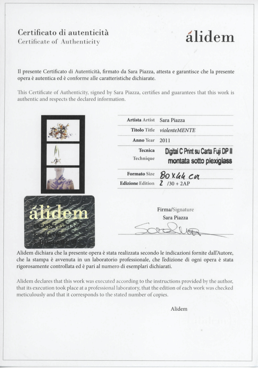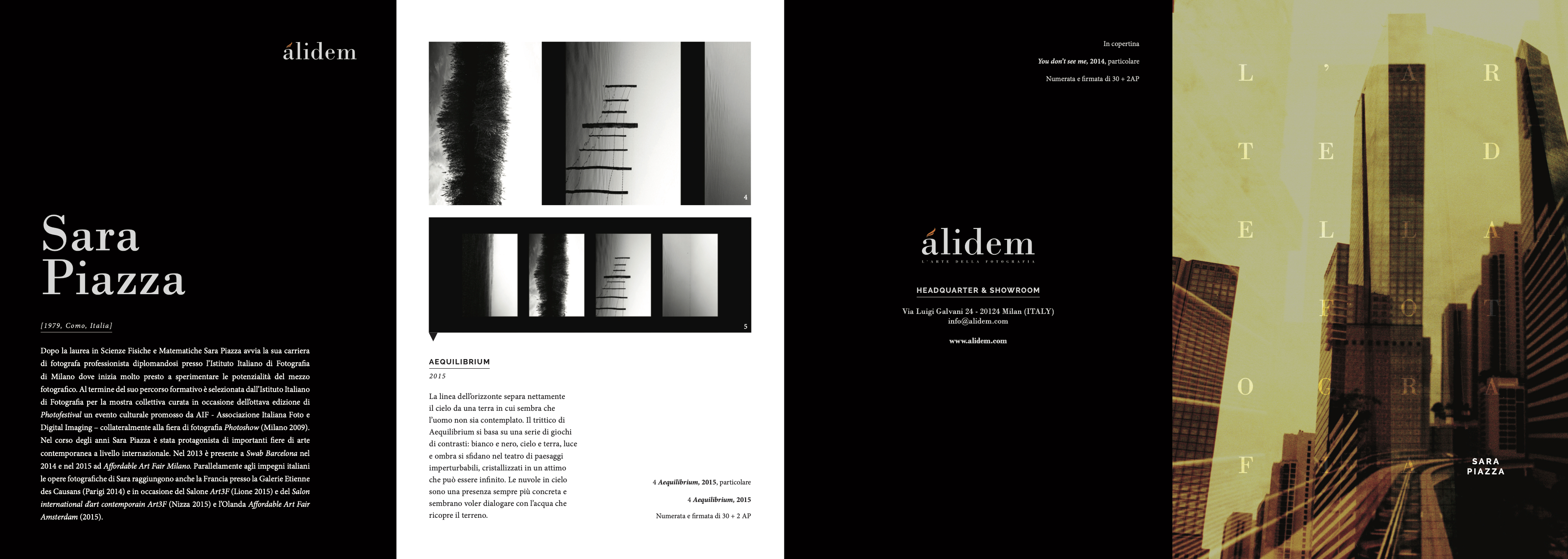 EN After graduating in Physics and Math, Sara Piazza decided to attend the Istituto Italiano di Fotografia in Milan, in order to pursue a professional career in photography. At the IIF, she had a chance to experiment all the potentialities of the photographic medium. At the end of her studies, she was selected by the Istituto Italiano di Fotografia to feature in a collective show organised on occasion of the eight edition of Photofestival, a cultural event sponsored by AIF - Associazione Italiana Foto e Digital Imaging - and part of the photo fair Photoshow (Milan, 2009). In the following years, Sara Piazza participated in several international art fairs. In 2013, her work was staged at Swab Barcelona, in 2014 and 2015 at the Affordable Art Fair Milano. Her shots have also been shown in France, at the Galerie Etienne des Causans (Paris, 2014), on occasion of the Salone Art3F (Lyon, 2015) and the Salon international d’art contemporain Art3F (Nice, 2015), and in the Netherlands at the Affordable Art Fair Amsterdam (2015). IT Dopo la laurea in Scienze Fisiche e Matematiche Sara Piazza avvia la sua carriera di fotografa professionista diplomandosi presso l’Istituto Italiano di Fotografia di Milano dove inizia molto presto a sperimentare le potenzialità del mezzo fotografico. Al termine del suo percorso formativo è selezionata dall’Istituto Italiano di Fotografia per la mostra collettiva curata in occasione dell’ottava edizione di Photofestival un evento culturale promosso da AIF - Associazione Italiana Foto e Digital Imaging – collateralmente alla fiera di fotografia Photoshow (Milano 2009). Nel corso degli anni Sara Piazza è stata protagonista di importanti fiere di arte contemporanea a livello internazionale. Nel 2013 è presente a Swab Barcelona nel 2014 e nel 2015 ad Affordable Art Fair Milano. Parallelamente agli impegni italiani le opere fotografiche di Sara raggiungono anche la Francia presso la Galerie Etienne des Causans (Parigi 2014) e in occasione del Salone Art3F (Lione 2015) e del Salon international d’art contemporain Art3F (Nizza 2015) e l’Olanda Affordable Art Fair Amsterdam (2015).
