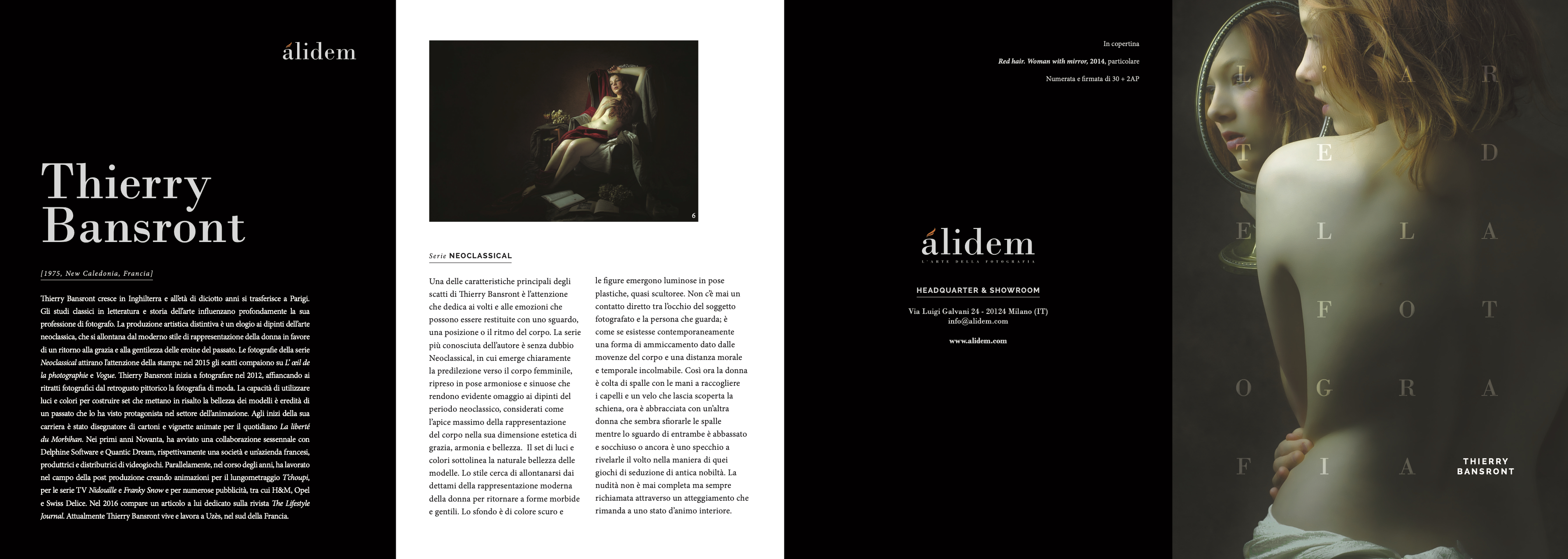 EN Thierry Bansront grew up in England and moved to Paris when he was 18. His studies of the classics in literature and art history profoundly influenced his profession as a photographer. Bansront’s distinctive artistic production is a tribute to neoclassical paintings, moving away from the modern style of representing women in favour of a return to the grace and genteel manners of the heroines of the past. The photographs from the Neoclassical series attracted the attention of the press, and in 2015 the pictures were published in L’œil de la photographie and Vogue. Bansront started taking pictures in 2012, flanking photo portraits with a pictorial air and fashion photography. His ability to use light and colours to construct sets that highlight the beauty of the models is a legacy from the past in which he played a leading role in the animation industry. At the start of his career he drew cartoons – both still and animated – for the daily La liberté du Morbihan. In the early Nineties he began a six-year collaboration with Delphine Software and Quantic Dream, respectively a French association and company that produce and distribute videogames. At the same time, over the years he worked in postproduction, creating animated works for the feature film T’choupi, the TV series Nidouille and Franky Snow, and various advertising campaigns, including those of H&M, Opel and Swiss Delice. Bansront currently lives and works in Usez, in southern France. IT Thierry Bansront cresce in Inghilterra e all’età di diciotto anni si trasferisce a Parigi. Gli studi classici in letteratura e storia dell’arte influenzano profondamente la sua professione di fotografo. La produzione artistica distintiva è un elogio ai dipinti dell’arte neoclassica, che si allontana dal moderno stile di rappresentazione della donna in favore di un ritorno alla grazia e alla gentilezza delle eroine del passato. Le fotografie della serie Neoclassical attirano l’attenzione della stampa: nel 2015 gli scatti compaiono su L’ œil de la photographie e Vogue. Thierry Bansront inizia a fotografare nel 2012, affiancando ai ritratti fotografici dal retrogusto pittorico la fotografia di moda. La capacità di utilizzare luci e colori per costruire set che mettano in risalto la bellezza dei modelli è eredità di un passato che lo ha visto protagonista nel settore dell’animazione. Agli inizi della sua carriera è stato disegnatore di cartoni e vignette animate per il quotidiano La liberté du Morbihan. Nei primi anni Novanta, ha avviato una collaborazione sessennale con Delphine Software e Quantic Dream, rispettivamente una società e un’azienda francesi, produttrici e distributrici di videogiochi. Parallelamente, nel corso degli anni, ha lavorato nel campo della post produzione creando animazioni per il lungometraggio T’choupi, per le serie TV Nidouille e Franky Snow e per numerose pubblicità, tra cui H&M, Opel e Swiss Delice. Nel 2016 compare un articolo a lui dedicato sulla rivista The Lifestyle Journal. Attualmente Thierry Bansront vive e lavora a Uzès, nel sud della Francia.