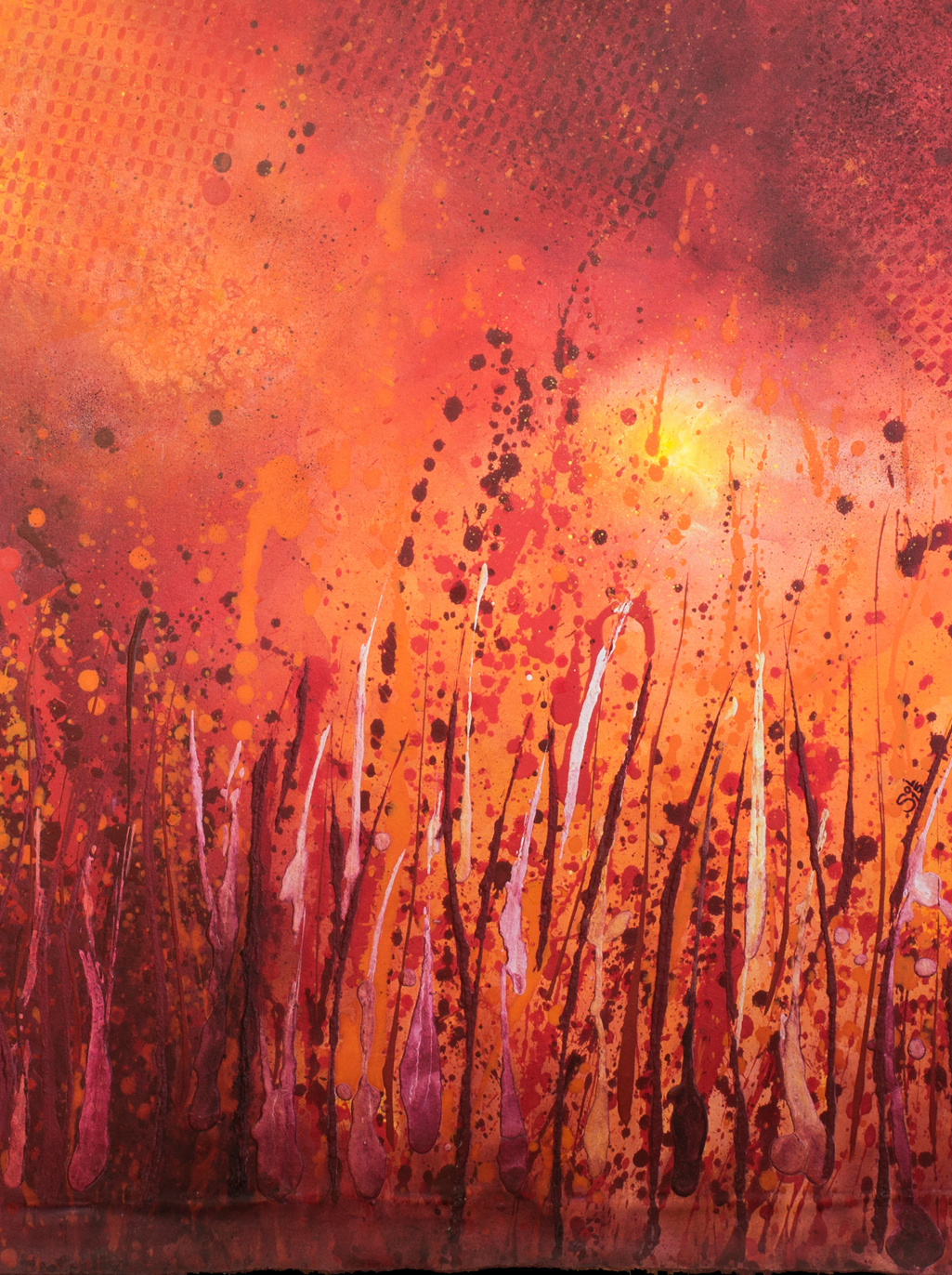OBRA ABSTRACTA FORMADA POR TRAMAS, MANCHAS Y LÍNEAS QUE SE SUPERPONEN DANDO LA SENSACIÓN DE QUE EL CUADRO NO TIENE LÍMITES AL EXTENDERSE SOBRE TODO EL ESPACIO DE LA TELA. COMPOSICIÓN LIBRE DE TRAZOS ENÉRGICOS, TRABAJADA SOBRE EL LIENZO SIN TENSAR, TÉCNICA DENOMINADA DRIPPING.