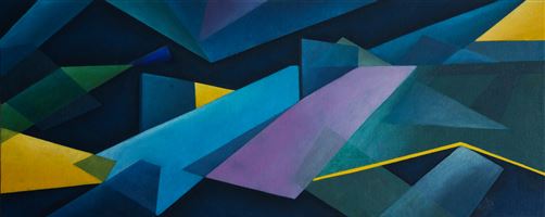 IT IS A GEOMETRIC ARTWORK THAT GENERATES DEPTH THROUGH THE OVERLAPPING PLANES. DEEPLY COLORED IT SEEMS TO HANG IN SPACE PLAYING WITH THE TRANSPARENCY.