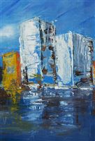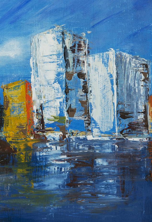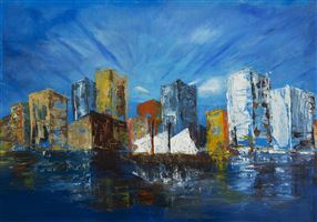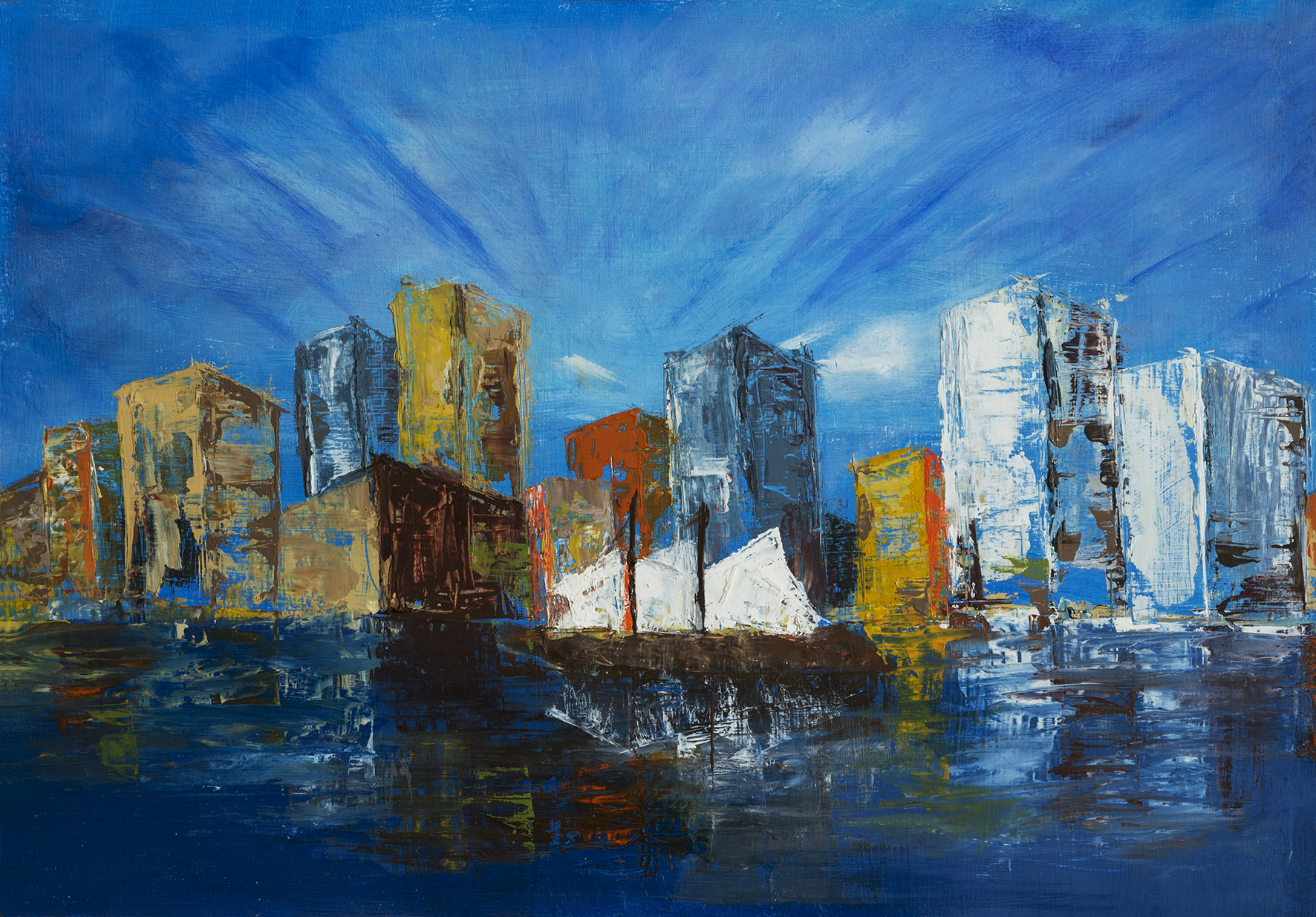 VISTA DE UNA CIUDAD DESDE EL AGUA DONDE SE REFLEJAN LOS EDIFICIOS. TRABAJO HECHO EN OLEO CON ESPATULA.
