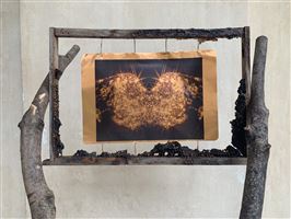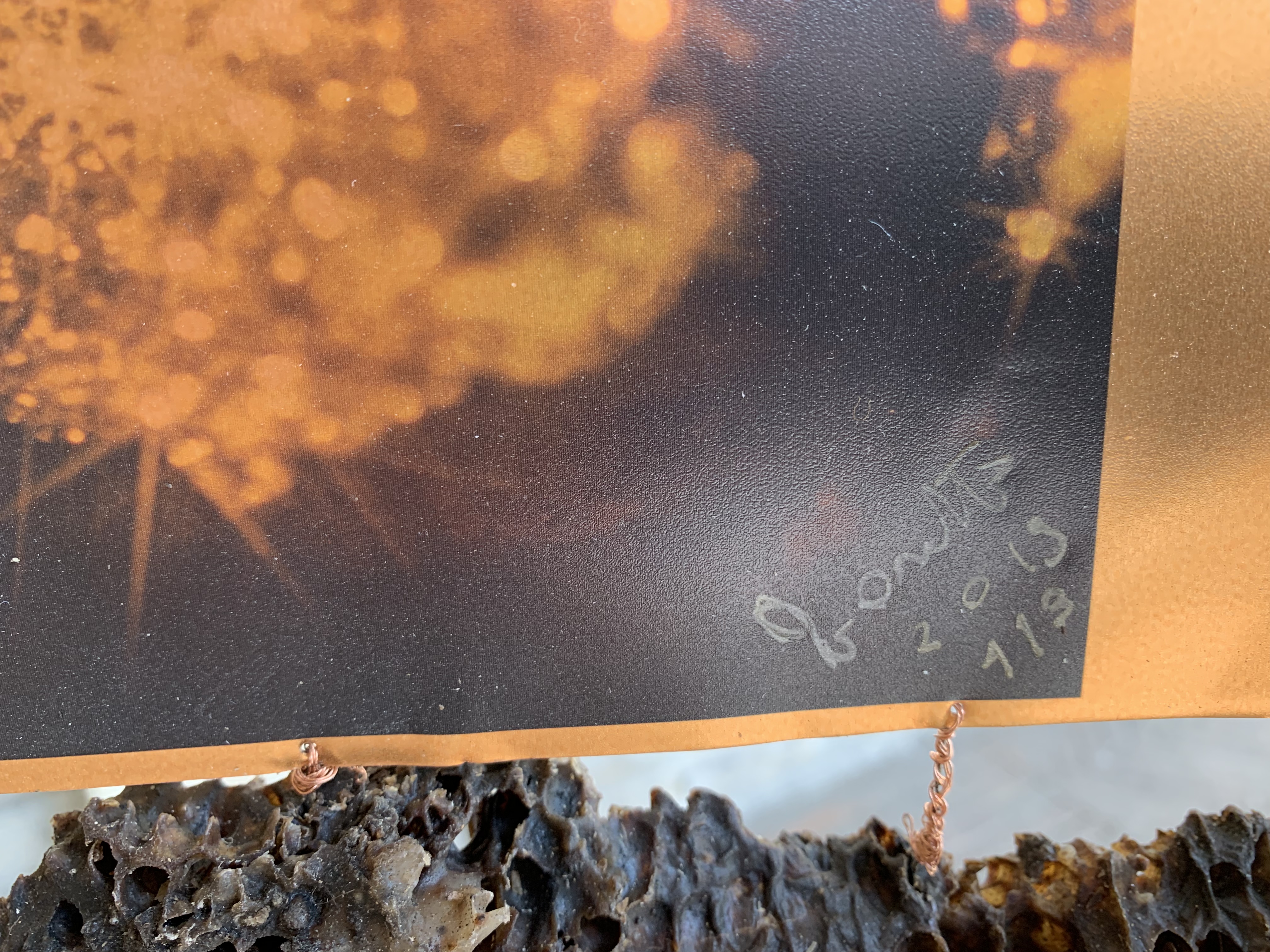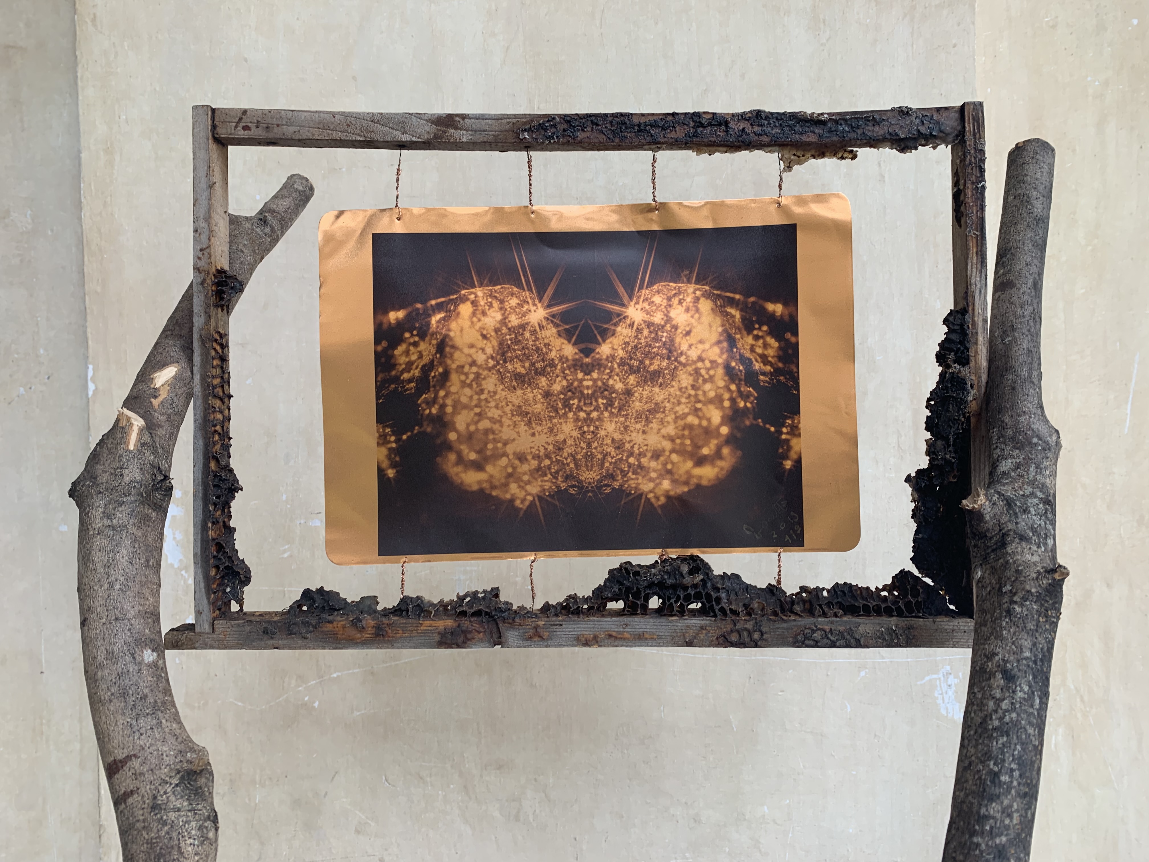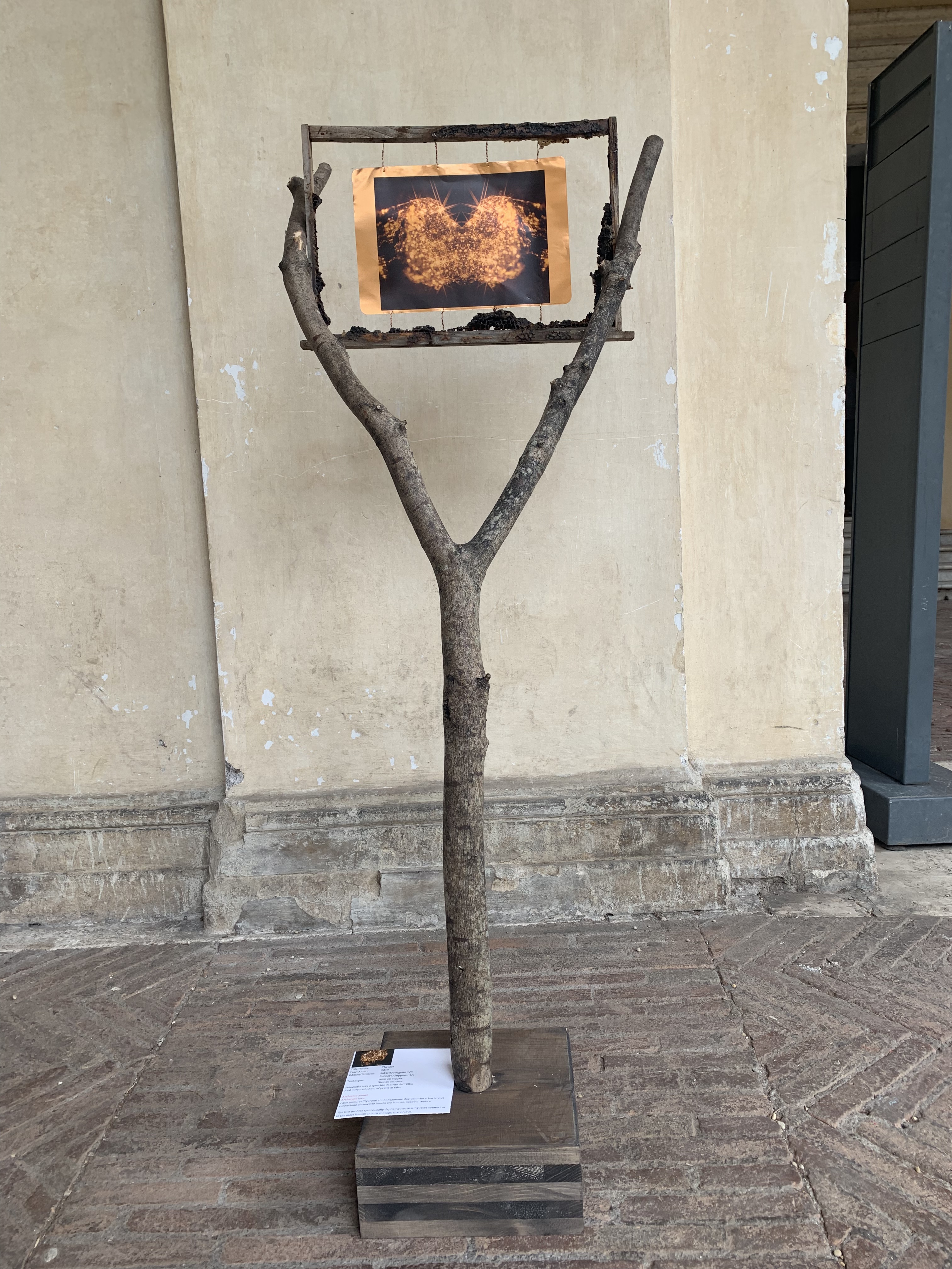 The work is framed with the frame in which the bees produce honey in order to line the jars in which the Etruscan wine is produced
