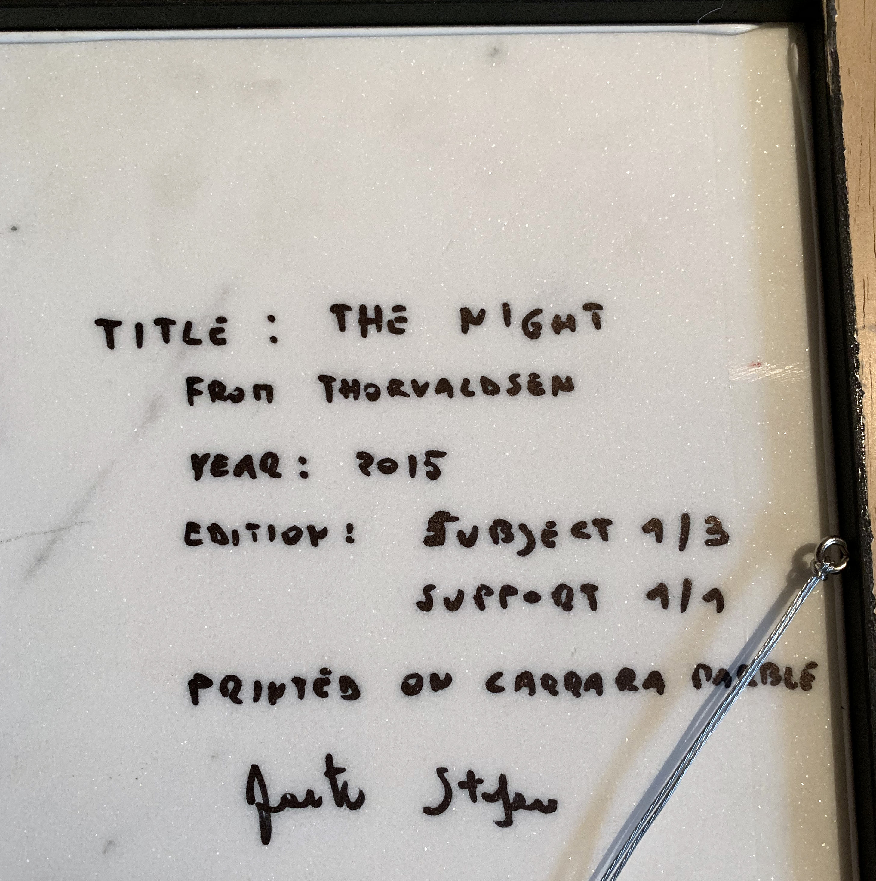CARVING MARBLE WITH PHOTOGRAPHY. THE NIGHT OF BERTEL THORDVALSEN REINTERPRETED BY THE AUTHOR AND PRINTED ON MARBLE AS IF IT WERE CARVED.