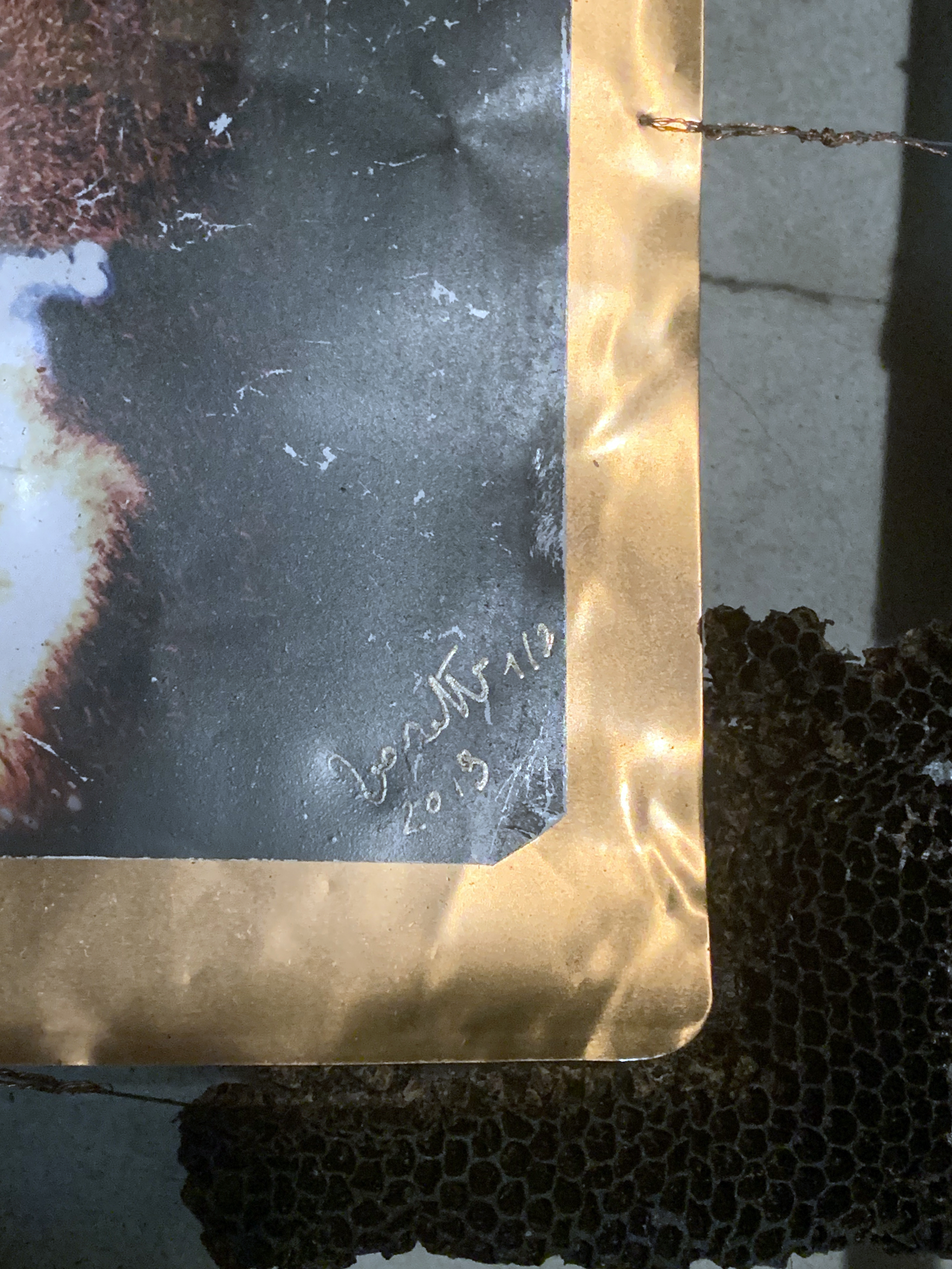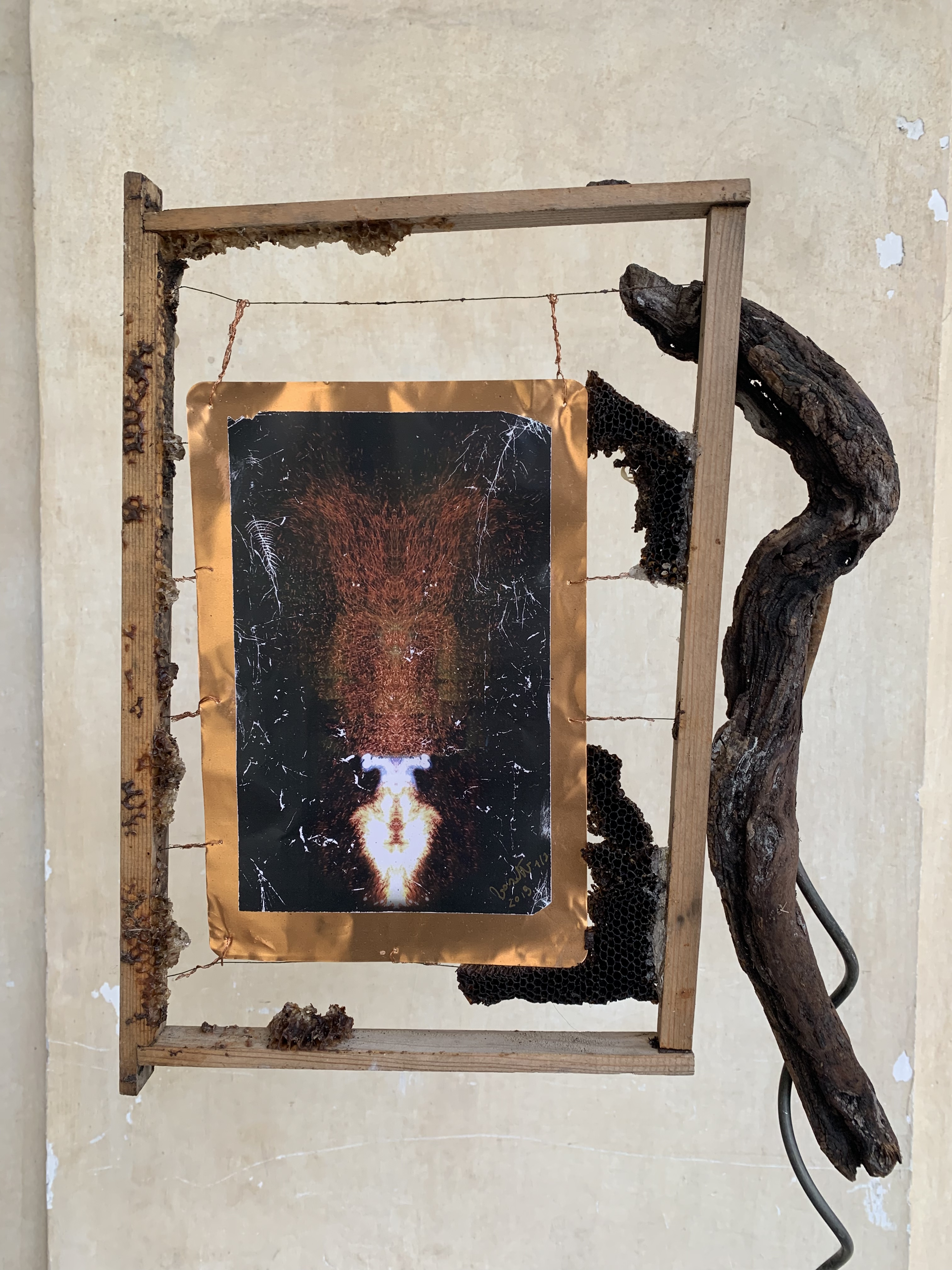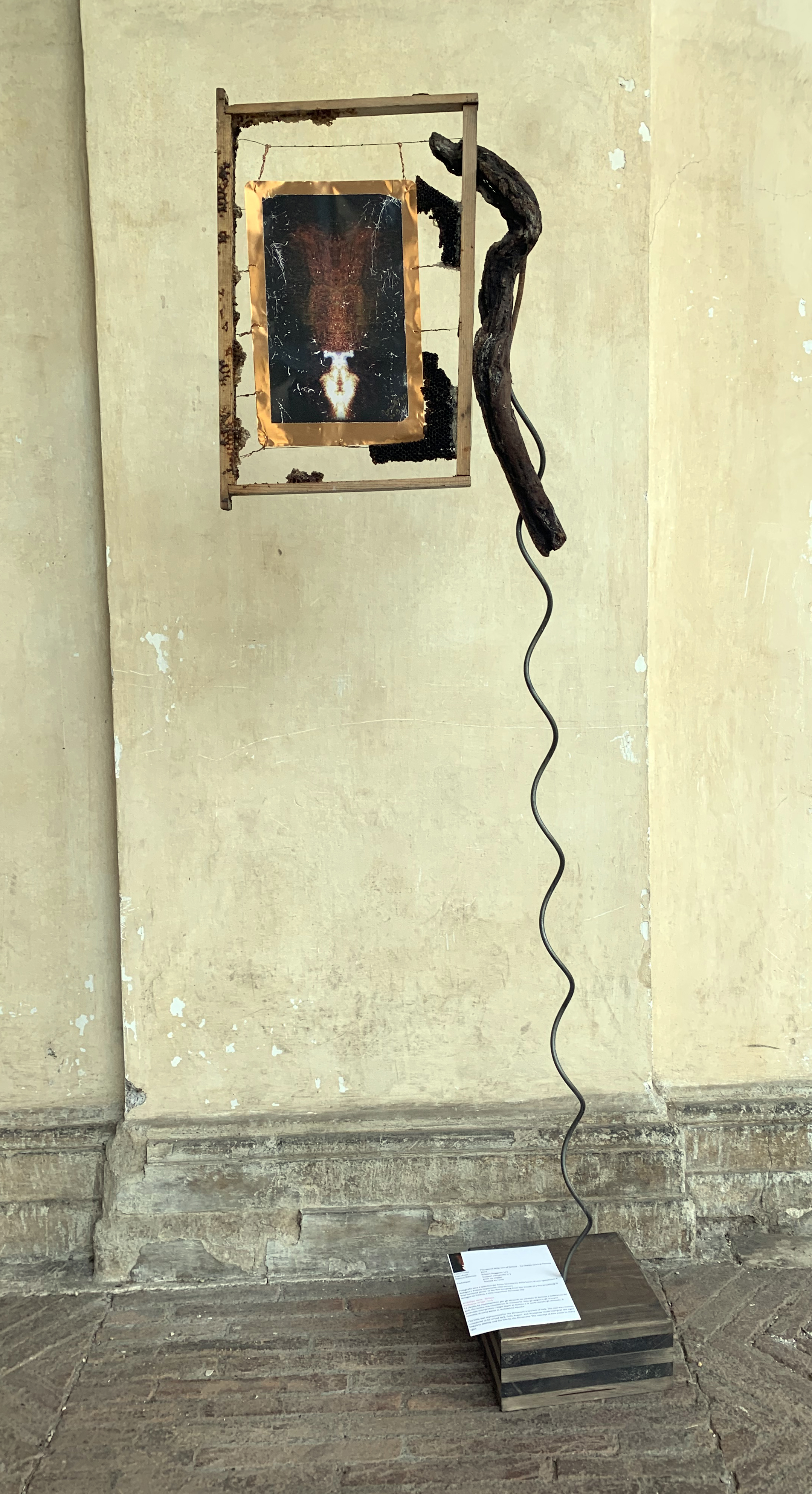 The work is framed with the frame in which the bees produce honey in order to line the jars in which the Etruscan wine is produced