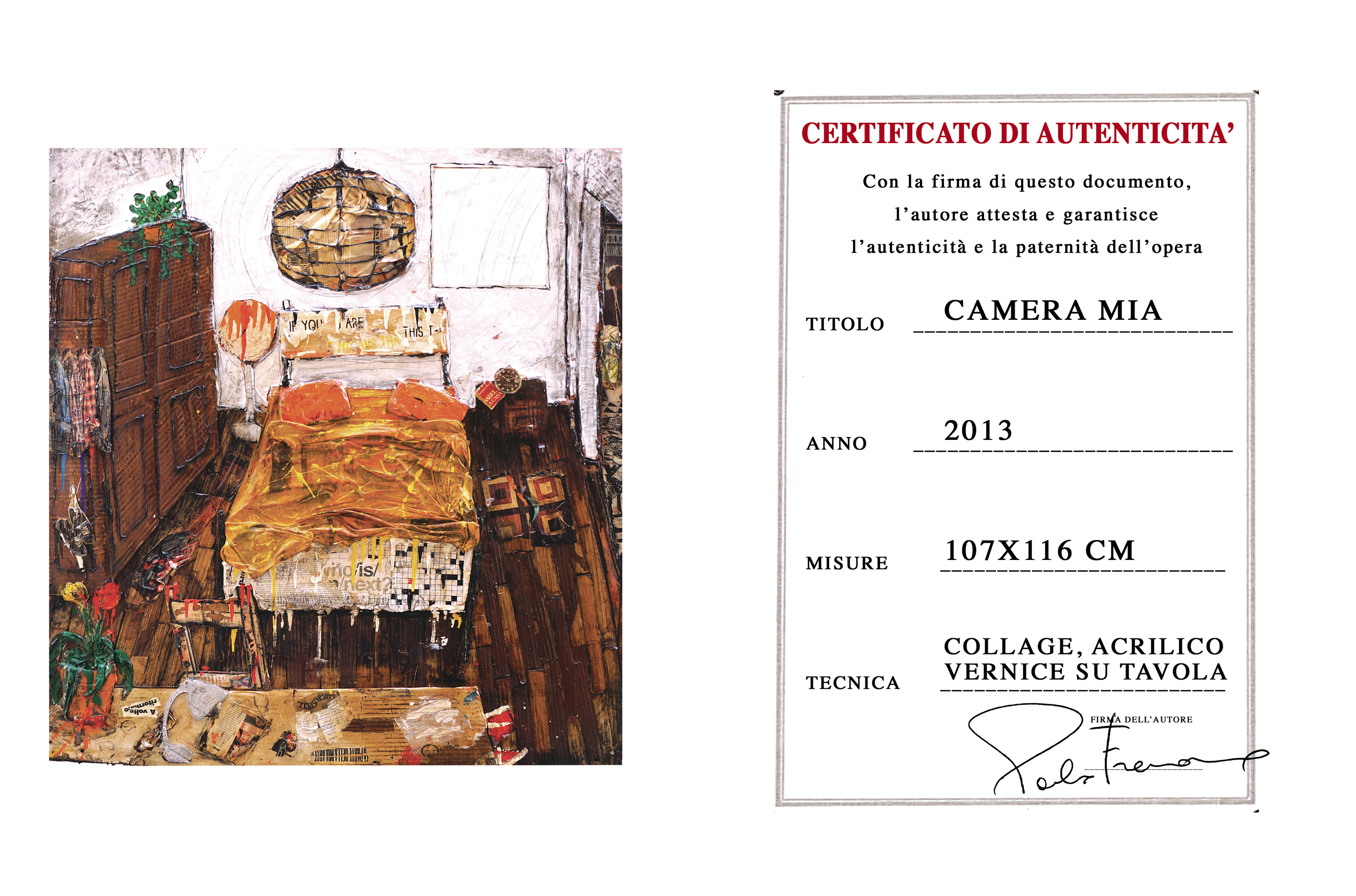 PER PRIMO È IL CAOS “UN DISORDINE MERAVIGLIOSO CHE RACCONTA LA VITA” COME DICHIARA L’ARTISTA STESSO. DA ATTRIBUTO INTIMO DELL’ISPIRAZIONE ARTISTICA A FENOMENO PUBBLICO DELLA VITA MODERNA, IL CAOS È DA INTENDERSI COME SPAZIO GENERATIVO E APERTO, COLMO DI POTENZIALE CREATIVO. DAL CALORE E DAL COLORE DELLE MURA DOMESTICHE, RESE IN UNA PROSPETTIVA PICASSIANA, PIENE DELLA DISORDINATA PRESENZA DI OGGETTI QUOTIDIANI, FRANZOSO INVITA LO SPETTATORE AD UNA PAUSA RIFLESSIVA NECESSARIA AD EVOCARE UN SENSO DI QUIETE E FELICITÀ, INSIEME AD UNA VELATA MALINCONIA (COME SUGGERISCE LA PAROLA “WHO IS NEXT?” AI PIEDI DEL LETTO). SI TRATTA DI UNA ESPLOSIONE DI COLORI, UN QUADRO RICCO DI PARTICOLARI INTERESSANTI CHE EMERGONO UNO PER VOLTA DALL’INSIEME CAOTICO, COME PER ESEMPIO IL LIBRO DI ISABEL ALLENDE “LA CASA DEGLI SPIRITI” SUL COMODINO ALLA DESTRA DEL LETTO. MA SARÀ DAVVERO COSÌ LA CAMERA DI PAOLO? LE SUGGESTIVE ATMOSFERE VISIVE CONTENUTE NELLE OPERE DI PAOLO FRANZOSO HANNO IL POTERE DI RAPIRE LO SGUARDO DELLA PERSONA CHE CI SI TROVA DI FRONTE, DI INCURIOSIRE IL SUO ANIMO E INDURLA A FARE UN VIAGGIO ALL’INTERNO DI QUELLO SQUARCIO DI MONDO DOVE IMMAGINI, COLORI, PAROLE DI VITA, OGGETTI E MATERIALI RICICLATI TENTANO DI SOVRAPPORSI PER USCIRE DALLA TELA STESSA. LE SUE OPERE SI CARATTERIZZANO PER LE LORO “CAOTICHE ATMOSFERE”, IN CUI PERDERSI PER POI RITROVARSI IN QUALCHE ANGOLO DEL QUADRO, NEL RESPIRO SILENZIOSO DEL PROPRIO EQUILIBRIO. IL DONO PIÙ GRANDE CHE POSSIEDE PAOLO FRANZOSO È QUELLO DI SAPER DARE NUOVA VITA ALLE COSE, REINTERPRETANDOLE, CON ENORME SLANCIO CREATIVO. ******************** FIRST OF ALL IT IS CHAOS "A MARVELOUS DISORDER THAT TELLS ABOUT LIFE" AS THE ARTIST HIMSELF DECLARES. FROM AN INTIMATE ATTRIBUTE OF ARTISTIC INSPIRATION TO A PUBLIC PHENOMENON OF MODERN LIFE, THE CHAOS IS TO BE UNDERSTOOD AS A GENERATIVE AND OPEN SPACE FULL OF CREATIVE POTENTIAL. FROM THE WARMTH AND COLOR OF THE HOME, RENDERED IN A PICASSO PERSPECTIVE, FULL OF THE DISORDERLY PRESENCE OF EVERYDAY OBJECTS, FRANZOSO INVITES THE VIEWER TO A REFLECTIVE PAUSE NECESSARY TO EVOKE A SENSE OF QUIET AND HAPPINESS, TOGETHER WITH A VEILED MELANCHOLY (AS SUGGESTED BY THE WORD "WHO IS NEXT?" AT THE FOOT OF THE BED). IT IS AN EXPLOSION OF COLORS, A PICTURE FULL OF INTERESTING DETAILS THAT EMERGE ONE AT A TIME FROM THE CHAOTIC SET, AS FOR EXAMPLE THE BOOK BY ISABEL ALLENDE "THE HOUSE OF THE SPIRITS" ON THE BEDSIDE TABLE TO THE RIGHT OF THE BED. BUT IS PAUL'S BEDROOM REALLY LIKE THAT? THE EVOCATIVE VISUAL ATMOSPHERE CONTAINED IN THE COLLAGES OF PAOLO FRANZOSO, HAVE THE POWER TO ENCHANT THE VIEWER, TO INTRIGUE HIS/HER MIND AND LEAD HIM/HER TO MAKE A WANDER INSIDE THAT PIECE OF WORLD WHERE IMAGES, COLORS, WORDS OF LIFE, OBJECTS AND RECYCLED MATERIALS TRY TO OVERLAP TO COME OUT FROM THE CANVAS ITSELF. HIS ARTWORKS ARE CHARACTERIZED BY THEIR "CHAOTIC ATMOSPHERE", IN WHICH GETTING LOST TO FIND OURSELVES IN SOME CORNER OF THE PICTURE, IN THE SILENT BREATH OF OUR OWN BALANCE. THE GREATEST GIFT THAT PAUL FRANZOSO HAS, IT IS THE ABILITY TO GIVE NEW LIFE TO THINGS, REINTERPRETING THEM, WITH ENORMOUS CREATIVE ENERGY.